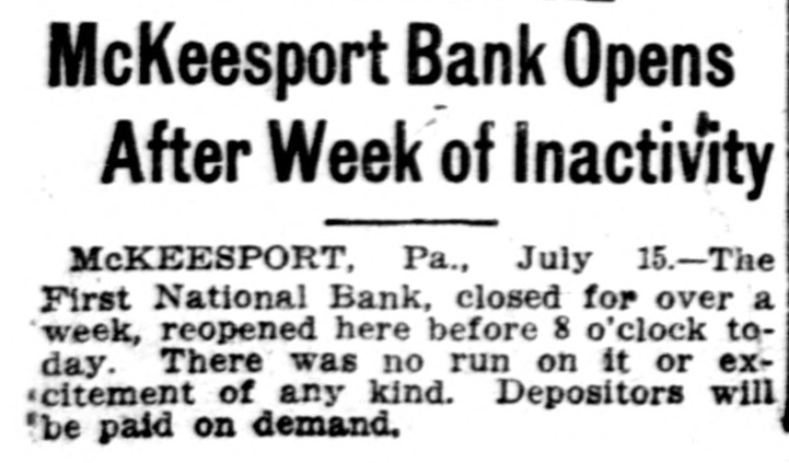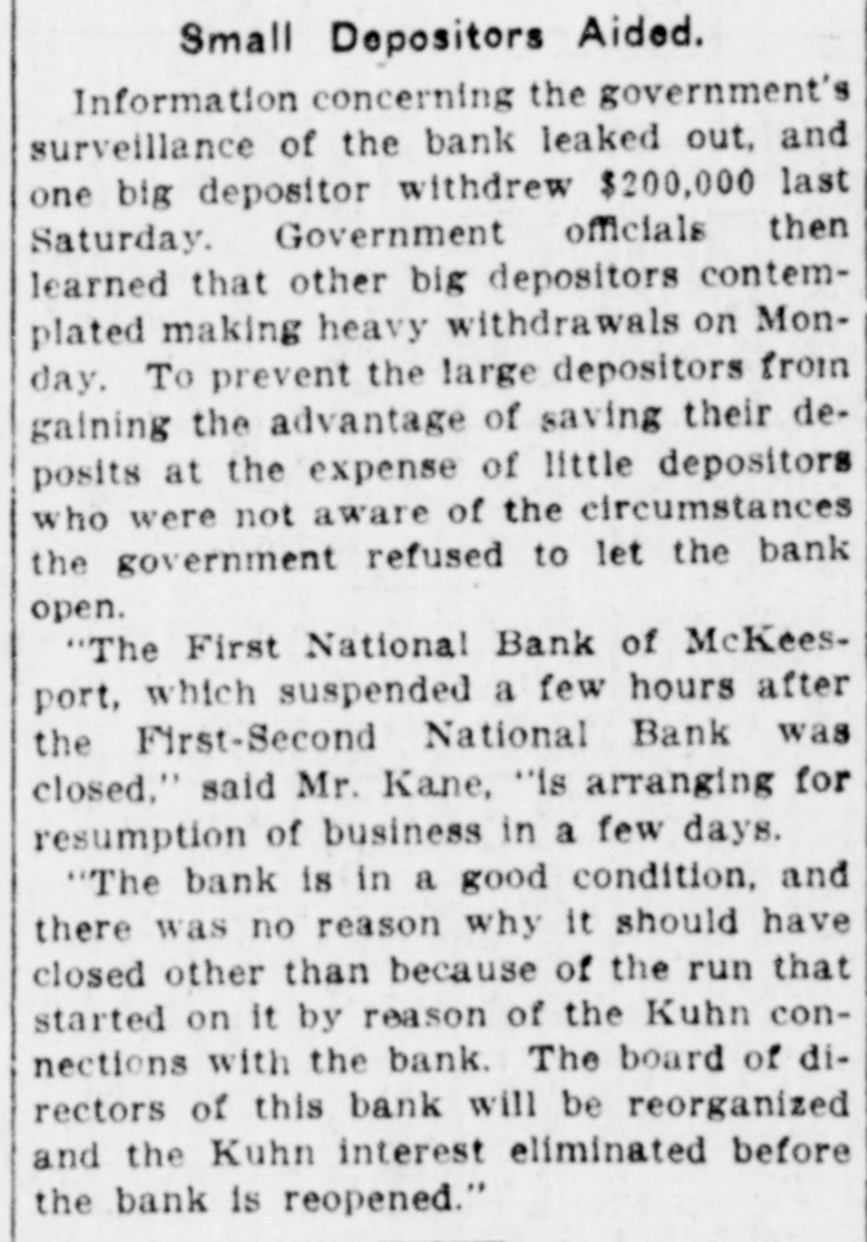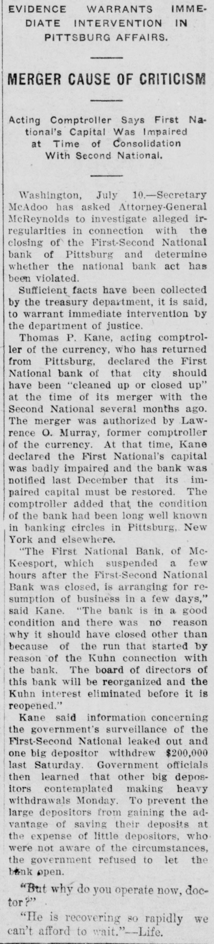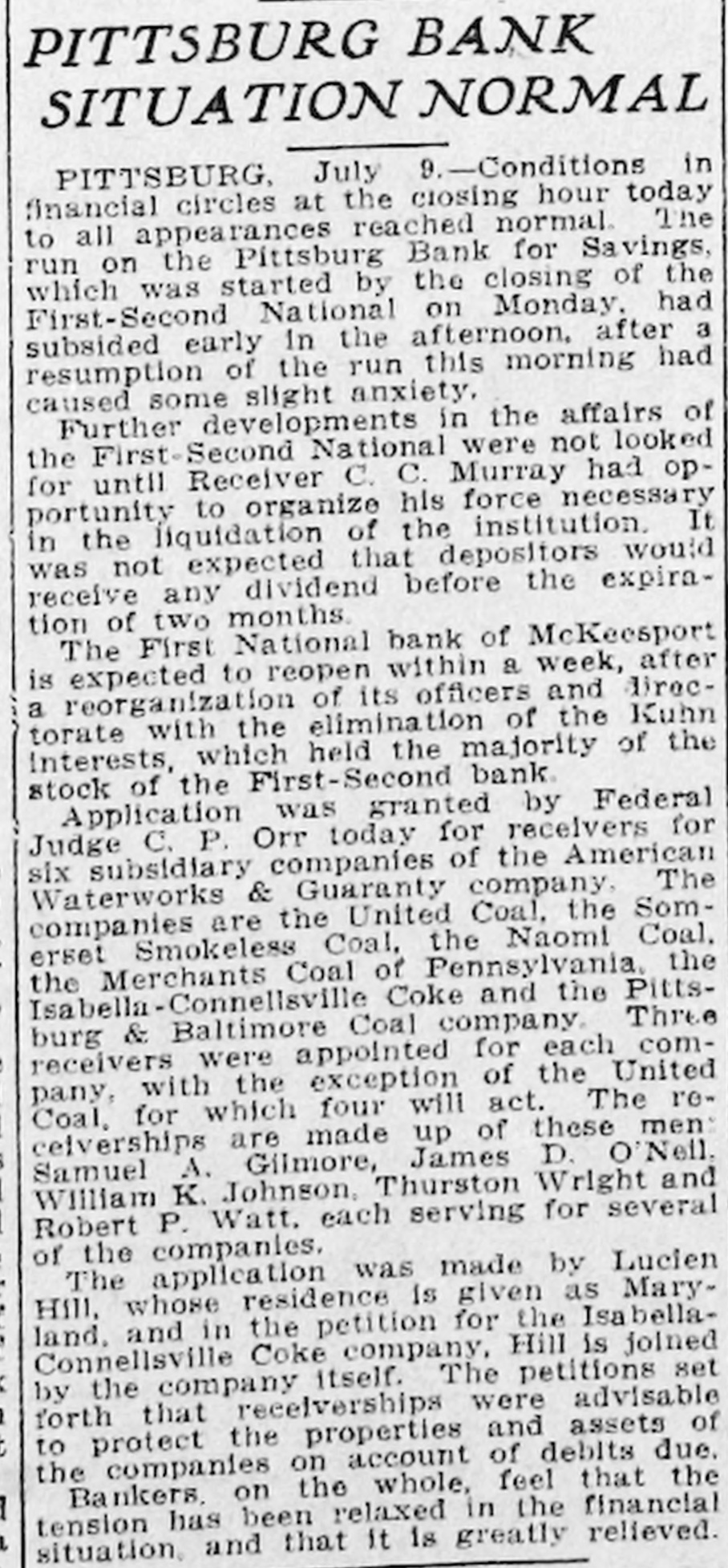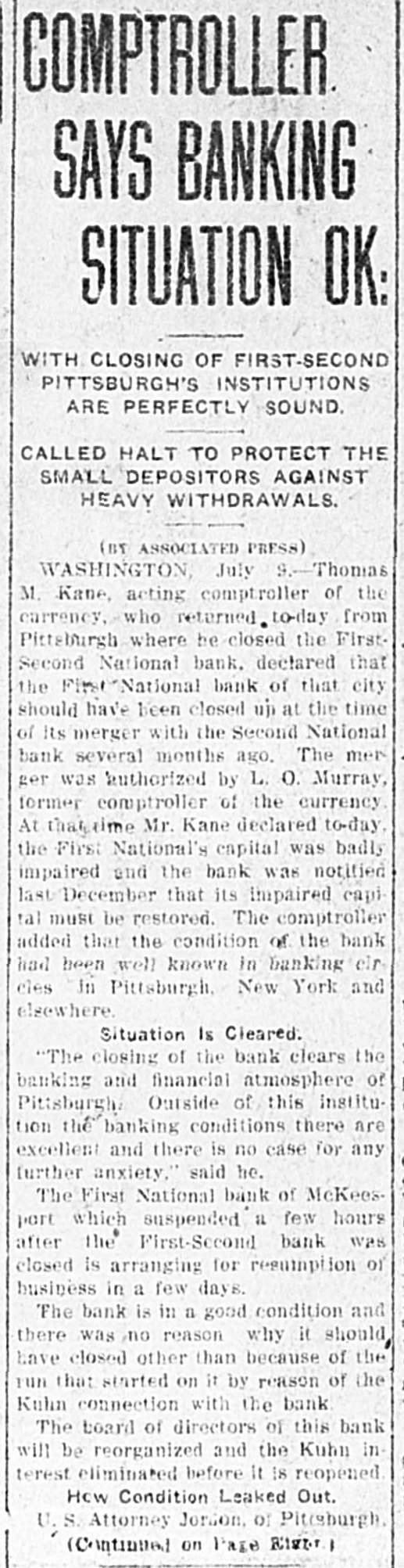 First-Second National of Pittsburgh Forced to Close Doors. SOON FOLLOWED BY TWO OTHERS First National of McKeesport and Bank of J. S. & W. S. Kuhn, Inc., Are Caught-Receiver Appointed for American Water Works and Guarantee Company. Pittsburgh, July 7.-The First-Second National Bank of Pittaburgh, the First National Bank of McKeesport, a neighboring city: the American Water Works and Guarantee Company and the banking-house of J. S. & W. S. Kuhn, Incorporated, of this city, were forced into the hands of receivers to-day through the failure of the first named institution to open its doors this morning. The closing of the First-Second National Bank was ordered by the deputy comptroller of currency, T. P. Kane, after every effort had been made to meet the government requirements as to the legal reserve. The Kuhn banking-house has extensive interests in Irrigation projects throughout the West and in mines and street traction systems throughout Western Pennsylvania, besides being a dominant figure In the American Water Works and Guarantee Company. W. S. Kuhn is president of the FirstSecond National Bank, vice-president and director in the banking-house and vice-president and director of the American Water Works and Guarantee Company, besides a director of the McKeesport bank. J. S. Kuhn is a director of the FirstSecond National Bank, president and director of the American Water Works and Guarantee Company, president and director of the McKeesport bank and chairman of the board of directors of the banking-house. Receivers Asked For. When it was learned that the banks would have to suspend business, steps were taken to protect the American Water Works and Guarantee Company and the Kuhn's banking-house, and application was made in the Federal court this afternoon for receivers for both Institutions. Throughout the day a statement of the banks and affected companies' affairs was awaited with feverish anxiety, but none was forthcoming until tonight. when Mr. Kuhn made a formal statement. No statement of the condition of the bank was obtainable subsequent to the one issued June 4 on the last bank call of the comptroller. The June 4 statement was as follows: Resources: Loans and discounts. $15,704,901.16. Overdrafts, secured and unsecured. $2,571.76. United States bonds to secure circulation, $1,900,000. United States bonds to secure United States deposits, $171,000. United States bonds on hand, $16,000. Premium of united bonds, $10,121.26. Bonds, securities, etc., $8,549,236.95. Banking furniture and lixtures, $176,755.04. Other real estate owned. $4,541,977.65. Due from national banks (not reserve agents). $1,178,987.06 Due from State banks and bankers, $1,316,820.23. Due from approved reserve agents, $4,216,447.75 Checks and other cash items. $160.076.23. Exchanges for clearing house, $693,230.42. Notes of other national banks, $360,000. Fractional paper currency, nickels and cents, $13,237.88. Lawful money reserve in bank, via.: Specie and legal tender notes, $1,S.1.023. Redemption fund with United States Treasury (5 per cent of circulation), 95 per cent. Due from United States treasurer other than 5 per cent redemption fund, $87,500. Total, $38,103,856.39. Other Side of Ledger. Liabilities: Capital stock paid in, $3,400,000. Surplus fund, $1,700,000. Undivided profits, less expenses and taxes paid, $250,068.45. National bank notes outstanding, (Continued on Second Page.)
