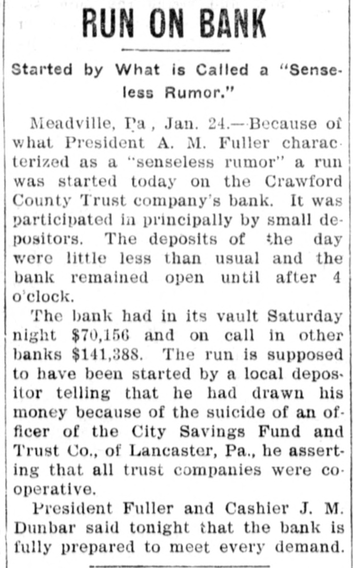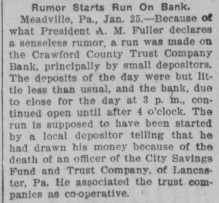 secure their receipt books at the CITIZEN office. and persons making public sales their note books. LOCAL AND GENERAL. One little-two little Three little babies All at the County Home. Two are twine With very white skins. But the black one goes it alone. -Groundhog day. -Will he see his shadow. -Good ice crop this season. -Big party at Great Belt, tonight. -Tuesday week is St. Valentine's day. -The groundhog is taking his annual peep. -Nobody is hankering for six weeks more of winter. -A deer is reported to have been seen in the Pine Tract. -From now on the political liar will work double tarn. -It will be warmer, soon-the campaign has just begun. -The people of Butler are not hankering for a city charter. -Travel on all railroads just at present is exceedingly light. -This is the kind of weather that sends the tramps into jails. -Mars is well represented in town today. on account of a law suit. -An attempt was made to rob the Saxonburg postoffice last week. -The Hutzler Bros. wish to sell their store at Denny's Mills. See adv. -Postmaster Robinson took charge of the Butler postoffice yesterday morn'ing. -A good way to forget your own troubles is to remember the other fellow's. -Three years have passed since the Biddles were killed near ProspectJanuary 81st. -The Elks' Huskin-bee was a great success. the corn was shocked in the centre of the room. -The old-time spelling match is being revived in some places as a popular form of amusement. -Callery had burglars again, last Wednesday night, and some express packages were stolen. -There will be a social in the Sunday School room of Grace Lutheran church, Friday evening. -J. G. & W. Campbell have just received a car load of Cypher Incubators, which give good satisfaction. -The net earnings of the U. S. Steel Corporation for the last quarter of last year were $21,458,734. Isn't that some? New York policeman was at the right spot at the right moment the other day, and a man from a third-story window fell upon him. -They had a blizzard in the Klondike, last week, something extraordina1y; and it was 20 below zero on the top of the Alleghenies the other morning. -Meadville was in the papers, last week. It had a bank-run. A report regarding the Crawford County Trust Co. caused a run on it, but it was soon over. -The chicken show will begin next Wednesday morning, at corner of Main and Cunningham streets, Butler. Over three hundred entries had been made, up to yesterday, and the'competition for the prizes will be strong. -A Butler bar-keep was the first to bid on that four-million dollar diamond lately found in South Africa, but the chances are that Rockefeller will get it It weighs three thousand carats, and then some-or about three pounds. -The frost extended over the Southern States and killed the growing vegetables, which will come higher this spring. The fall of snow, however,was heaviest along the coast, last week, and delayed travel. New York was shut-in for two days. -Six pension papers mailed from Batler to Pension Agent Nesbit in Pittsburg, last month, did not reach their destination. The pensions for the quarter were paid, but new vouchers had to be made out. The management of the Pittsburg postoffice is said to be "on the bum." -People interested in astronomy should know that the two brilliant objects in the western sky these evenings are the planets Venus and Jupiter. V6nus is the farthest west, and is the brightest on account of being comparatively near us; but Jupiter is the whale of the known worlds, and her fifth moon has lately been discovered. -W. D. Bovard of New Hope served on the jury last week and during a visit to our office said that in Slipperyrock creek sulphur water from the mines in the Hilliard Valley has killed off all the fish above the Kiester dam except carp. which it does not affect. At the Hogg dam carp weighing 15 pounds may be ehot. When the dam is frozen thick with ice the big fish crowd to the gate feeding the mill race for air and can be taken out with a garden rake. The sulphur has also had the effect of clarifying the water 80 that the bottom can be plainly seen where the water is ten feet deep. Slipperyrock creek was always famous for its pike; but carp, which destroy the spawn, sulphur water and salt water formed a trio too strong for the big game fish. At rare intervals one is still caught, but never further up stream than the Etna mills