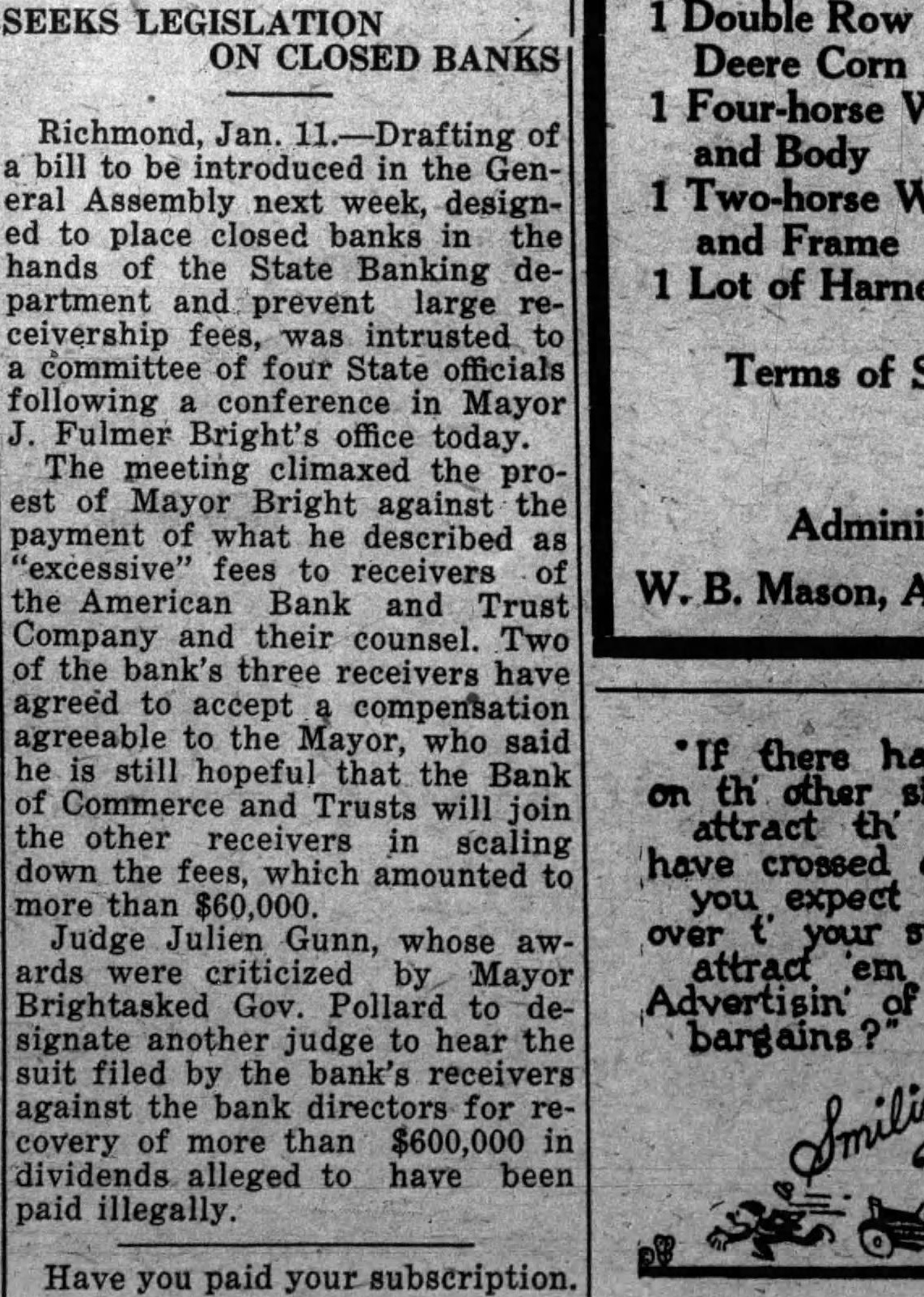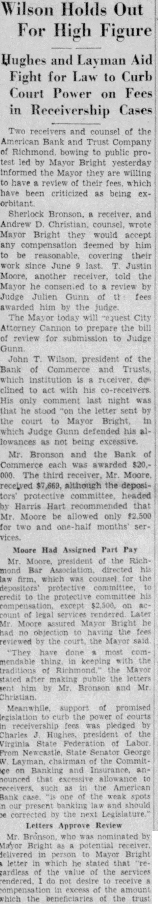 Two and counsel of the American Bank and Trust Company of Richmond bowing to public protest led by Mayor Bright yesterday informed the Mayor they are willing to have of their fees. which have been criticized as being exSherlock Bronson. receiver. and Andrew Christian, counsel, wrote Mayor Bright they would accept any compensation deemed by him be reasonable. covering their work since June last. Justin Moore, another told the Mayor he consented to review by Judge Julien Gunn of th fees awarded him by the judge. The Mayor today will request City Attorney Cannon to prepare the bill review for submission to Judge Gunn. John T. Wilson. president of the Bank of Commerce and Trusts, which institution is receiver. des clined act with his co-receivers His only last night was that he "on the sent by the court to Mayor Bright, in which Judge Gunn defended his allowances as not being excessive.