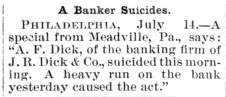 A Banker Suicides. 14.-A PHILADELPHIA, July special from Meadville, Pa., says: "A. F. Dick, of the banking firm of J. R. Dick & Co., suicided this morning. A heavy run on the bank yesterday caused the act."
