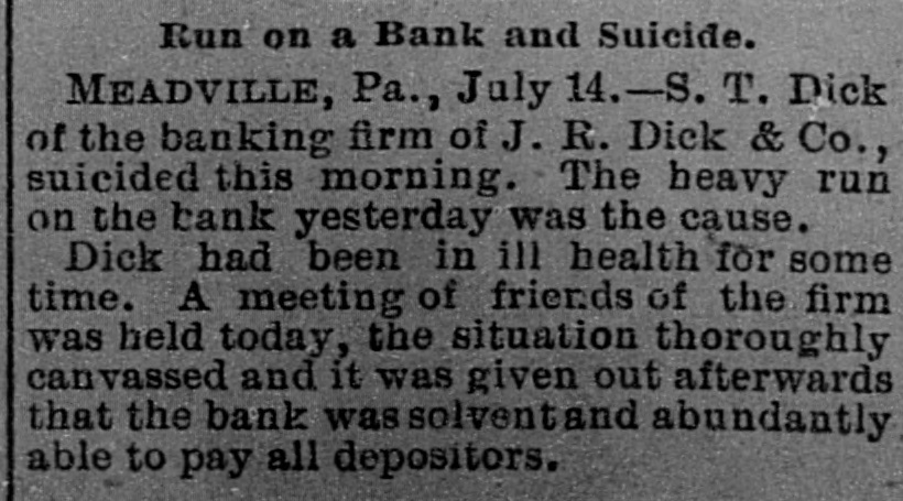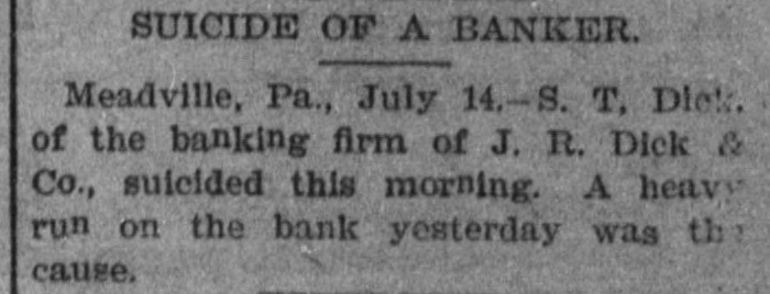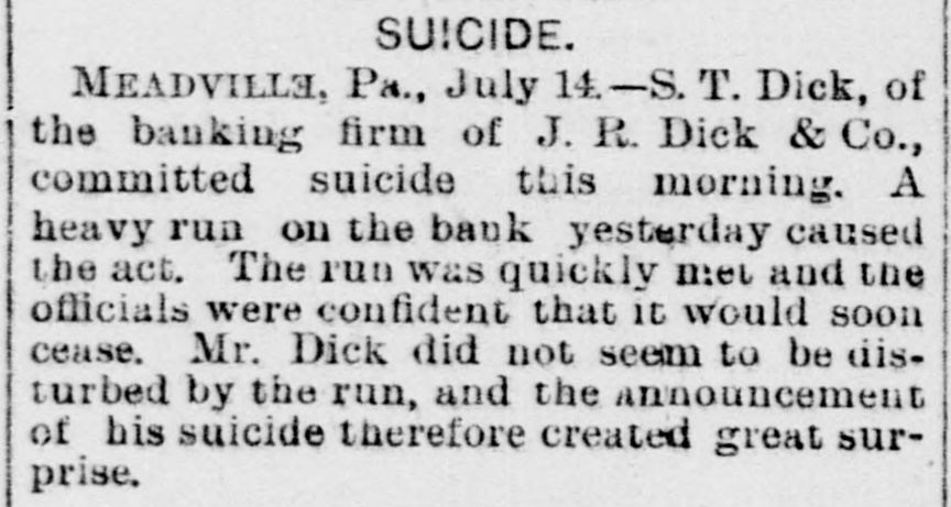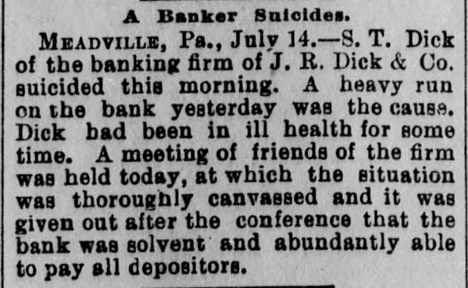 SUICIDE. MEADVILLE, Pa., July 14.-S. T. Dick, of the banking firm of J. R. Dick & Co., committed suicide this morning. A heavy run on the bank yesterday caused the act. The run was quickly met and the officials were confident that it would soon cease. Mr. Dick did not seem to be disturbed by the run, and the Announcement of his suicide therefore created great surprise.
