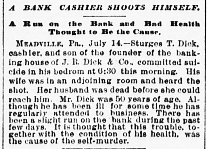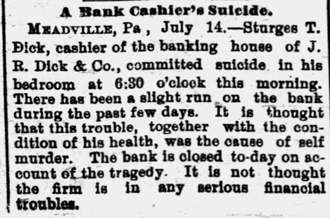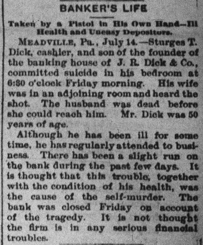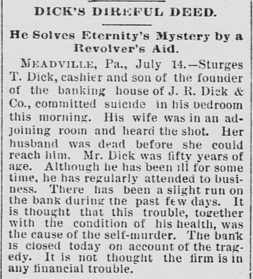 DICK'S DIREFUL DEED. He Solves Eternity's Mystery by a Revolver's Aid. MEADVILLE, Pa., July 14.-Sturges T. Dick, cashier and son of the founder of the banking house of J. R. Dick & Co., committed suicide in his bedroom this morning. His wife was in an adJoining room and heard the shot. Her husband was dead before she could reach him. Mr. Dick was fifty years of age. Although he has been ill for some time, he has regularly attended to business. There has been a slight run on the bank during the past few days. It is thought that this trouble, together with the condition of his health, was the cause of the self-murder. The bank IS closed today on account of the tragedy. It is not thought the firm is in any financial trouble.