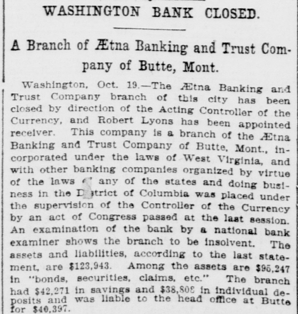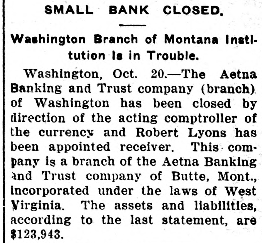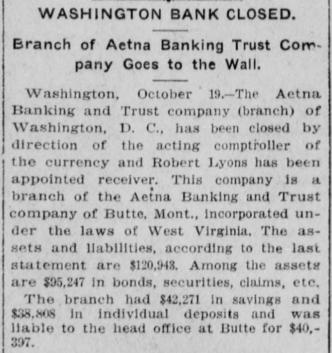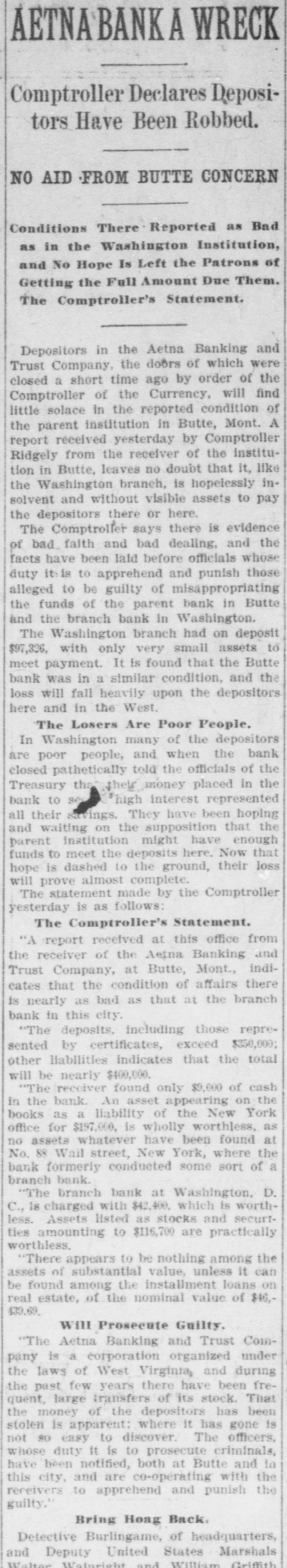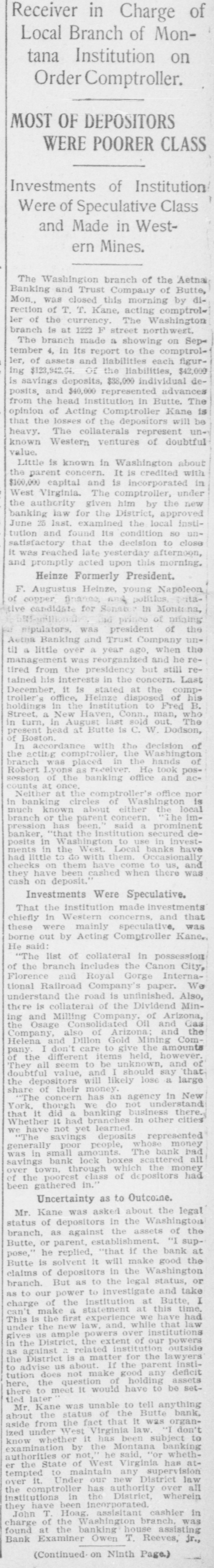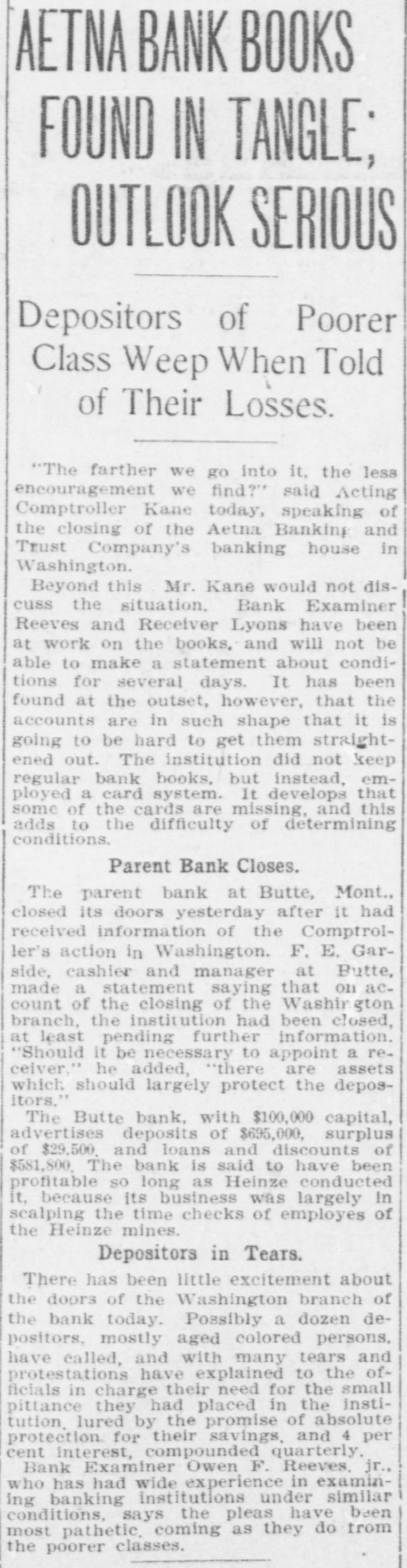 Receiver in Charge of Local Branch of Montana Institution on Order Comptroller. MOST OF DEPOSITORS WERE POORER CLASS Investments of Institution Were of Speculative Class and Made in Western Mines. The Washington branch of the Aetna Banking and Trust Company of Butte, Mon., was closed this morning by direction of T. T. Kane, acting comptrole ler of the currency The Washington branch is at 1222 F street northwest. The branch made a showing on Sep= tember 4, in its report to the comptrol1er, of assets and liabilities each figuring $123,942.04 of the liabilities, $42,000 is savings deposits, $38,000 individual deposits, and $40,000 represented advances from the head institution in Butte. The opinion of Acting Comptroller Kane is that the losses of the depositors will be heavy. The collaterals represent unknown Western ventures of doubtful value. Little is known in Washington about the parent concern. It is credited with $100,000 capital and is incorporated in West Virginia. The comptroller, under the authority given him by the new banking law for the District, approved June 25 last. examined the local institution and found its condition so unsatisfactory that the decision to close it was reached late yesterday afternoon, and promptly acted upon this morning. Heinze Formerly President. F. Augustus Heinze young Napoleon of copper finance, politics ritative candidate for Senato in Montana, ao prince of mining mipulators, was president of the Aetna Banking and Trust Company un= til a little over a year ago, when the management was reorganized and he retired from the presidency but still retained his interests in the concern. Last December it is stated at the comp troller's office. Heinze disposed of his holdings in the institution to Fred B. Street, a New Haven, Conn. man, who in turn, in August last sold out. The present head at Butte is C. W. Dodson, of Boston In accordance with the decision of the acting comptroller, the Washington branch was placed in the hands of Robert Lyons as receiver He took pos= session of the banking office and aconce at counts Neither at the comptroller's office nor in banking circles of Washington is much known about either the local branch OF the parent concern. he impression has said a prominent banker 'that the Institution secured deposits in Washington to use in invest= ments in the West. Local banks have had little to do with them Occasionally checks on them have come to us, and they have been cashed when there was cash on deposit. Investments Were Speculative. That the institution made investments chiefly in Western concerns, and that these were mainly speculative, was borne out by Acting Comptroller Kane. He said: "The list of collateral in possession of the branch includes the Canon City, Florence and Royal Gorge International Railroad Company's paper. We understand the road is unfinished. Also, there is collateral of the Dividend Mining and Milling Company, of Arizona, the Osage Consolidated Oil and Gas Company, also of Arizona: and the Helena and Dillon Gold Mining Company. I don't care to give the amounts of the different items held, however They all seem to be unknown, and of doubtful value, and should say that the depositors will likely lose a large share of their money. "The concern has an agency in New York, though we do not stand that it did banking usiness there. Whether it had branches in other cities we have not yet learned "The savings deposits represented generally poor people, whose money was in small mounts. The bank bad savings bank lock boxes ttered all over town, through which the money of the poorest class of depositors had been gathered in. Uncertainty as to Outcome. Mr. Kane was asked about the legal status of depositors in the Washington branch, as against the assets of the Butte, or parent, establishment "I suppose," he replied "that if the bank at Butte is solvent it will make good the claims of depositors in the Washington branch. But as to the legal status, or as to our power to investigate and take charge of the institution at Butte, I can't make statement at this time. This is the first experience we have had under the new law. and, while that law gives as ample powers over institutions in the District, the extent of our powers as against related institutio outside the District is a matter for the lawyers to advise us about If the parent institution does not make good any deficit here, the question of holding assets there to meet It would have to be settled later Mr. Kane was unable to tell anything about the status of the Butte bank, aside from the fact that It was organized under West Virginia law I don't know whether it has been subject to examination by the Montana banking authorities or not he said, "or whether the State of West Virginia has attempted to maintain any supervision over it. Under our new District law the comptrolle has authority over all institutions in the District wherein they have been orporated John T Hoag, assistant cashier in charge of the Washington branch, was found at the banking house assisting Bank Examiner Owen T. Reeves, jr., (Continued on Ninth Page.)