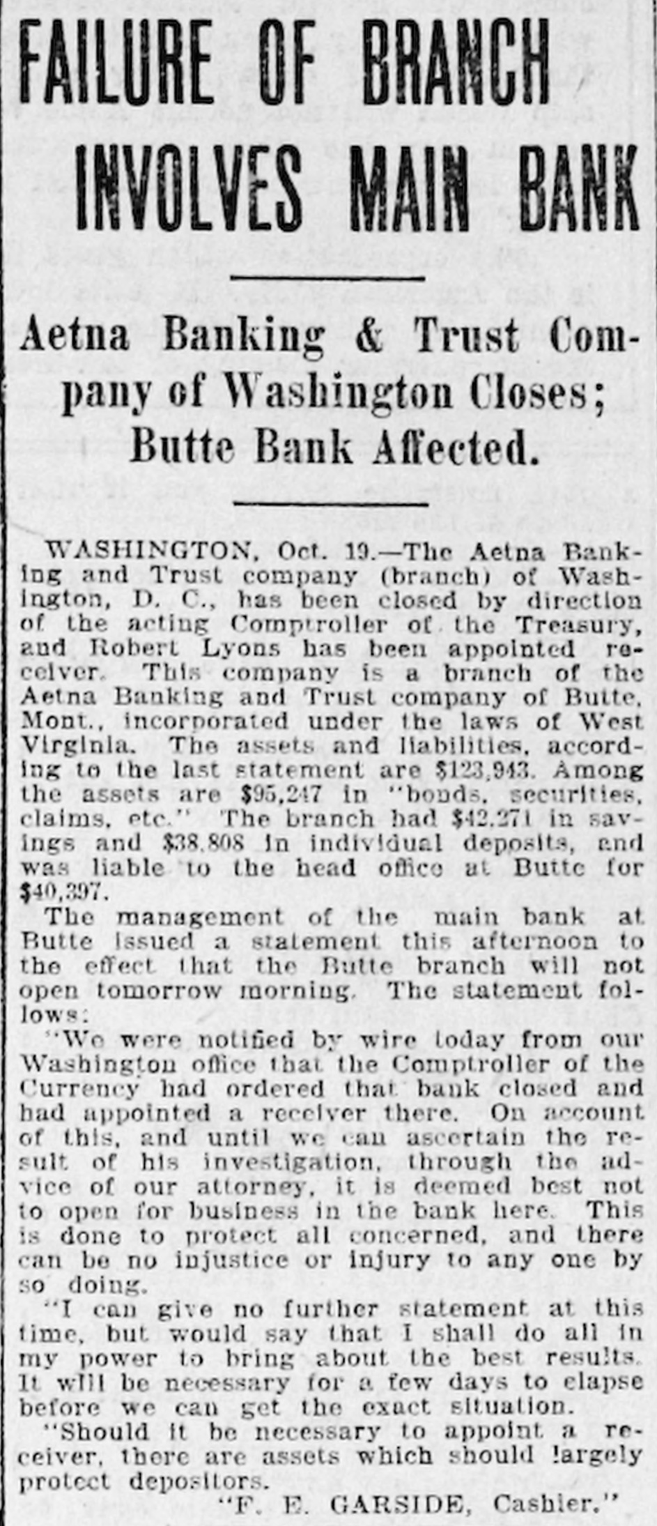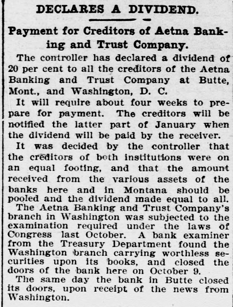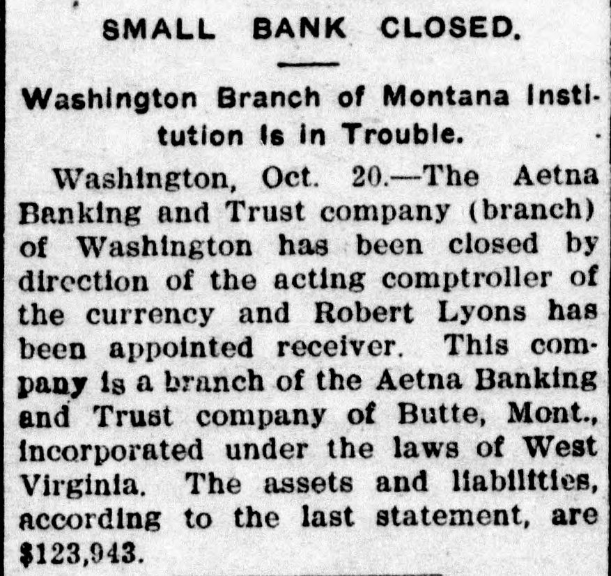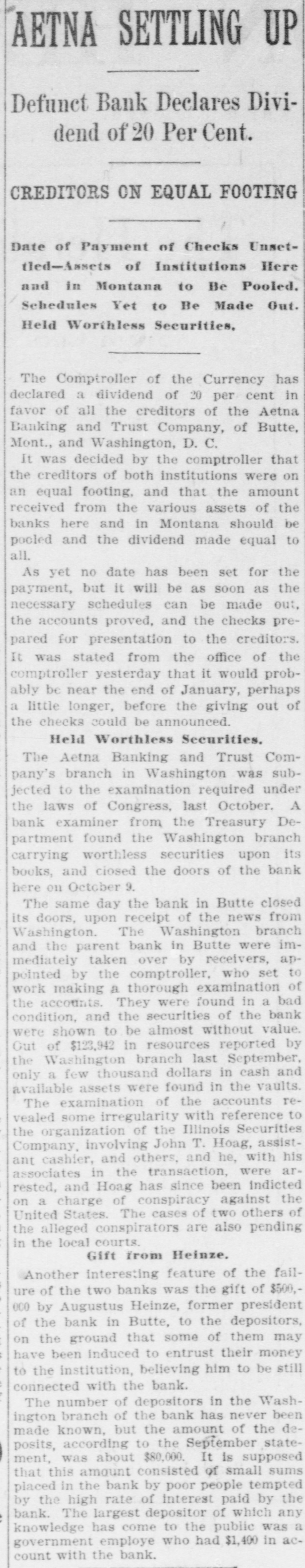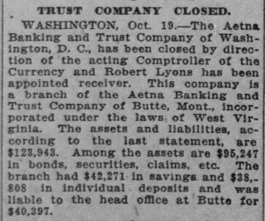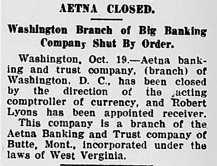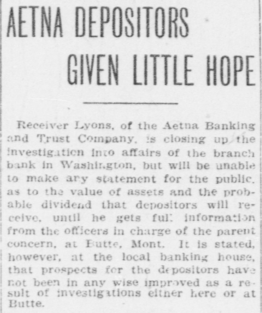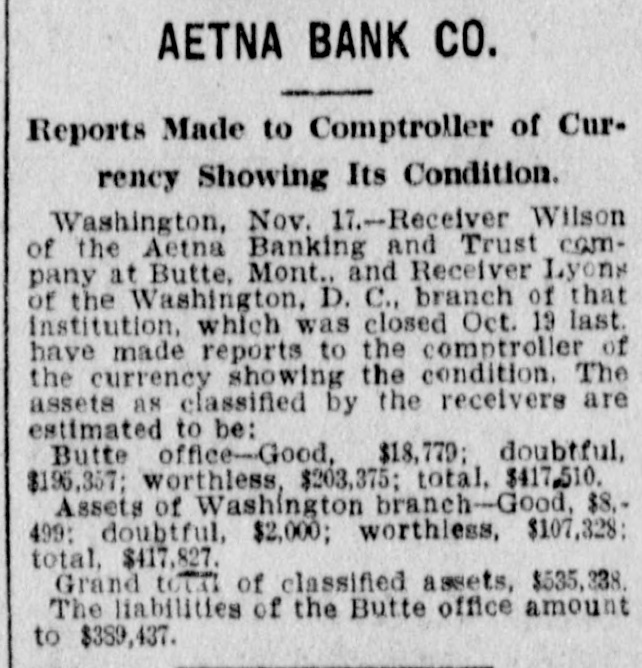 Receiver in Charge of Local Branch of Montana Institution on Order Comptroller. MOST OF DEPOSITORS WERE POORER CLASS Investments of Institution Were of Speculative Class and Made in Western Mines. The Washington branch of the Aetna Banking and Trust Company of Butte, Mon., was closed this morning by direction of T. T. Kane, acting comptrole ler of the currency The Washington branch is at 1222 F street northwest. The branch made a showing on Sep= tember 4, in its report to the comptrol1er, of assets and liabilities each figuring $123,942.04 of the liabilities, $42,000 is savings deposits, $38,000 individual deposits, and $40,000 represented advances from the head institution in Butte. The opinion of Acting Comptroller Kane is that the losses of the depositors will be heavy. The collaterals represent unknown Western ventures of doubtful value. Little is known in Washington about the parent concern. It is credited with $100,000 capital and is incorporated in West Virginia. The comptroller, under the authority given him by the new banking law for the District, approved June 25 last. examined the local institution and found its condition so unsatisfactory that the decision to close it was reached late yesterday afternoon, and promptly acted upon this morning. Heinze Formerly President. F. Augustus Heinze young Napoleon of copper finance, politics ritative candidate for Senato in Montana, ao prince of mining mipulators, was president of the Aetna Banking and Trust Company un= til a little over a year ago, when the management was reorganized and he retired from the presidency but still retained his interests in the concern. Last December it is stated at the comp troller's office. Heinze disposed of his holdings in the institution to Fred B. Street, a New Haven, Conn. man, who in turn, in August last sold out. The present head at Butte is C. W. Dodson, of Boston In accordance with the decision of the acting comptroller, the Washington branch was placed in the hands of Robert Lyons as receiver He took pos= session of the banking office and aconce at counts Neither at the comptroller's office nor in banking circles of Washington is much known about either the local branch OF the parent concern. he impression has said a prominent banker 'that the Institution secured deposits in Washington to use in invest= ments in the West. Local banks have had little to do with them Occasionally checks on them have come to us, and they have been cashed when there was cash on deposit. Investments Were Speculative. That the institution made investments chiefly in Western concerns, and that these were mainly speculative, was borne out by Acting Comptroller Kane. He said: "The list of collateral in possession of the branch includes the Canon City, Florence and Royal Gorge International Railroad Company's paper. We understand the road is unfinished. Also, there is collateral of the Dividend Mining and Milling Company, of Arizona, the Osage Consolidated Oil and Gas Company, also of Arizona: and the Helena and Dillon Gold Mining Company. I don't care to give the amounts of the different items held, however They all seem to be unknown, and of doubtful value, and should say that the depositors will likely lose a large share of their money. "The concern has an agency in New York, though we do not stand that it did banking usiness there. Whether it had branches in other cities we have not yet learned "The savings deposits represented generally poor people, whose money was in small mounts. The bank bad savings bank lock boxes ttered all over town, through which the money of the poorest class of depositors had been gathered in. Uncertainty as to Outcome. Mr. Kane was asked about the legal status of depositors in the Washington branch, as against the assets of the Butte, or parent, establishment "I suppose," he replied "that if the bank at Butte is solvent it will make good the claims of depositors in the Washington branch. But as to the legal status, or as to our power to investigate and take charge of the institution at Butte, I can't make statement at this time. This is the first experience we have had under the new law. and, while that law gives as ample powers over institutions in the District, the extent of our powers as against related institutio outside the District is a matter for the lawyers to advise us about If the parent institution does not make good any deficit here, the question of holding assets there to meet It would have to be settled later Mr. Kane was unable to tell anything about the status of the Butte bank, aside from the fact that It was organized under West Virginia law I don't know whether it has been subject to examination by the Montana banking authorities or not he said, "or whether the State of West Virginia has attempted to maintain any supervision over it. Under our new District law the comptrolle has authority over all institutions in the District wherein they have been orporated John T Hoag, assistant cashier in charge of the Washington branch, was found at the banking house assisting Bank Examiner Owen T. Reeves, jr., (Continued on Ninth Page.)