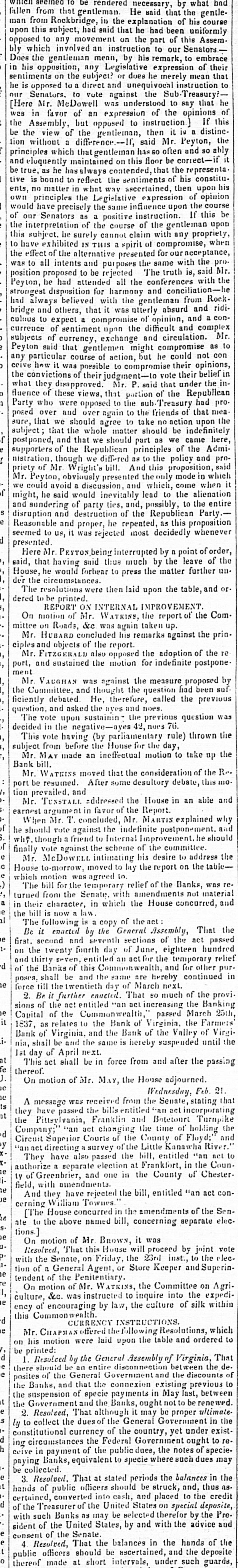 seemed To be rendered necessary, by what gentle- had fallen from that gentleman man from Rockbridge, in the upon this subject, had said that explanation He he said had that been of of this the his course uniformly Assemto movement on the part bly which involved an instruction to our Does the mean, by his remark, to or in any Legislative expression their that subject? opposed his opposition, gentieman any does he merely Senators mean embrace of sentiments opposed on to the direct and unequivocal instruction to he is Senators. to vote against the Sub-Treasury?- that our [Here Mr. McDowell was understood to say of in favor of an expression of the opinions If this was Assembly, but opposed to instruction. distincbe the the view of the gentleman, then it is Peyton, the tion without a difference.--II said Mr. and principles which that gentleman has often correct-if so ably it elequently maintained on this floor be be and true, as he hasalways contended, that the his representa constitutive is bound to reflect the sentiments of then upon his ents, no matter in what way ascertained, of opinion the Legislative expression course have the same infinence upon be of as a positive instruction. our of the course of the would own the interpretation principles Senators precisely gentleman If the propriety, this upon he cannot claim when exhibited IS THIS a spirit of the of the alternative presented proto this have effect subject. surely with compromise, for our acceptance, any with the was to all intents and purposes the same said Mr. position proposed had attended to be rejected all the The conferences truth is, with the Peyton, be disposition for harmony and conciliation-h Rock had believed with the gentleman ridithat it was utterly conbridge strongest always and others, opinion, absurd from and and a compromise of sentiment upon the difficult of exchange and as to said that gentlemen might not con colous currence subjects Peyton to expect currency, compromise circulation. could and complex Mr particular course of action, but he ceive any how it was possible to compromise their opinions, belief in the convictions of their judgment-! vote under their the what they disapproved. Mr P. said that Republican fluence of these views, that portion of the proParty who were opposed to the sub. Treasury had niea posed over and over again to the friends of that the that we should agree to take no action indefinitely upon as should part sure, subject that the whole matter should we be came here, postponed, of and the that Republican we principles of the and Admisupporters nistration. though we differed as to the policy pro- said priety of Mr Wright's bill. And this proposition, in which Mr. Peyton, obviously presented the only mode when it I we could avoid discussion, and which, come alienation might, he said would inevitably lead to the to the entire and sundering of party ties, and, possibly, Party.and destruction of the Republican disruption Reasonable and proper, he repeated, as this proposition whenever seemed to us, it was rejected most decidedly d presented Here Mr. PEYTON being interrupted by a point of of order, the that having said thus much by the leave further unsaid, House, he would forbear to press the matter circumstances. The der the resolutions were then laid upon the table, and ordered to be REPORT printed. ON INTERNAL IMPROVEMENT the ComOn motion of Mr. WATKINS, the report of on Roads, & was again taken up. mittee Mr. HUBARD concluded his remarks against the principles and FITZGERALD objects of also the opposed report. the adoption of the re port, Mr. and sustained the motion for indefinite postponement Mr VAUGHAN was against the measure had proposed been sul by Committee, and thought the question the and noes. the ficiently debated He, therefore, called the previous question. vote and upon asked sustaining ayes the previous question decided The the negative-ayes 42, noes 76. This vote in having (by parliamentary rule) thrown the from before the House for the day, Bank subject Mr MAY made an ineffectual motion to take up the bill. WATEISS moved that the consideration of this the R.. port Mr. be resumed. After some desultory debate, tion Mr. prevailed. TUNSTALI. and addressed the House in an able and argument in favor of the Report. earnest When Mr T. concluded, Mr. MARTIS explained why should vote against the indefinite postponement. he should and if he though friend to Internal Improvement committee. why. vote against the scheme of the e c finally McDOWELL intimating his desire to address table- the e House Mr. to-morrow, moved to lay the report on the which motion was agreed in .) The bill for the temporary relief of the Banks, not material was rea from the Senate. with amendments and e turned in their character, in which the House concurred, the bill is now law. al following is a copy of the act e The by the General Assembly, That the :Be second it enacted and seventh sections of the act hundred passed first. the fourth day of June, eighteen relief on twenty seven, entitled all act for the temporary d the are and same of and the thirty Banks of this Commonwealth, hereby and for continued other pur- in e enacted. force poses, till shall the be !wentieth day of That March so much next. of the provi2. Be of it the further net entitled **an act increasing the Banking 25th, it sions of the Commonwealth passed the March Farmets Capital relates to the Bank of irginia, of Virgi1837, of as Virginia, and the Bank of the Valley until the nia, Bank shall be and the same is hereby suspended of April next. t fe 1st This day act shall be in force from and after the passing e thereof. On motion of Mr. MAY, the House adjourned. Wednesday, Feb. 21. e is was received from the Senate, stating that it A message the bills entitled "an act incorporating they Franklin and Botetourt d the 'an act changing the time of and y Company; Pittsylvania, have passed of the County of Floyd; holding Turnpike River. the Circuit Su