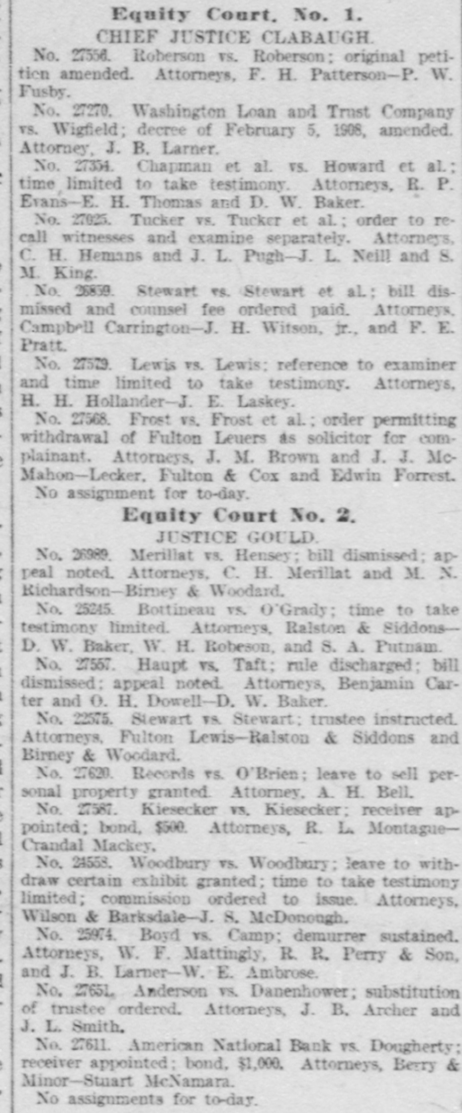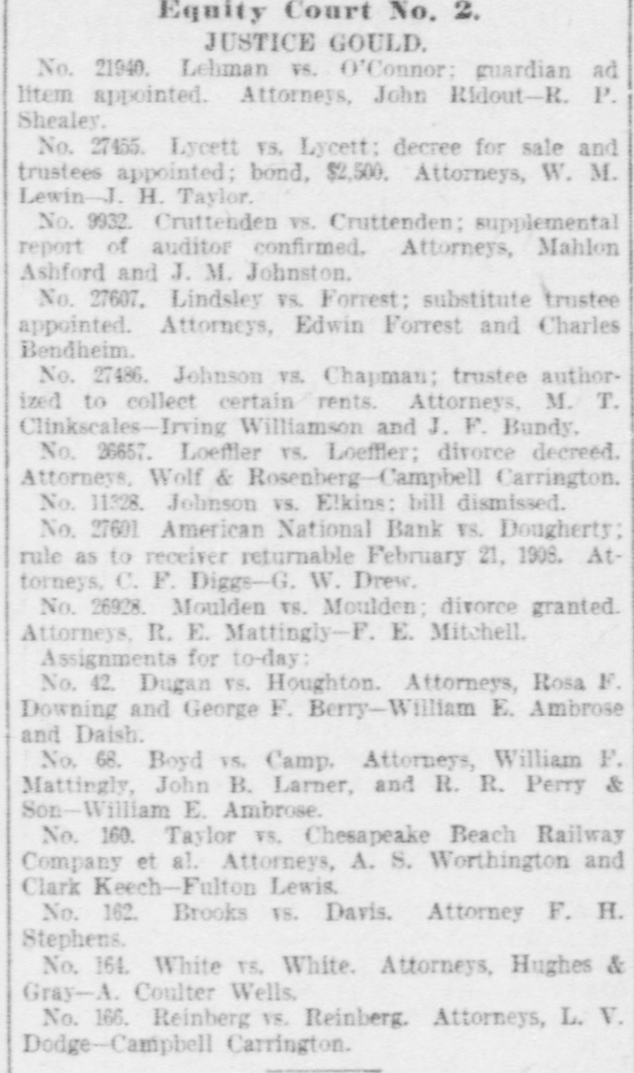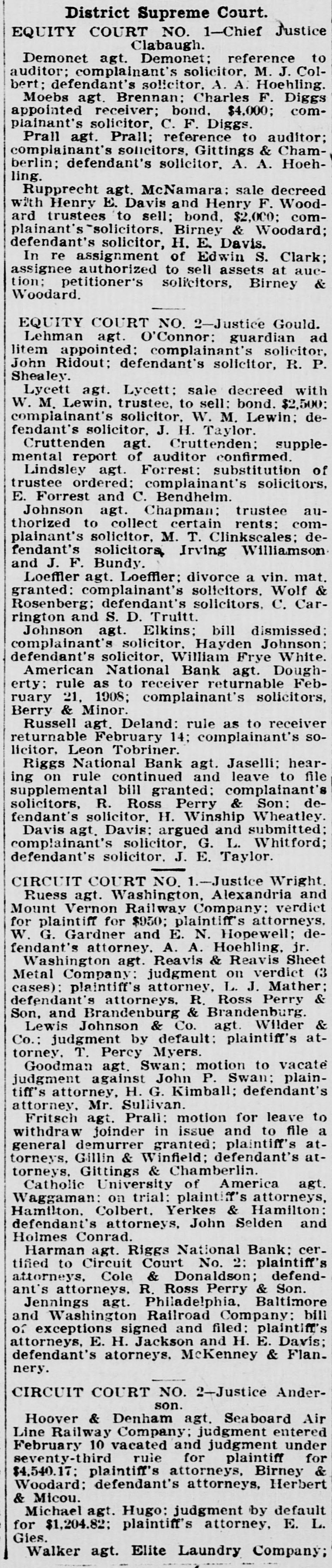 District Supreme Court. EQUITY COURT NO. 1-Chief Justice Clabaugh. Demonet agt. Demonet; reference to auditor; complainant's solicitor. M. J. Colbert; defendant's solicitor. A. A. Hoehling. Moebs agt. Brennan: Charles F. Diggs appointed receiver; bond. $4,000; complainant's solicitor, C. F. Diggs. Prall agt. Prall; reference to auditor; complainant's solicitors, Gittings & Chamberlin; defendant's solicitor, A. A. Hoehling. Rupprecht agt. McNamara: sale decreed with Henry E. Davis and Henry F. Woodard trustees to sell; bond, $2,000; complainant's "solicitors. Birney & Woodard; defendant's solicitor, H. E. Davis. In re assignment of Edwin S. Clark; assignee authorized to sell assets at auction: petitioner's solicitors, Birney & Woodard. EQUITY COURT NO. 2-Justice Gould. Lehman agt. O'Connor: guardian ad litem appointed: complainant's solicitor, John Ridout; defendant's solicitor, R. P. Shealey. Lycett agt. Lycett: sale decreed with W. M. Lewin, trustee, to sell: bond. $2,500: complainant's solicitor. W. M. Lewin; defendant's solicitor. J. H. Taylor. Cruttenden agt. Cruttenden: supplemental report of auditor confirmed. Lindsley agt. Forrest: substitution of trustee ordered: complainant's solicitors, E. Forrest and C. Bendheim. Johnson agt. Chapman: trustee authorized to collect certain rents: complainant's solicitor. M. T. Clinkscales: defendant's solicitors, Irving Williamson and J. F. Bundy. Loeffler agt. Loeffler: divorce a vin. mat. granted: complainant's solicitors. Wolf & Rosenberg: defendant's solicitors. C. Carrington and S. D. Truitt. Johnson agt. Elkins: bill dismissed: complainant's solicitor. Hayden Johnson: defendant's solicitor. William Frye White. American National Bank agt. Dougherty: rule as to receiver returnable February 21, 1908; complainant's solicitors, Berry & Minor. Russell agt. Deland: rule as to receiver returnable February 14; complainant's solicitor. Leon Tobriner. Riggs National Bank agt. Jaselli; hearing on rule continued and leave to file supplemental bill granted: complainant's solicitors, R. Ross Perry & Son: defendant's solicitor. H. Winship Wheatley. Davis agt. Davis: argued and submitted: complainant's solicitor, G. L. Whitford; defendant's solicitor. J. E. Taylor. CIRCUIT COURT NO. 1.-Justice Wright. Ruess agt. Washington, Alexandria and Mount Vernon Railway Company: verdict for plaintiff for $950; plaintiff's attorneys. W. G. Gardner and E. N. Hopewell: defendant's attorney. A. A. Hoehling, jr. Washington agt. Reavis & Reavis Sheet Metal Company: judgment on verdict (3 cases): plaintiff's attorney, L. J. Mather: defendant's attorneys. R. Ross Perry & Son, and Brandenburg & Brandenburg. Lewis Johnson & Co. agt. Wilder & Co.: judgment by default: plaintiff's attorney. T. Percy Myers. Goodman agt. Swan: motion to vacate judgment against John P. Swan: plaintiff's attorney, H. G. Kimball; defendant's attorney, Mr. Sullivan. Fritsch agt. Prali: motion for leave to withdraw joinder in issue and to file a general demurrer granted: plaintiff's attorneys, Gillin & Winfield; defendant's attorneys. Gittings & Chamberlin. Catholic University of America agt. Waggaman: on trial: plaintiff's attorneys, Hamilton. Colbert. Yerkes & Hamilton: defendant's attorneys, John Selden and Holmes Conrad. Harman agt. Riggs National Bank: certified to Circuit Court No. 2: plaintiff's attorneys. Cole & Donaldson; defendant's attorneys. R. Ross Perry & Son. Jennings agt. Philadelphia, Baltimore and Washington Railroad Company: bill of exceptions signed and filed: plaintiff's attorneys, E. H. Jackson and H. E. Davis; defendant's atorneys. McKenney & Flan. nery. CIRCUIT COURT NO. 2-Justice Anderson. Hoover & Denham agt. Seaboard Air Line Railway Company: judgment entered February 10 vacated and judgment under seventy-third rule for plaintiff for $4,540.17: plaintiff's attorneys, Birney & Woodard: defendant's attorneys, Herbert & Micou. Michael agt. Hugo: judgment by default for $1,204.82; plaintiff's attorney, E. L. Gies. Walker agt. Elite Laundry Company;
