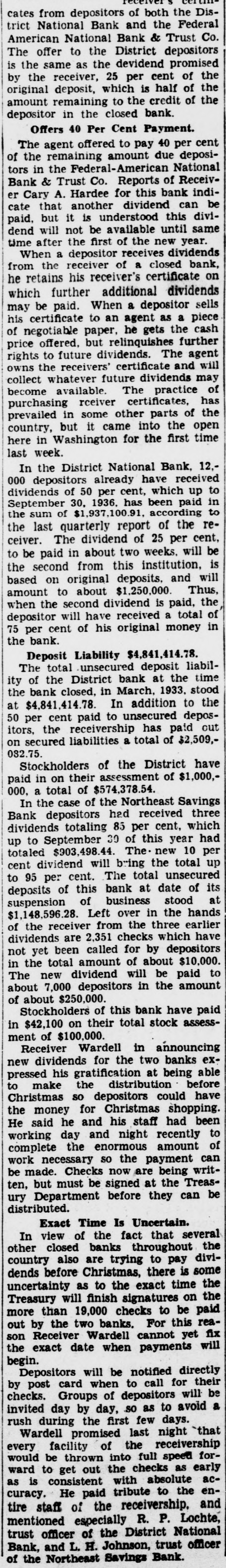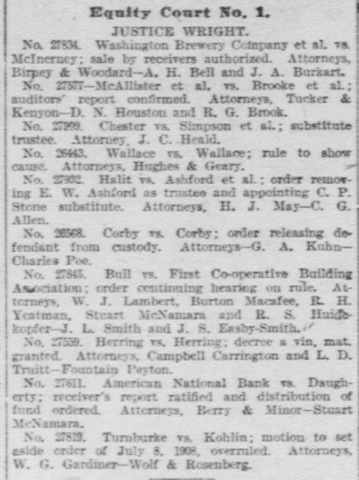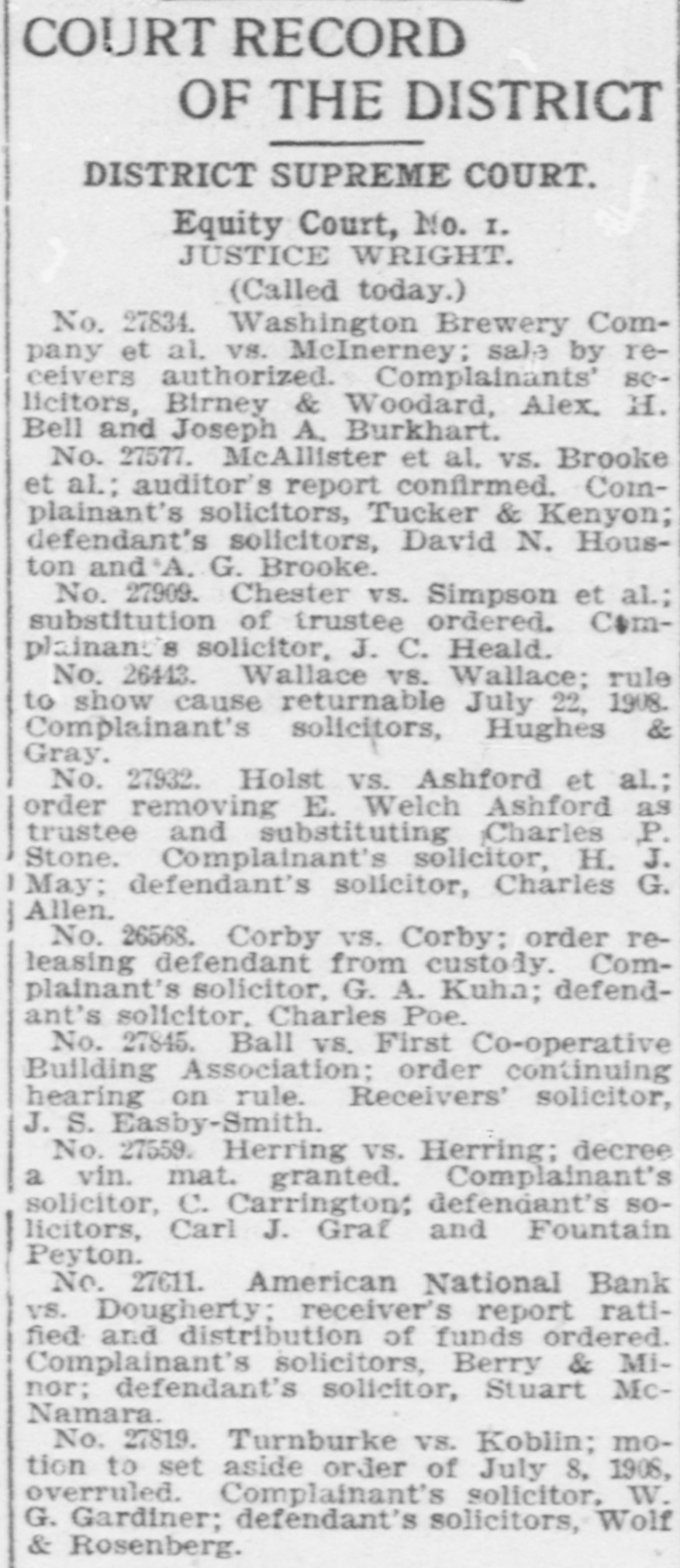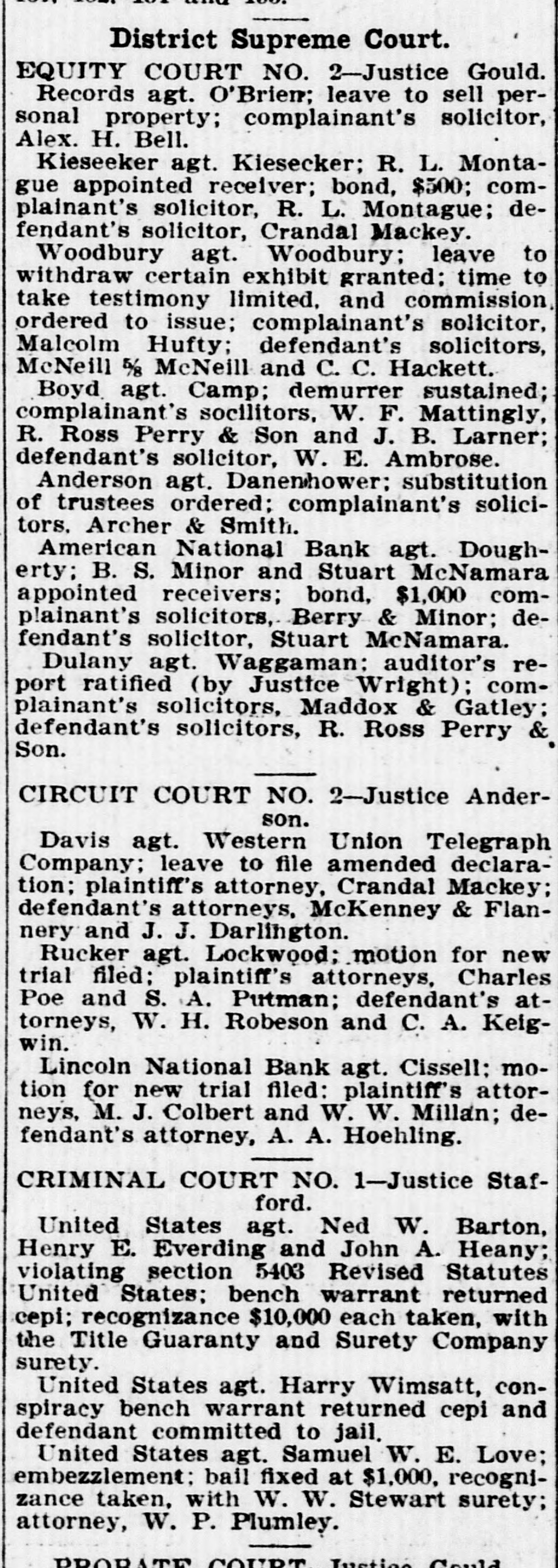 District Supreme Court. EQUITY COURT NO. 1-Chief Justice Clabaugh. Demonet agt. Demonet; reference to auditor; complainant's solicitor. M. J. Colbert; defendant's solicitor. A. A. Hoehling. Moebs agt. Brennan: Charles F. Diggs appointed receiver; bond. $4,000; complainant's solicitor, C. F. Diggs. Prall agt. Prall; reference to auditor; complainant's solicitors, Gittings & Chamberlin; defendant's solicitor, A. A. Hoehling. Rupprecht agt. McNamara: sale decreed with Henry E. Davis and Henry F. Woodard trustees to sell; bond, $2,000; complainant's "solicitors. Birney & Woodard; defendant's solicitor, H. E. Davis. In re assignment of Edwin S. Clark; assignee authorized to sell assets at auction: petitioner's solicitors, Birney & Woodard. EQUITY COURT NO. 2-Justice Gould. Lehman agt. O'Connor: guardian ad litem appointed: complainant's solicitor, John Ridout; defendant's solicitor, R. P. Shealey. Lycett agt. Lycett: sale decreed with W. M. Lewin, trustee, to sell: bond. $2,500: complainant's solicitor. W. M. Lewin; defendant's solicitor. J. H. Taylor. Cruttenden agt. Cruttenden: supplemental report of auditor confirmed. Lindsley agt. Forrest: substitution of trustee ordered: complainant's solicitors, E. Forrest and C. Bendheim. Johnson agt. Chapman: trustee authorized to collect certain rents: complainant's solicitor. M. T. Clinkscales: defendant's solicitors, Irving Williamson and J. F. Bundy. Loeffler agt. Loeffler: divorce a vin. mat. granted: complainant's solicitors. Wolf & Rosenberg: defendant's solicitors. C. Carrington and S. D. Truitt. Johnson agt. Elkins: bill dismissed: complainant's solicitor. Hayden Johnson: defendant's solicitor. William Frye White. American National Bank agt. Dougherty: rule as to receiver returnable February 21, 1908; complainant's solicitors, Berry & Minor. Russell agt. Deland: rule as to receiver returnable February 14; complainant's solicitor. Leon Tobriner. Riggs National Bank agt. Jaselli; hearing on rule continued and leave to file supplemental bill granted: complainant's solicitors, R. Ross Perry & Son: defendant's solicitor. H. Winship Wheatley. Davis agt. Davis: argued and submitted: complainant's solicitor, G. L. Whitford; defendant's solicitor. J. E. Taylor. CIRCUIT COURT NO. 1.-Justice Wright. Ruess agt. Washington, Alexandria and Mount Vernon Railway Company: verdict for plaintiff for $950; plaintiff's attorneys. W. G. Gardner and E. N. Hopewell: defendant's attorney. A. A. Hoehling, jr. Washington agt. Reavis & Reavis Sheet Metal Company: judgment on verdict (3 cases): plaintiff's attorney, L. J. Mather: defendant's attorneys. R. Ross Perry & Son, and Brandenburg & Brandenburg. Lewis Johnson & Co. agt. Wilder & Co.: judgment by default: plaintiff's attorney. T. Percy Myers. Goodman agt. Swan: motion to vacate judgment against John P. Swan: plaintiff's attorney, H. G. Kimball; defendant's attorney, Mr. Sullivan. Fritsch agt. Prali: motion for leave to withdraw joinder in issue and to file a general demurrer granted: plaintiff's attorneys, Gillin & Winfield; defendant's attorneys. Gittings & Chamberlin. Catholic University of America agt. Waggaman: on trial: plaintiff's attorneys, Hamilton. Colbert. Yerkes & Hamilton: defendant's attorneys, John Selden and Holmes Conrad. Harman agt. Riggs National Bank: certified to Circuit Court No. 2: plaintiff's attorneys. Cole & Donaldson; defendant's attorneys. R. Ross Perry & Son. Jennings agt. Philadelphia, Baltimore and Washington Railroad Company: bill of exceptions signed and filed: plaintiff's attorneys, E. H. Jackson and H. E. Davis; defendant's atorneys. McKenney & Flan. nery. CIRCUIT COURT NO. 2-Justice Anderson. Hoover & Denham agt. Seaboard Air Line Railway Company: judgment entered February 10 vacated and judgment under seventy-third rule for plaintiff for $4,540.17: plaintiff's attorneys, Birney & Woodard: defendant's attorneys, Herbert & Micou. Michael agt. Hugo: judgment by default for $1,204.82; plaintiff's attorney, E. L. Gies. Walker agt. Elite Laundry Company;