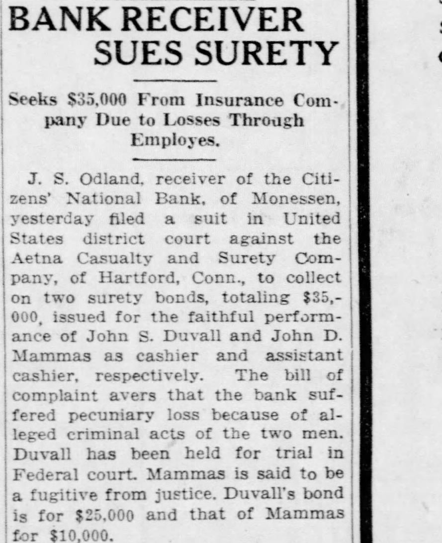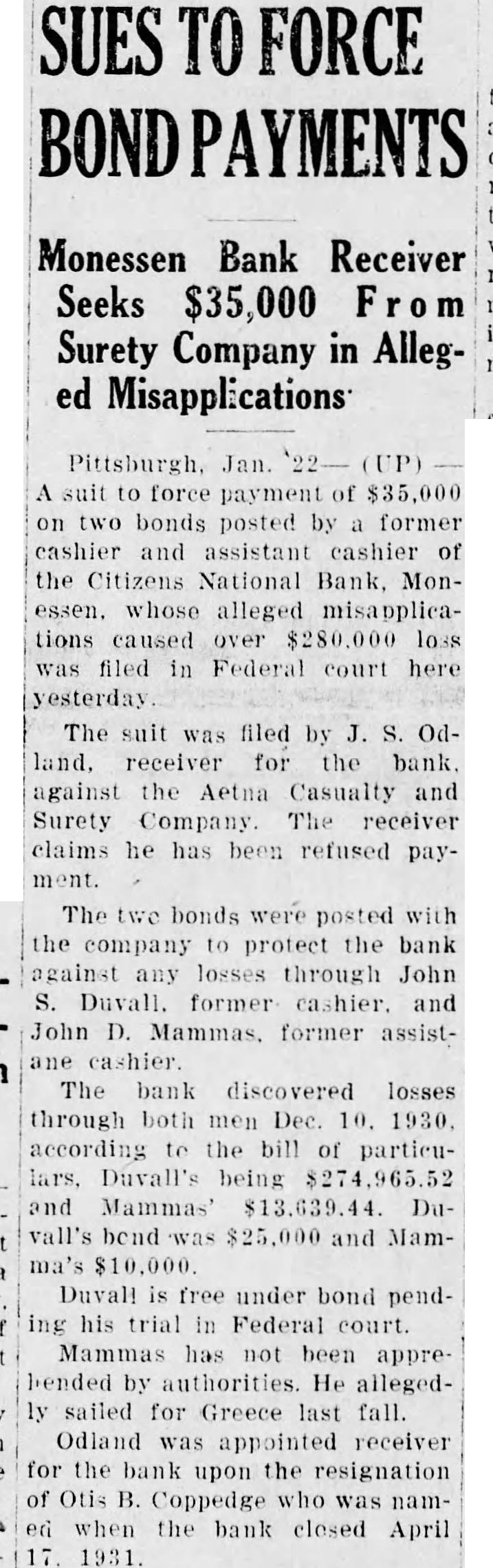 FORCE Monessen Bank Receiver Seeks $35,000 Surety Company in Alleged Misapplications payment of bonds posted former cashier and assistant cashier of the Citizens National Monessen. whose alleged misapplications caused loss filed in Federal court here yesterday The suit was filed by land. receiver for the bank. against the Aetna Casualty and Surety Company The receiver claims he has been refused bonds were posted with the company protect the bank against any losses through John former cashier. and John Mammas. former assistcashier. The bank discovered losses through both men Dec. 10. 1930 according the bill of partieuDuvall's being and Mammas' vall's and Duvall free under bond pendhis trial Federal court. Mammas has not been apprebended by authorities. He allegedsailed for Greece last fall. Odland was appointed receiver for the bank upon the resignation Coppedge when the bank closed April 1931.