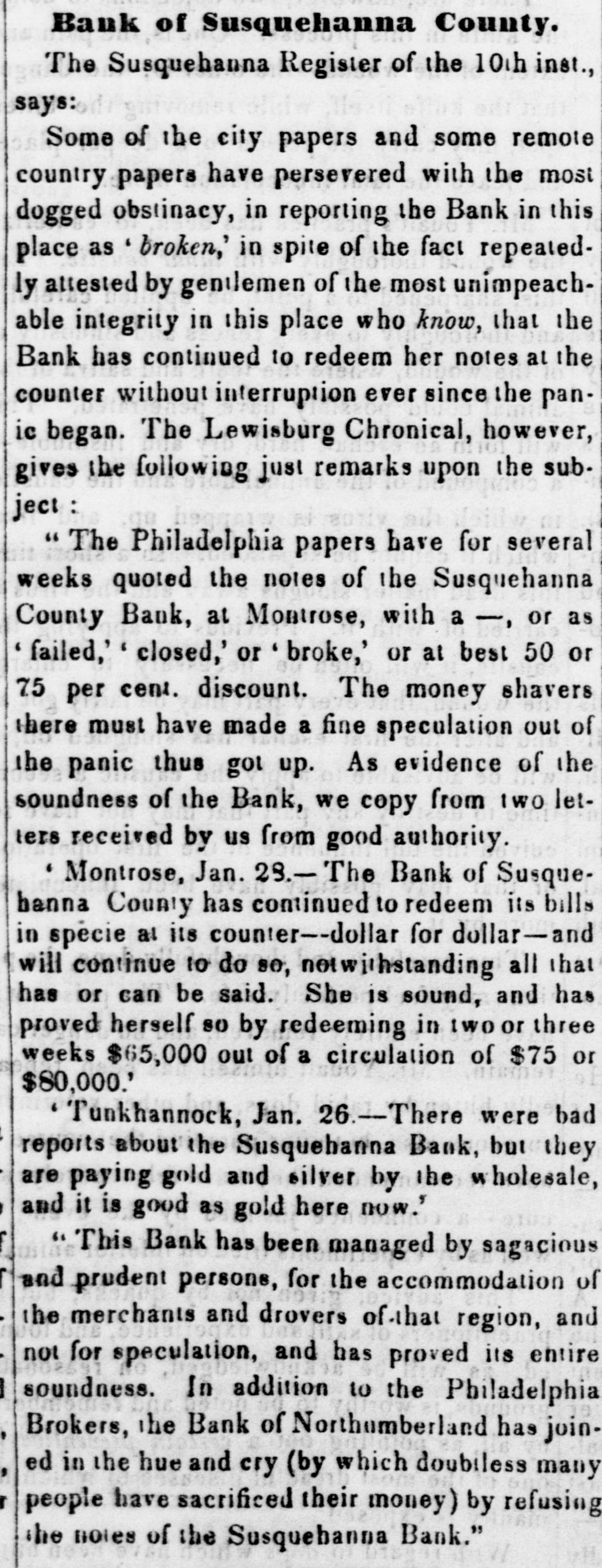 Bank of Susquehanna County. The Susquehanna Register of the 10th inst., says: Some of the city papers and some remote country papers have persevered with the most dogged obstinacy, in reporting the Bank in this place as 'broken,' in spite of the fact repeatedly attested by gentlemen of the most unimpeachable integrity in this place who know, that the Bank has continued to redeem her notes at the counter without interruption ever since the panic began. The Lewisburg Chronical, however, gives the following just remarks upon the subject "The Philadelphia papers have for several weeks quoted the notes of the Susquehanna County Bank, at Montrose, with a -, or as failed,' closed," or 'broke,' or at best 50 or 75 per cent. discount. The money shavers there must have made a fine speculation out of the panic thus got up. As evidence of the soundness of the Bank, we copy from two letters received by us from good authority. Montrose, Jan. 23.-The Bank of Susquebanna County has continued to redeem its bills in specie al its counter--dollar for dollar-and will continue to do so, notwithstanding all that has or can be said. She is sound, and has proved herself so by redeeming in two or three weeks $65,000 out of a circulation of $75 or $80,000.' Tunkhannock, Jan. 26.--There were bad reports about the Susquehanna Bank, but they are paying gold and silver by the wholesale, and it is good as gold here now.' This Bank has been managed by sagacious and prudent persone, for the accommodation of the merchants and drovers of that region, and not for speculation, and has proved its entire soundness. In addition to the Philadelphia Brokers, the Bank of Northumberland has joined in the hue and cry (by which doubless many people have sacrificed their money) by refusing the notes of the Susquehanna Bank."