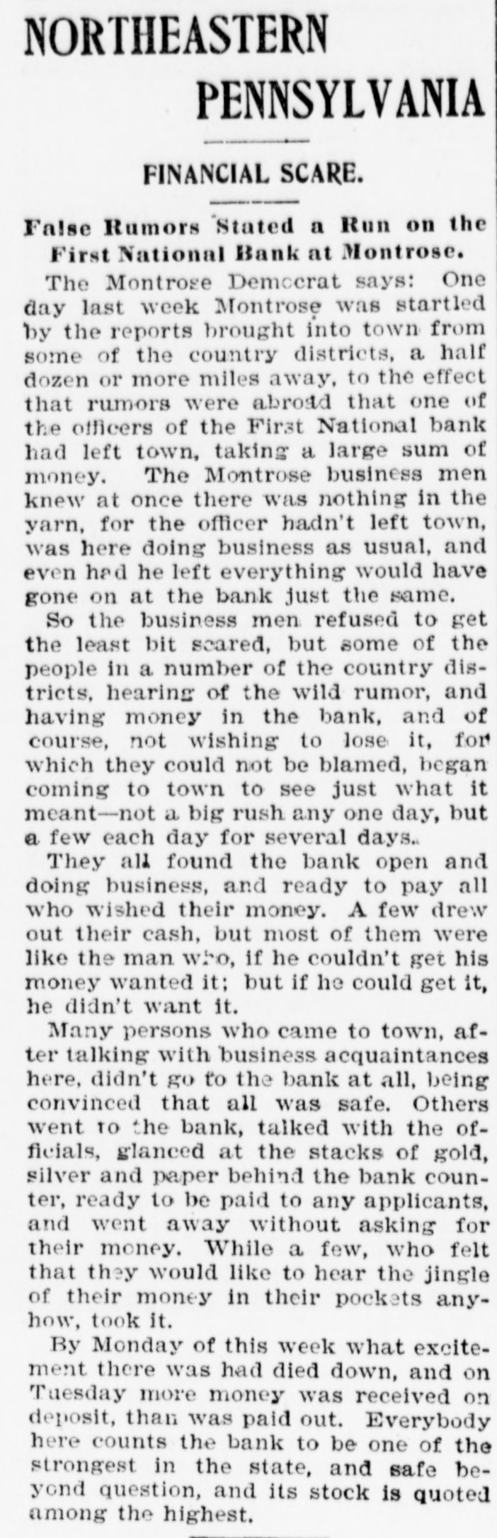 NORTHEASTERN PENNSYLVANIA FINANCIAL SCARE. False Rumors Stated a Run on the First National Bank at Montrose. The Montrose Democrat says: One day last week Montrose was startled by the reports brought into town from some of the country districts, a half dozen or more miles away, to the effect that rumors were abroad that one of the officers of the First National bank had left town, taking a large sum of money. The Montrose business men knew at once there was nothing in the yarn, for the officer hadn't left town, was here doing business as usual, and even had he left everything would have gone on at the bank just the same. So the business men refused to get the least bit scared, but some of the people in a number of the country districts, hearing of the wild rumor, and having money in the bank, and of course, not wishing to lose it, for which they could not be blamed, began coming to town to see just what it meant-not a big rush any one day, but a few each day for several days. They all found the bank open and doing business, and ready to pay all who wished their money. A few drew out their cash, but most of them were like the man who, if he couldn't get his money wanted it; but if he could get it, he didn't want it. Many persons who came to town, after talking with business acquaintances here, didn't go to the bank at all, being convinced that all was safe. Others went to the bank, talked with the officials, glanced at the stacks of gold, silver and paper behind the bank counter, ready to be paid to any applicants, and went away without asking for their money. While a few, who felt that they would like to hear the jingle of their money in their pockets anyhow, took it. By Monday of this week what excitement there was had died down, and on Tuesday more money was received on deposit, than was paid out. Everybody here counts the bank to be one of the strongest in the state, and safe beyond question, and its stock is quoted among the highest.