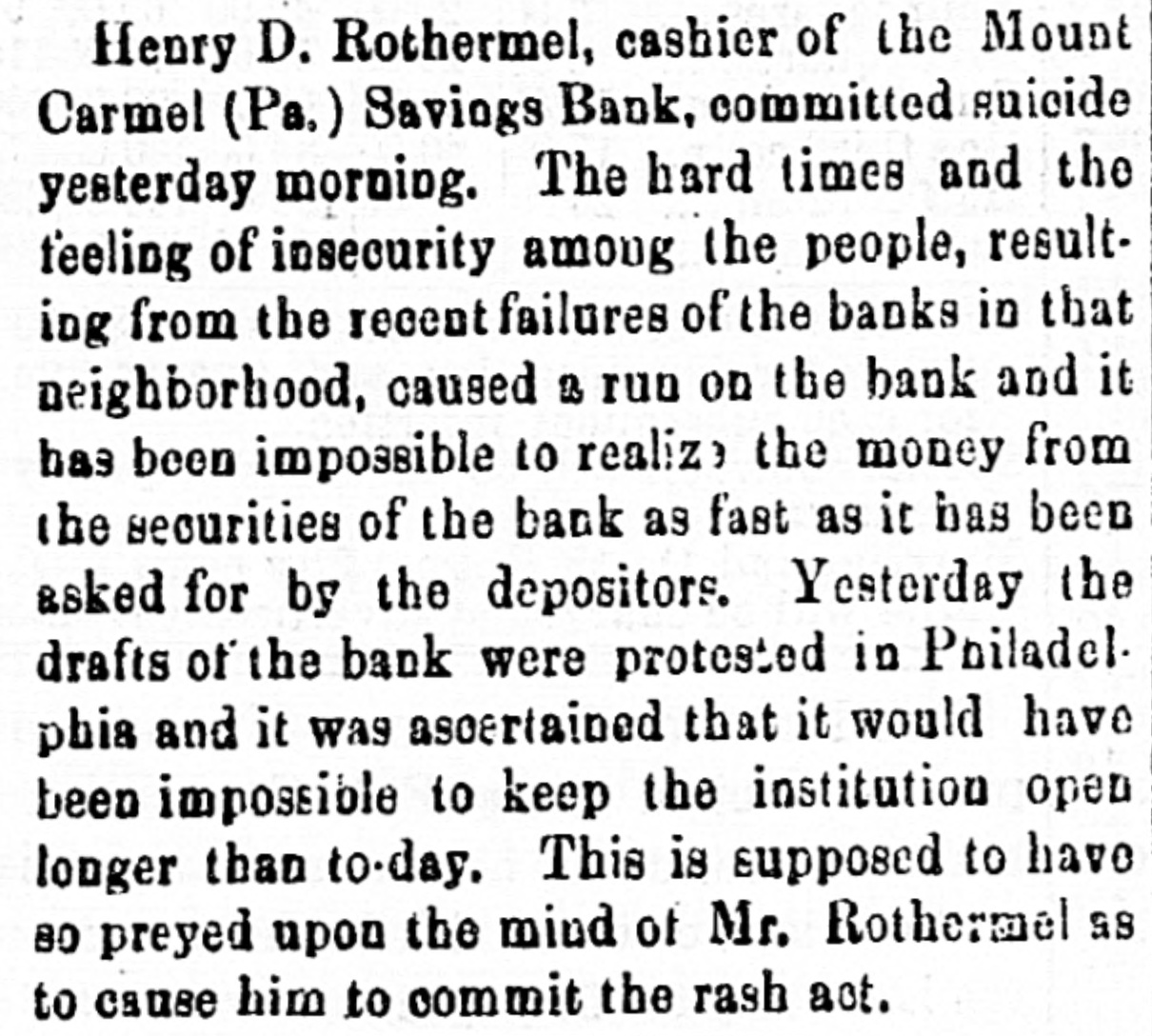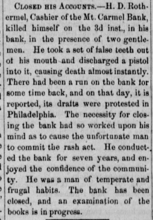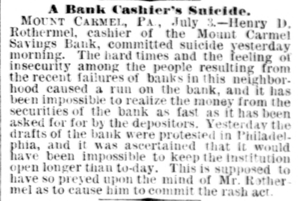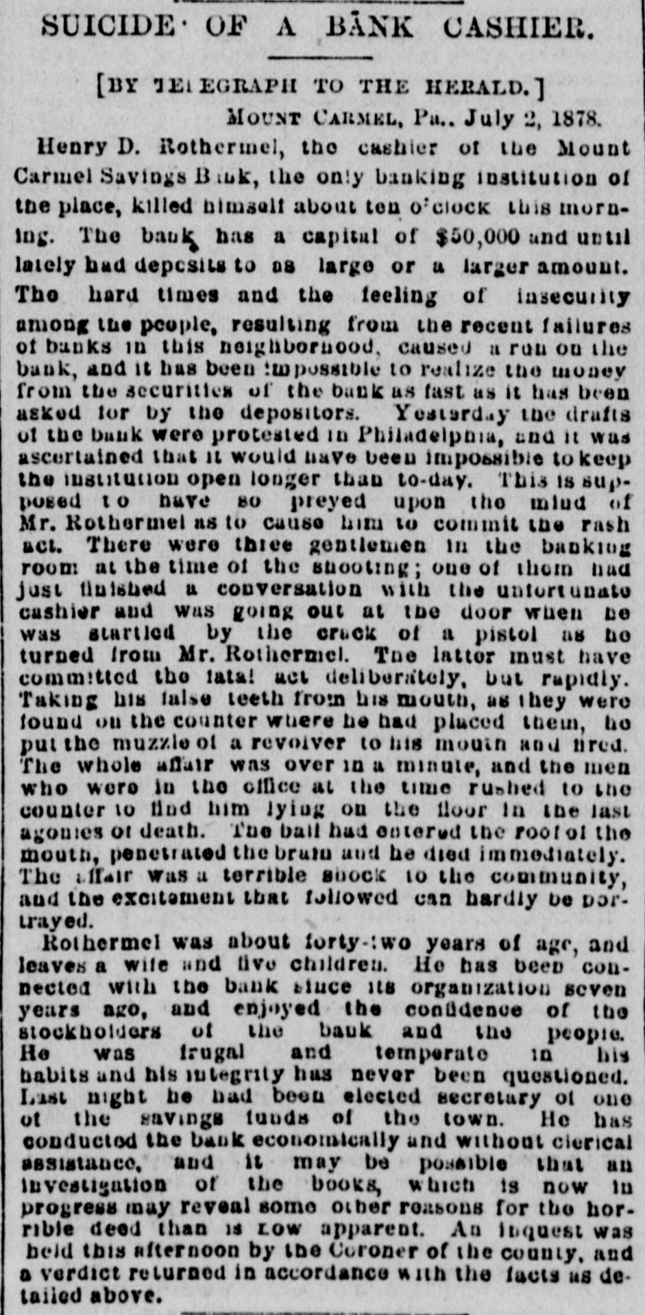 SUICIDE OF A BANK CASHIER. [BY TEL EGRAPH TO THE HERALD. MOUNT CARMEL, Pa.. July 2, 1878. Henry D. Rothermel, the cashier of the Mount Carmel Savings Bank, the only banking institution of the place, killed himself about ten o'clock this morning. The bauk has a capital of $50,000 and until lately had deposits to as large or is larger amount. The hard times and the feeling of insecurity among the people, resulting from the recent failures of banks in this neighborhood, caused a run ou the bank, and it has been impossible to realize the money from the securities of the bank as fast as it has been asked for by the depositors. Yestarday the drafts of the bank were protested in Philadelphia, and 11 was ascertained that 11 would have been impossible to keep the institution open longer than to-day. This IS supposed to have 80 preyed upon the mind of Mr. Rothermel as to cause him 10 commit the rash act. There were three gentlemen in the banking room at the time of the shooting; one of them naa just finished u conversation with the unfortunate cashier and was going oui at the door when be was startled by the cruck of a pistol as be turned from Mr. Rothermel. The lattor must have committed the tata! ace deliberately, but rapidly. Taking his false teeth from his mouth, as they were found ou the counter where be had placed their, ho put the muzzle of a revolver to his mouth and nred. The whole affair was over in a minute, and the men who were in the office at the time rushed to the counter 10 find him lying ou the floor In the last agonies or death. The ball had entered the root of the mouth, penetrated the brato and he died immediately. The affair was a terrible shock 10 the community, and the excitement that followed can hardly be portrayed. Rothermel was about forty-:wo years of age, and leaves a wife and five children. He has been connected with the bank sluce 118 organization seven years ago, and enjoyed the condidence of the stockholders of the bauk and the people. He was trugal and temporate in his habits and his integrity has never been questioned. Last night be had been elected secretary of one ot the savings funds of the town. He has conducted the bank economically and without cierical assistance, and it may be possible that an investigation of the books, which is now in progress may reveal some other reasons for the horrible deed than 15 LOW apparent. An liquest was held this afternoon by the Coroner of the county. and a verdict returned in accordance with the facts us detailed above.