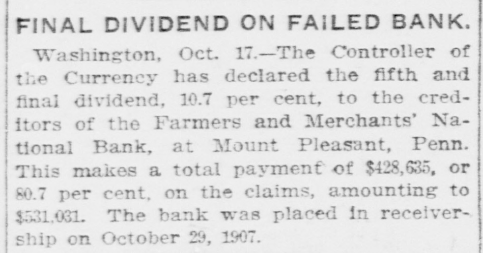 FINAL DIVIDEND ON FAILED BANK. Washington, Oct. 17.-The Controller of the Currency has declared the fifth and final dividend, 10.7 per cent, to the creditors of the Farmers and Merchants' National Bank, at Mount Pleasant, Penn. This makes a total payment of $428,635, or 80.7 per cent, on the claims, amounting to $531,031. The bank was placed in receivership on October 29, 1907.