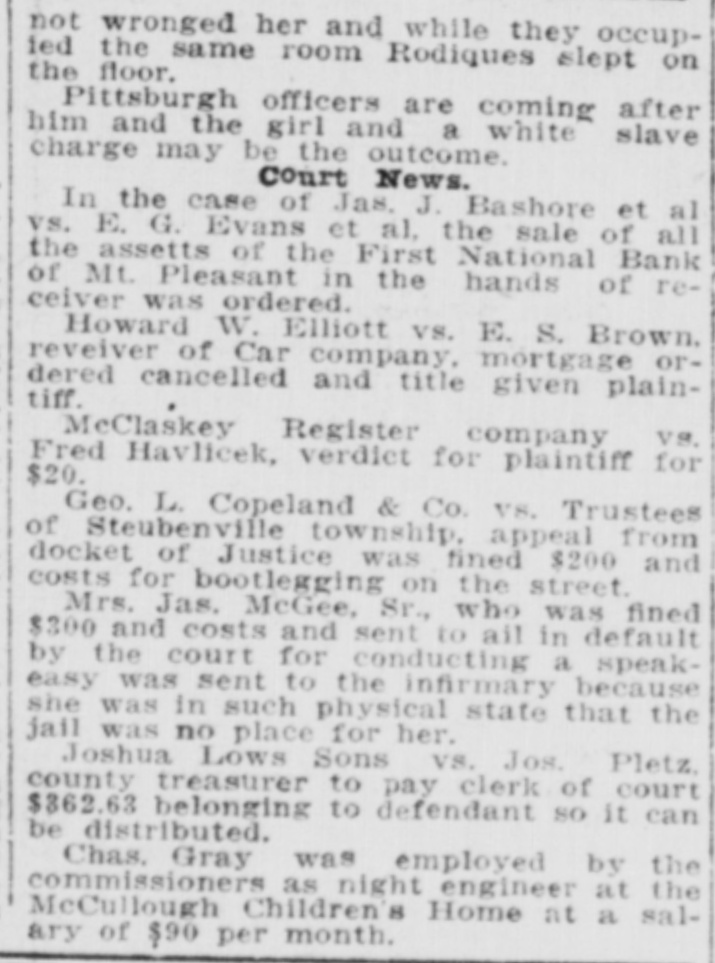not wronged her and while they occup- ied the same room Rodiques slept on the floor. Pittsburgh officers are coming after him and the girl and a white slave charge may be the outcome. ### Court News. In the case of Jas. J. Bashore et al vs. E. G. Evans et al, the sale of all the assetts of the First National Bank of Mt. Pleasant in the hands of re- ceiver was ordered. Howard W. Elliott vs. E. S. Brown. reveiver of Car company, mortgage or- dered cancelled and title given plain- tiff. MeClaskey Register company vs. Fred Havlicek, verdict for plaintiff for $20. Geo. L. Copeland & Co. vs. Trustees of Steubenville township, appeal from docket of Justice was fined $200 and costs for bootlegging on the street. Mrs. Jas. McGee, Sr., who was fined $300 and costs and sent to ail in default by the court for conducting a speak- easy was sent to the infirmary because she was in such physical state that the jail was no place for her. Joshua Lows Sons vs. Jos. Pletz. county treasurer to pay clerk of court $362.63 belonging to defendant so it can be distributed. Chas. Gray was employed by the commissioners as night engineer at the McCullough Children's Home at a sal- ary of $90 per month.