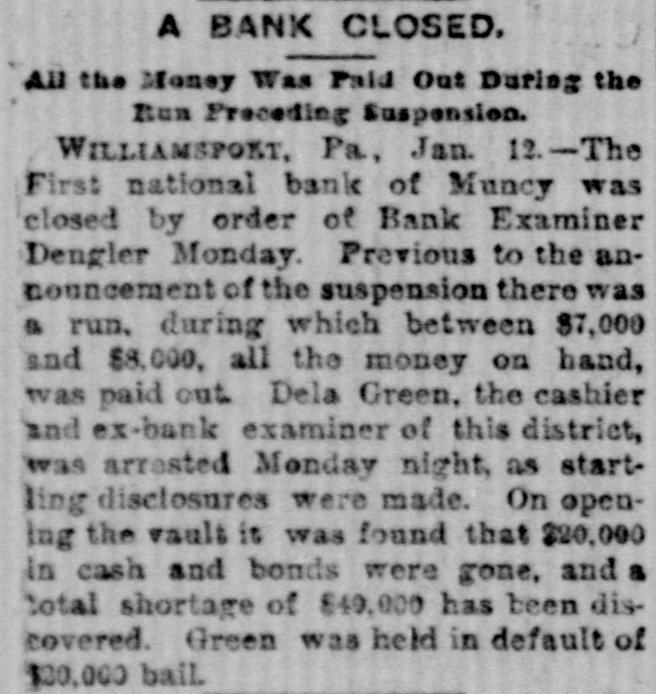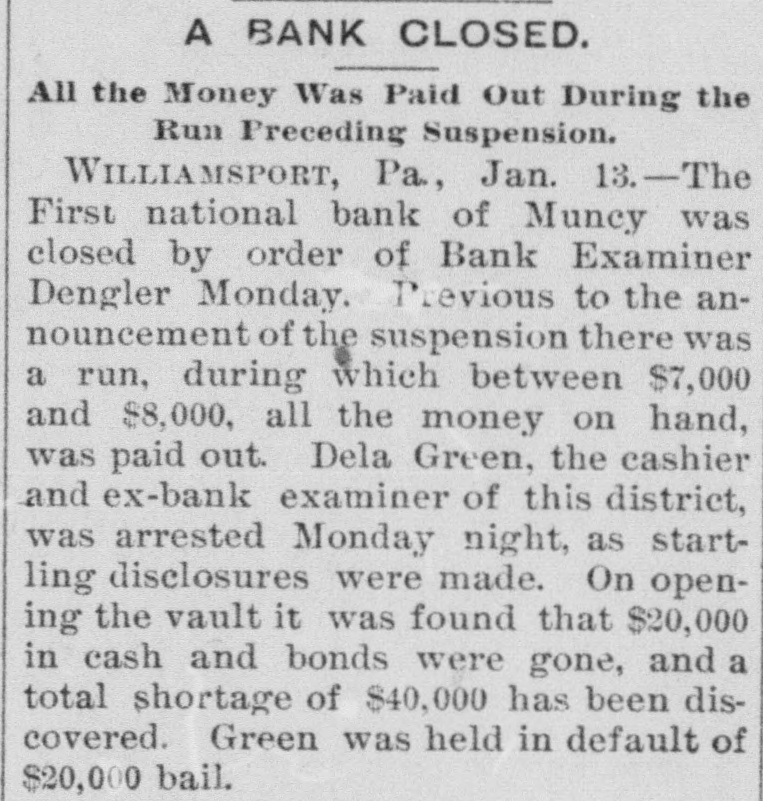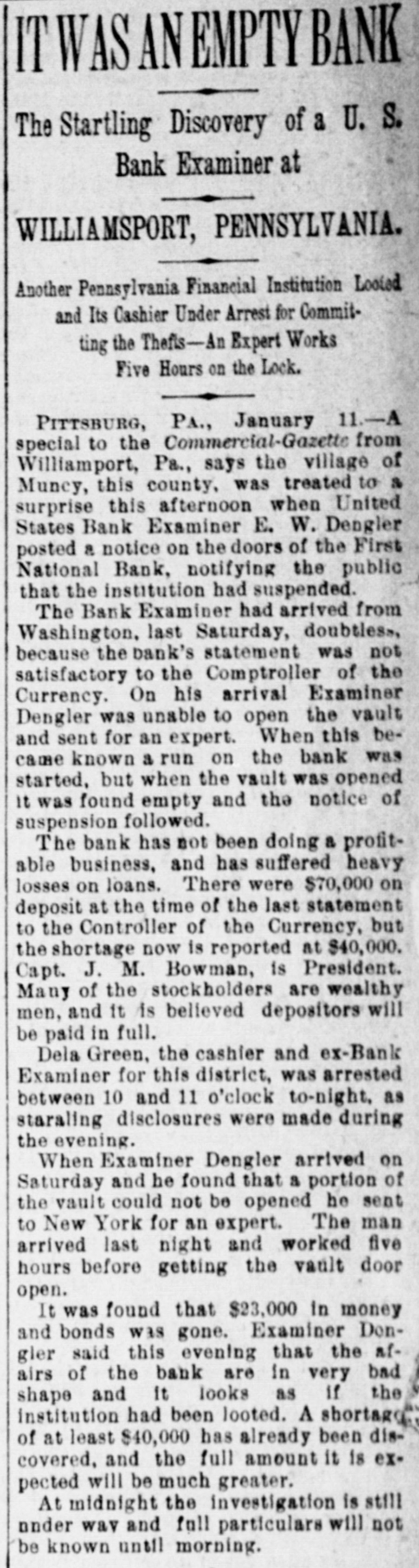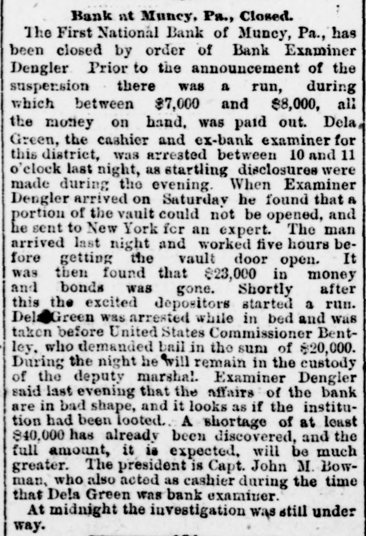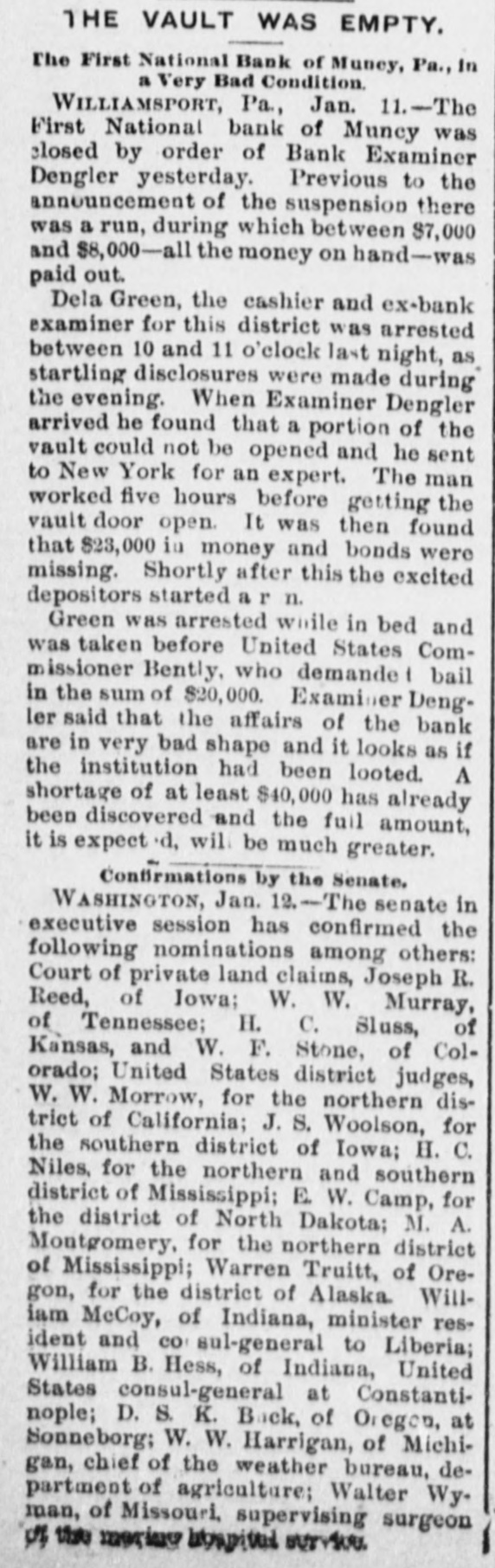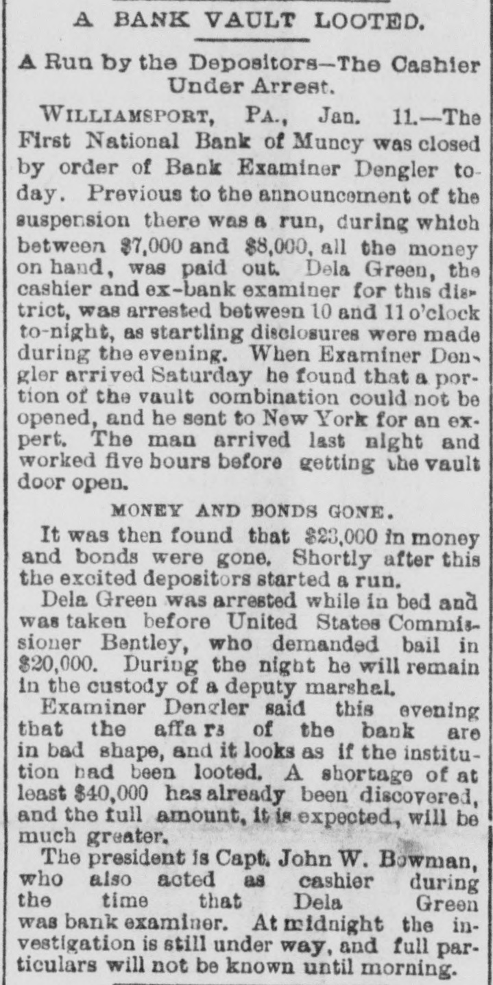 A BANK VAULT LOOTED. A Run by the Depositors-The Cashier Under Arrest. WILLIAMSPORT, PA., Jan. 11. -The First National Bank of Muncy was closed by order of Bank Examiner Dengler today. Previous to the announcement of the suspension there was a run, during which between $7,000 and $8,000, all the money on hand, was paid out. Dela Green, the cashier and ex-bank examiner for this dis trict, was arrested between 10 and 11 o'clock to-night, as startling disclosures were made during the evening. When Examiner Dengler arrived Saturday he found that a portion of the vault combination could not be opened, and he sent to New York for an expert. The man arrived last night and worked five bours before getting the vault door open. MONEY AND BONDS GONE. It was then found that $23,000 in money and bonds were gone, Shortly after this the excited depositors started a run. Dela Green was arrested while in bed and was taken before United States Commissioner Bentley, who demanded bail in $20,000. During the night he will remain in the custody of a deputy marshal. Examiner Dengler said this evening that the affa r3 of the bank are in bad shape, and it looks as if the institution bad been looted. A shortage of at least $40,000 has already been discovered, and the full amount, it is expected, will be much greater. The president is Capt. John W. Bowman, who also acted as cashier during the time that Dela Green was bank examiner. At ridnight the investigation is still under way, and full particulars will not be known until morning.