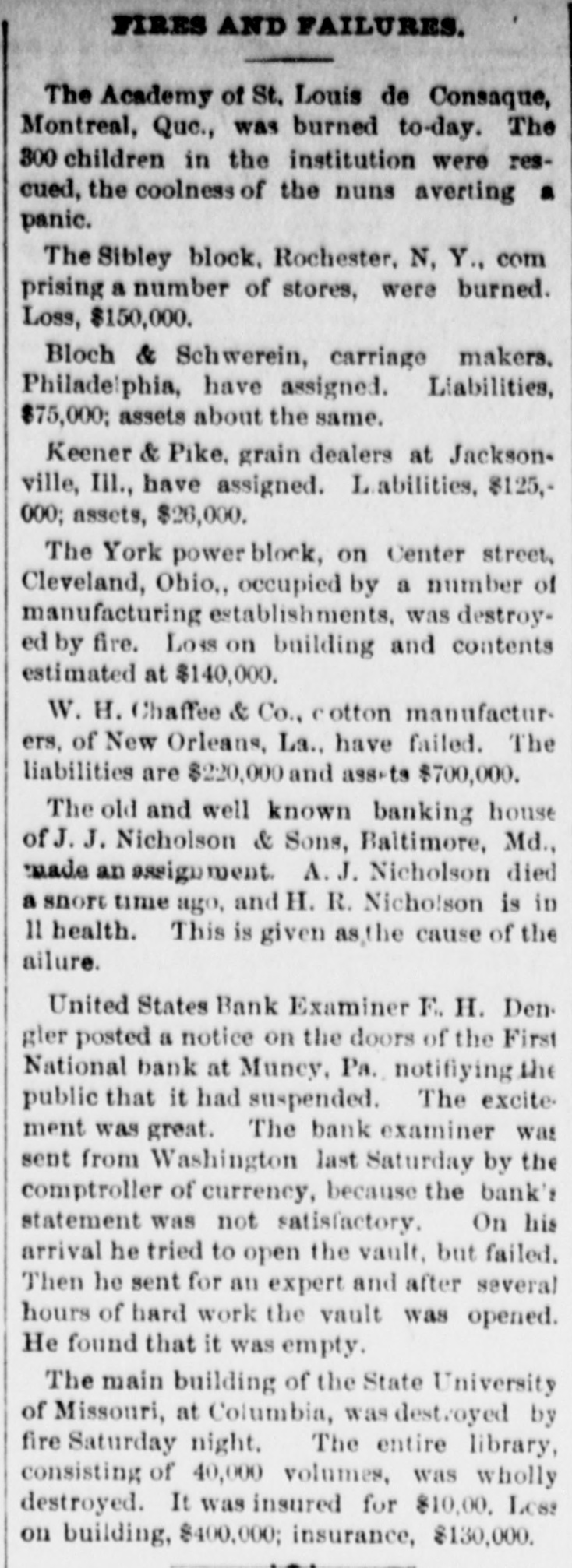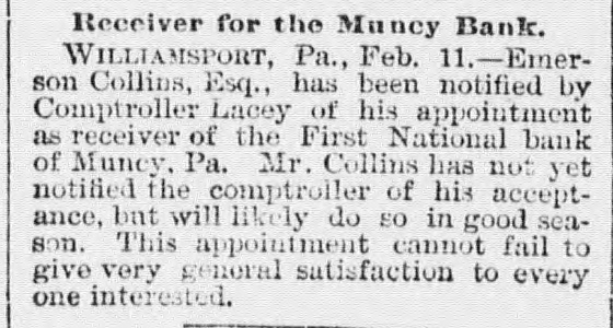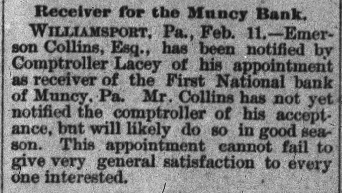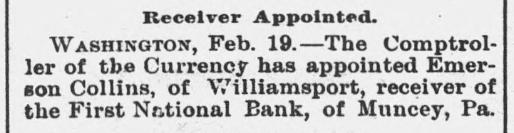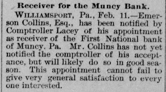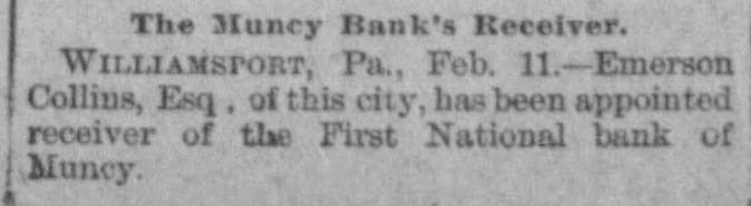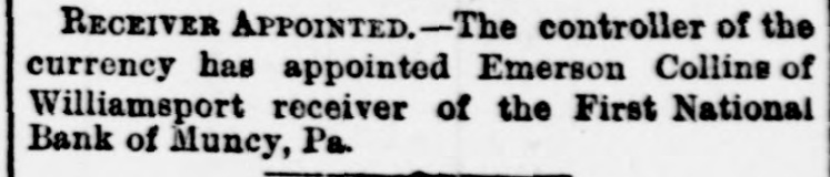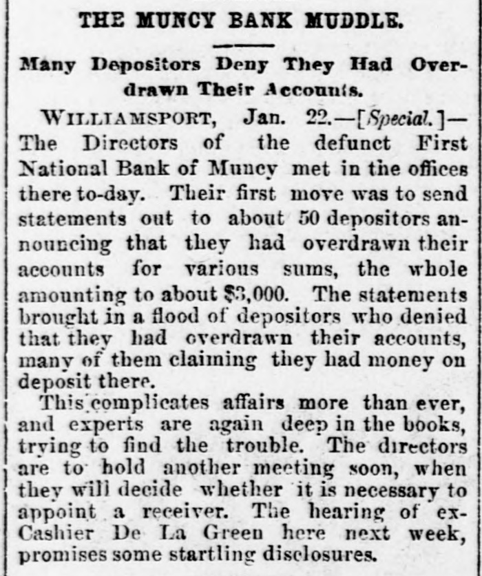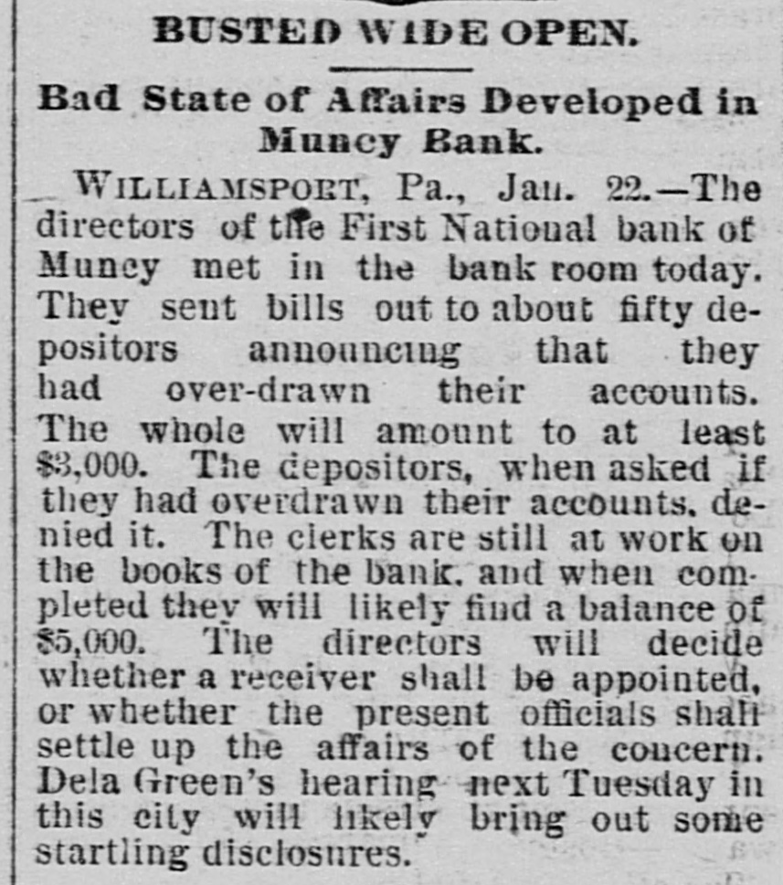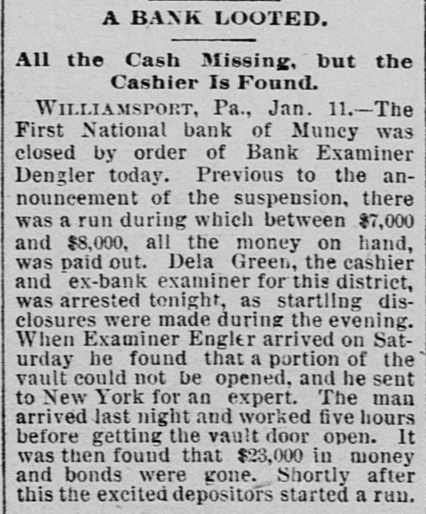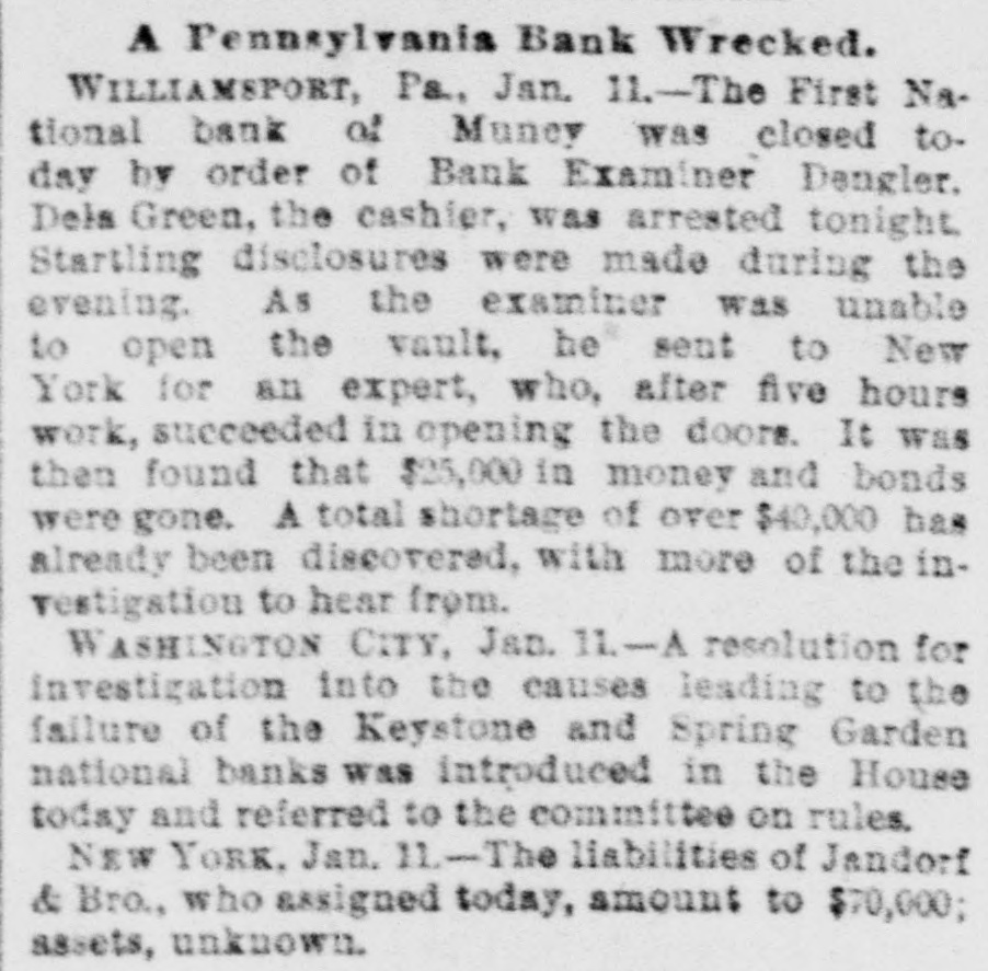 A BANK VAULT LOOTED. A Run by the Depositors-The Cashier Under Arrest. WILLIAMSPORT, PA., Jan. 11. -The First National Bank of Muncy was closed by order of Bank Examiner Dengler today. Previous to the announcement of the suspension there was a run, during which between $7,000 and $8,000, all the money on hand, was paid out. Dela Green, the cashier and ex-bank examiner for this dis trict, was arrested between 10 and 11 o'clock to-night, as startling disclosures were made during the evening. When Examiner Dengler arrived Saturday he found that a portion of the vault combination could not be opened, and he sent to New York for an expert. The man arrived last night and worked five bours before getting the vault door open. MONEY AND BONDS GONE. It was then found that $23,000 in money and bonds were gone, Shortly after this the excited depositors started a run. Dela Green was arrested while in bed and was taken before United States Commissioner Bentley, who demanded bail in $20,000. During the night he will remain in the custody of a deputy marshal. Examiner Dengler said this evening that the affa r3 of the bank are in bad shape, and it looks as if the institution bad been looted. A shortage of at least $40,000 has already been discovered, and the full amount, it is expected, will be much greater. The president is Capt. John W. Bowman, who also acted as cashier during the time that Dela Green was bank examiner. At ridnight the investigation is still under way, and full particulars will not be known until morning.