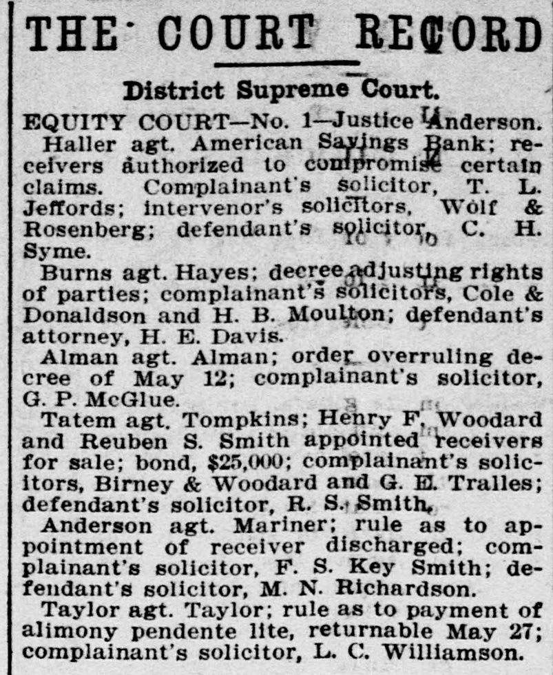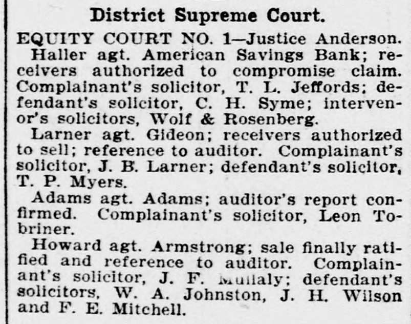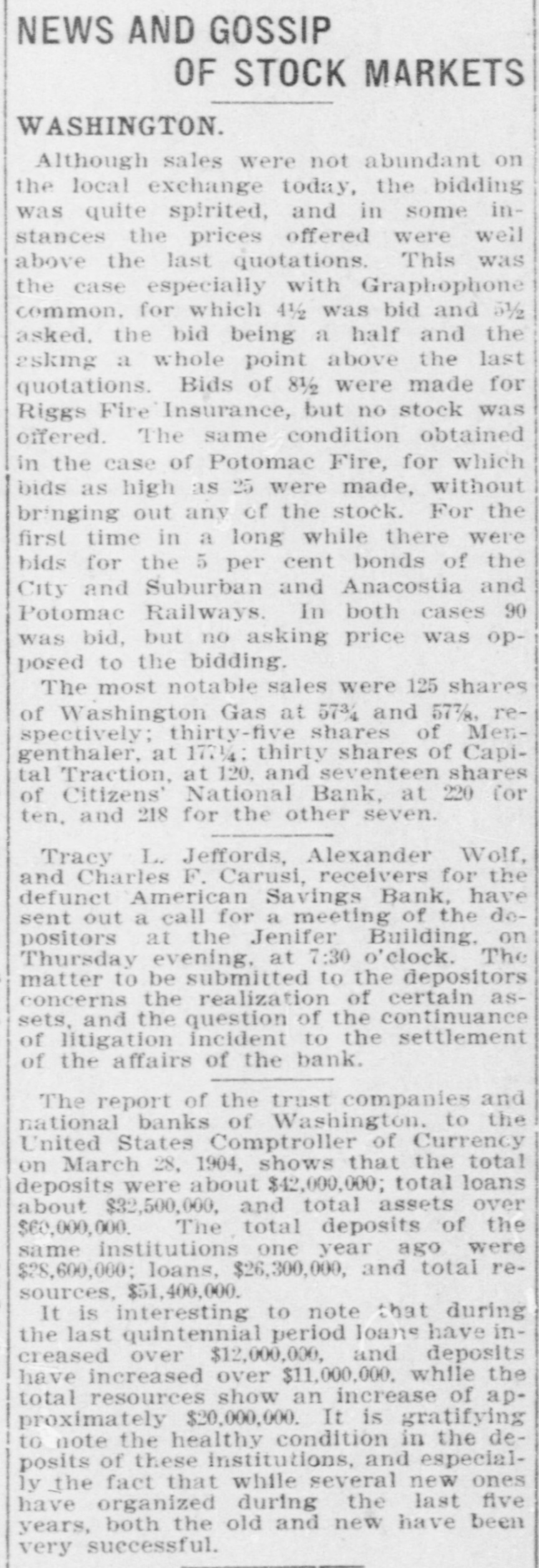 NEWS AND GOSSIP OF STOCK MARKETS WASHINGTON. Although sales were not abundant on the local exchange today, the bidding was quite spirited, and in some instances the prices offered were well above the last quotations. This was the case especially with Graphophone common. for which 4½ was bid and 51/2 asked. the bid being a half and the asking a whole point above the last quotations. Bids of 8½ were made for Riggs Fire Insurance, but no stock was offered. The same condition obtained in the case of Potomac Fire, for which bids as high as 25 were made, without bringing out any of the stock. For the first time in a long while there were bids for the 5 per cent bonds of the City and Suburban and Anacostia and Potomac Railways. In both cases 90 was bid, but no asking price was opposed to the bidding. The most notable sales were 125 shares of Washington Gas at 57% and 57%, respectively; thirty-five shares of Mengenthaler, at 1771/4; thirty shares of Capital Traction, at 120, and seventeen shares of Citizens' National Bank, at 220 for ten, and 218 for the other seven. Tracy L. Jeffords, Alexander Wolf, and Charles F. Carusi, receivers for the defunct American Savings Bank, have sent out a call for a meeting of the depositors at the Jenifer Building, on Thursday evening, at 7:30 o'clock. The matter to be submitted to the depositors concerns the realization of certain assets, and the question of the continuance of litigation incident to the settlement of the affairs of the bank. The report of the trust companies and national banks of Washington. to the United States Comptroller of Currency on March 28, 1904, shows that the total deposits were about $42,000,000; total loans about $32,500,000, and total assets over $60,000,000. The total deposits of the same institutions one year ago were $28,600,000; loans, $26,300,000, and total resources, $51,400,000. It is interesting to note that during the last quintennial period loans have increased over $12,000,000, and deposits have increased over $11,000,000. while the total resources show an increase of approximately $20,000,000. It is gratifying to note the healthy condition in the deposits of these institutions, and especially the fact that while several new ones have organized during the last five years, both the old and new have been very successful.