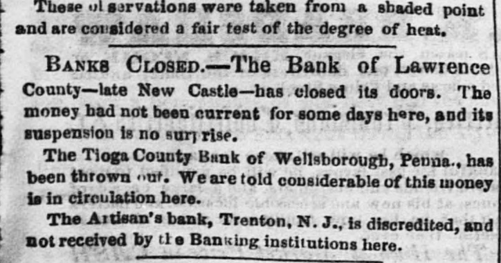 These of servations were taken from a sbaded point and are considered a fair test of the degree of heat. BANKS CLOSED.-The Bank of Lawrence County-late New Castle-has closed its doors. The money bad not been current for some days here, and its suspension is no surj rise. The Tioga County Bank of Wellsborough, Penna., has been thrown out. We are told considerable of this money is in circulation here. The Artisan's bank, Trenton, N.J., is discredited, and not received by the Banking institutions here.
