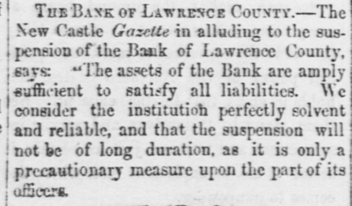 THE BANK OF LAWRENCE COUNTY.-The New Castle Gazette in alluding to the suspension of the Bank of Lawrence County, says: "The assets of the Bank are amply sufficient to satisfy all liabilities. We consider the institution perfectly solvent and reliable, and that the suspension will not be of long duration, as it is only a precautionary measure upon the part of its officers.