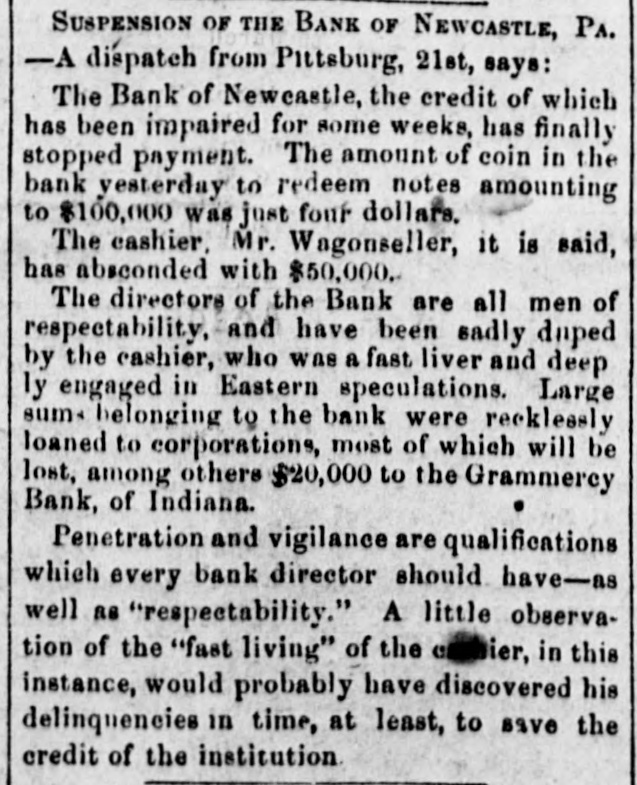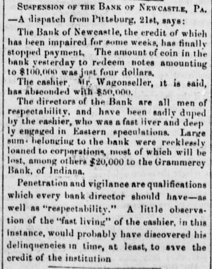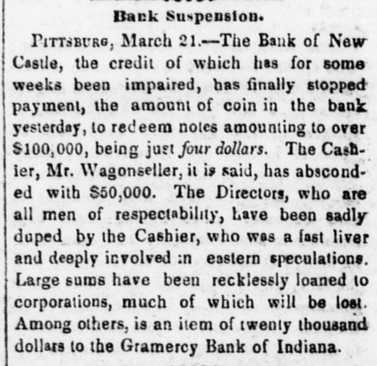 Monetary. The following communication, upon the recent Bank excitement, has been handed to us by a friend, for publication. Of the justice and appropriateness of the points made, each reader must judge for himself. Rumors have been afloat for several days prejudicial to the Warren County Bank, Penn; Erie City Bank, Penn.; Bank of Newcastle, Penn.; Rhode Island Central Bank the Exchange Bank at Bangor, Maine; Hartford County and Hartford Banks; and on Monday the Banks of this city threw out the issues of those institutions. The result was a panic among the holders of those bills, and the Bank of the Capital relieved them of their alarm at five per cent. shave. We were unable to trace these rumors" to any reliable source, and our Eastern exchanges contained nothing which wouldjurelly the suspicions set afloat. Under these circumstances we thought it unwise, by a publication of mere rumors, to discredit the character of Banks whose paper was in circulation in this section to a considerable amount. It could have no good effect certainly, and the result of the publication of these rumors by other papers was, to give a sort of authority. to them which created unnecessary alarm. It induced the laboring man, the mechanic, the trader, and all parties to part with this currency at a shave and our Bankers laughed in their sleeves at the rich harvest it was bringing them. We have no sympathy for Banks, but we cannot see the propriety of newspapers discrediting their issues unjustly and unnecessarily, to the disadvantage of the public. Private speculation may be the motive, we can conceive of no other. We should like to see the Constitutional Currency, gold and silver, displace all the small bank notes in circulation, but this era we do not expect to witness until some general commercial revulsion bursts the paper bubble and forces it upon the country. The N. Y. Tribune of Saturday last, states that the Exchange Bank of Bangor, Maine, had been thrown out by the Suffolk Bank, of Boston and it was rumored that some parties at the West had purchased it. The Suffolk is the redeeming agent of all the' New England Banks and its being thrown out is unfavorable to the credit of the Exchange Bank, although no evidence of its failure. [For the Sentinel.] THE CRUSADE AGAINST THE BANKS.Some extremely wise financier has the following in the commercial column of the Journal this morning as a communication INDIANAPOLIS, Dec. 22. EDITORS JOURNAL I notice in your monetary column that some interested party speaks of rumor being afoat in relation to Hartford County Bank and Hartford Bank. Any person with a thimble full of brains would not suspect the Harrford Banks; and to classify them with such concerns as the Rhode Island Central and Erie City, is ridiculous in the extreme. Has this community forgot the losses on the "Valley Bank" at Hagerstown, Maryland? A friend to good Banks is quite adroit in placing Rhode Island Central and Erie City in such good company. The ear-marks of the above are unmistakable. Its author is one of a few that are left of the wonderful genius's of a fast reced. ing generation. He has more than a "thimble full of brains," no doubt-an ceertainly more than a bucket full of impudence. But there is none wise as he,and he thinks no one other than himself has any right to have any opinion of money, Banks or business. He comes down on those'concerns', the Erie City and R. I. Central, with his fiat of doom. He has probably forgot a certain "concern nearer home, that, a few years ago, suspended specie payments, and drove its creditors to rely on its promises a year or two, or get nothing. There is "snobbism" in Banks, as well as other places, it seems.