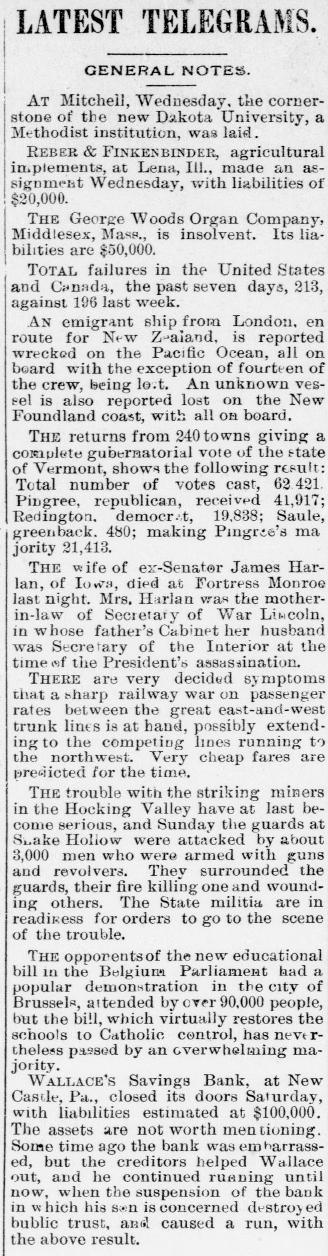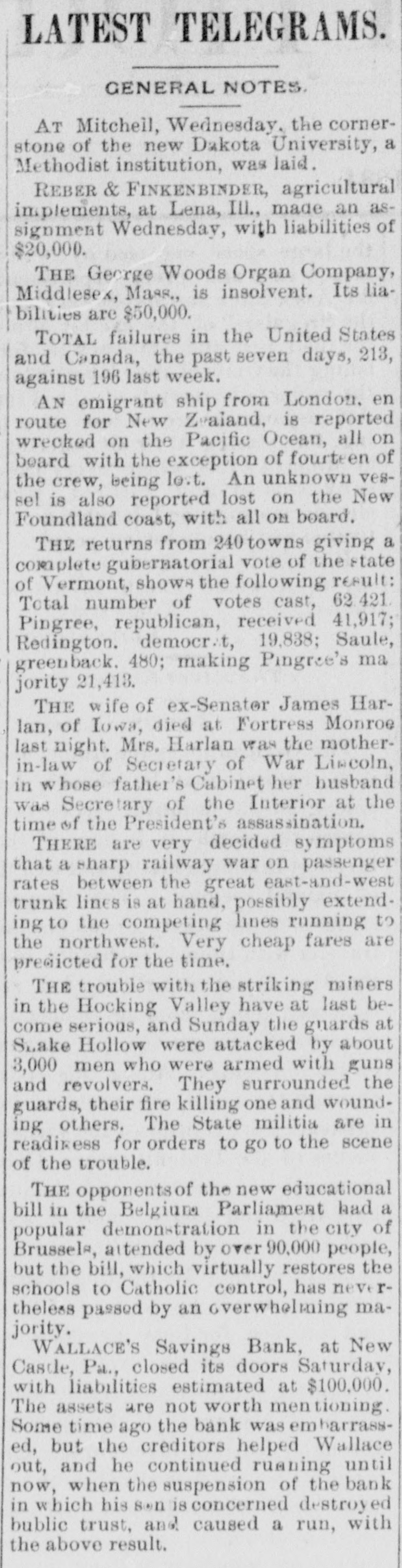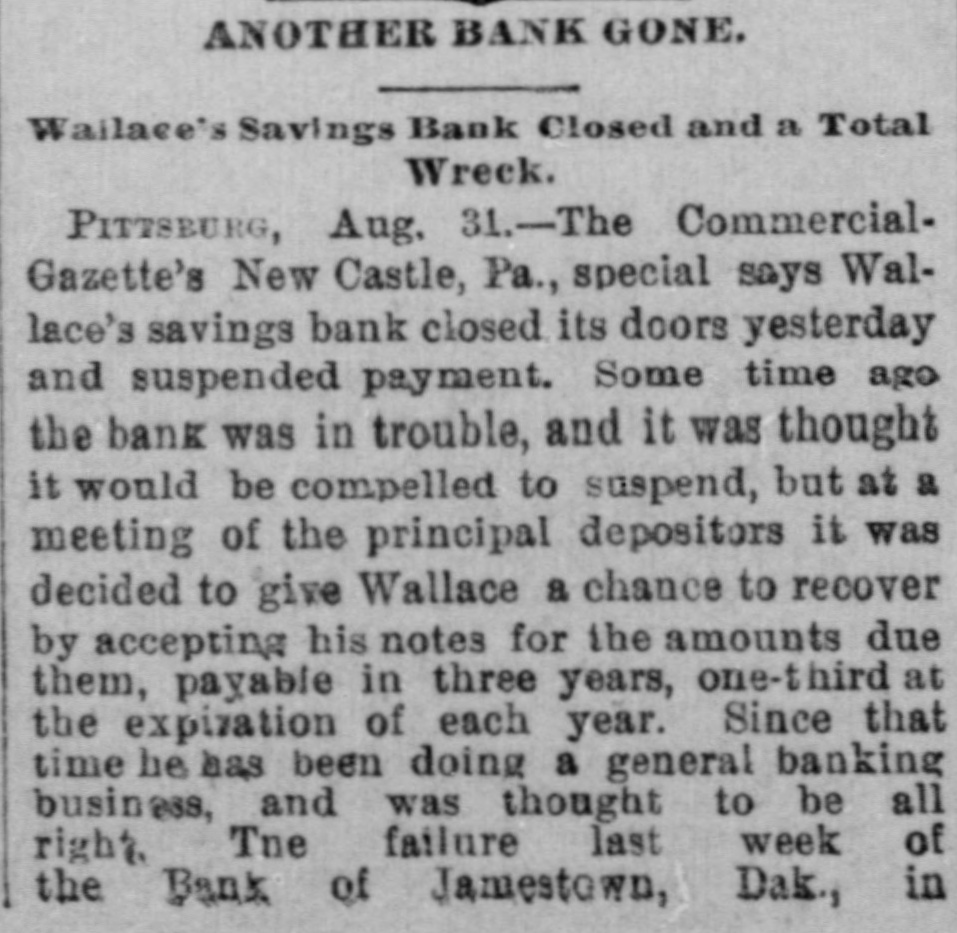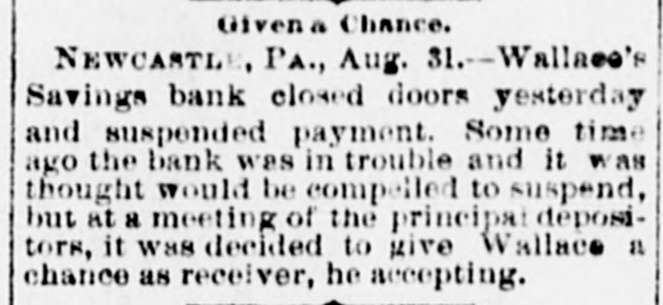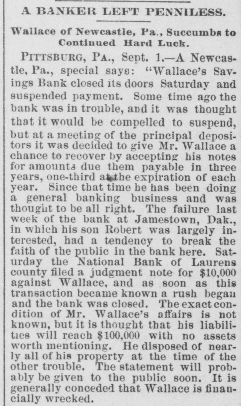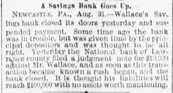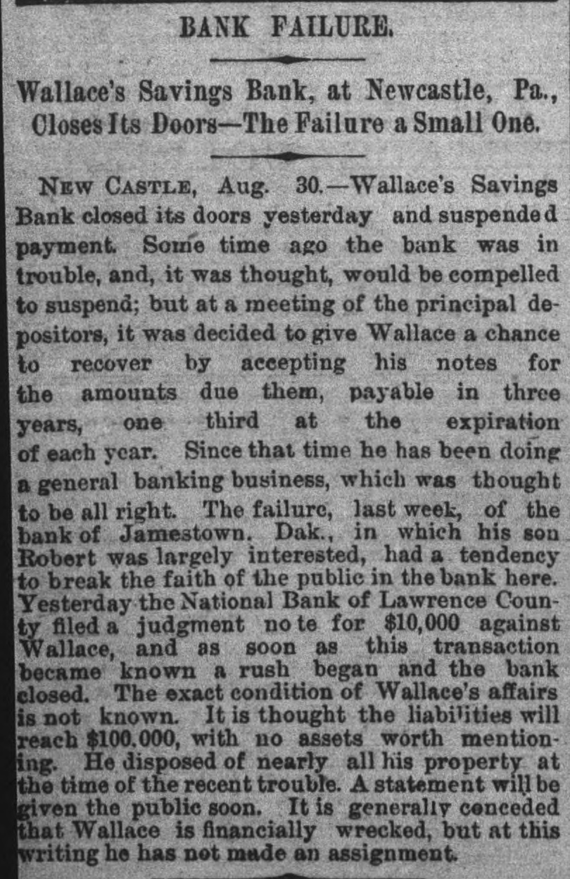 BANK FAILURE. Wallace's Savings Bank, at Newcastle, Pa., Closes Its Doors- - The Failure a Small One. NEW CASTLE, Aug. 30.-Wallace's Savings Bank closed its doors yesterday and suspende d payment. Some time ago the bank was in trouble, and, it was thought, would be compelled to suspend; but at a meeting of the principal depositors, it was decided to give Wallace a chance to recover by accepting his notes for the amounts due them, payable in three years, one third at the expiration of each year. Since that time he has been doing a general banking business, which was thought to be all right. The failure, last week, of the bank of Jamestown. Dak., in which his son Robert was largely interested, had a tendency to break the faith of the public in the bank here. Yesterday the National Bank of Lawrence County filed a judgment no te for $10,000 against Wallace, and as soon as this transaction became known a rush began and the bank closed. The exact condition of Wallace's affairs is not known. It is thought the liabilities will reach $100,000, with no assets worth mentioning. He disposed of nearly all his property at the time of the recent trouble. A statement will be given the public soon. It is generally conceded that Wallace is financially wrecked, but at this writing he has not made an assignment.