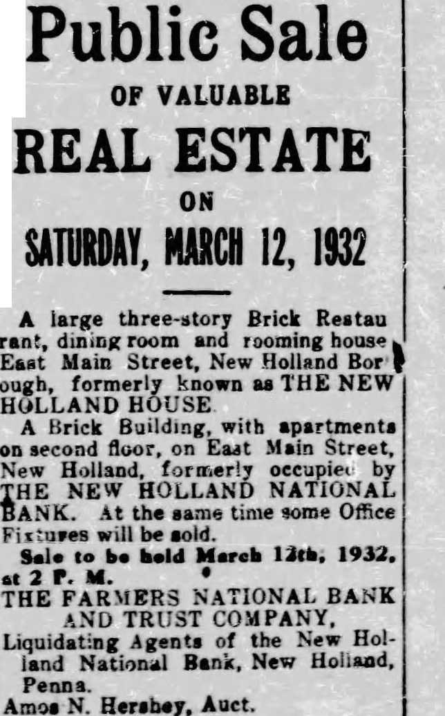 Public Sale OF VALUABLE REAL ESTATE ON SATURDAY, MARCH 12, 1932 A large three-story Brick Restau rant, dining room and rooming house East Main Street, New Holland Bor ough, formerly known as THE NEW HOLLAND HOUSE A Brick Building, with apartments on second floor, on East Main Street, New Holland, formerly occupied by THE NEW HOLLAND NATIONAL BANK. At the same time some Office Fixtures will be sold. Sale to be held March 12th, 1932, at P. M. THE FARMERS NATIONAL BANK AND TRUST COMPANY, Liquidating Agents of the New Holland National Bank, New Holland, Penna. Amos N. Hershey, Auct.
