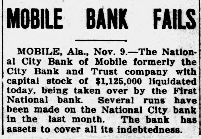 MOBILE BANK FAILS MOBILE, Ala., Nov. 9.-The National City Bank of Mobile formerly the City Bank and Trust company with capital stock of $1,125,000 liquidated today, being taken over by the First National bank. Several runs have been made on the National City bank in the last month. The bank has assets to cover all its indebtedness.