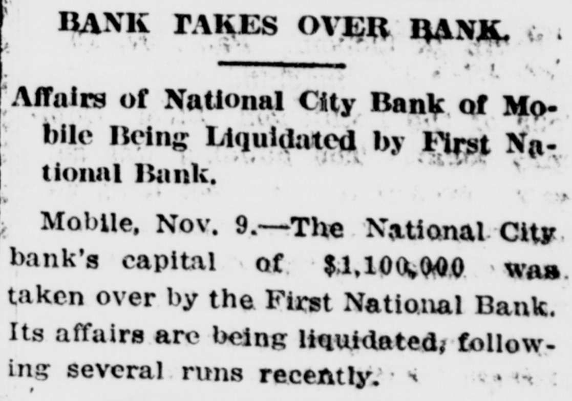 BANK TAKES OVER BANK. Affairs of National City Bank of Mobile Being Liquidated by First National Bank. Mobile, Nov. 9.-The National City bank's capital of $1,100,000 was. taken over by the First National Bank. Its affairs are being liquidated, following several runs recently.