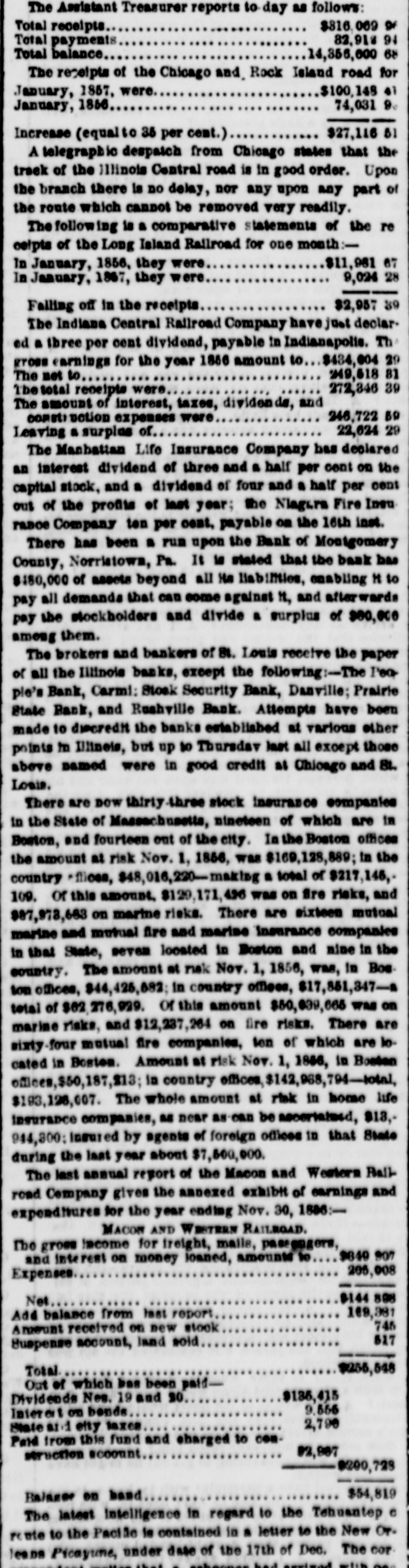 The Assistant Treasurer reports to day as follows: $816,069 or Total receipts 82,918 94 Total payments Total balance 14,356,600 68 The receipts of the Chicago and, Rock Island road for $100,148 41 January, 1857, were January, 1856 74,031 9. $27,116 51 Increase (equalto 35 per cent.) A telegraphic despatch from Chicago states that the treek of the Illinois Central road is in good order. Upon the branch there is no delay, nor any upon any part of the route which cannot be removed very readily. The following is a comparative statements of the re celpts of the Long Island Railroad for one month:$11,981 67 In January, 1856, they were 9,024 28 In January, 1867, they were $2,957 39 Failing off in the receipts The Indiana Central Railroad Company have just declared a three per cent dividend, payable in Indianapolis. Th gross earnings for the year 1866 amount to $484,004 29 The net to 249,618 81 Tbetotal receipts were 272,346 39 The amount of interest, taxes, dividends, and 246,722 B9 construction expenses were 22,624 29 Leaving a surplus of The Manhattan Life Insurance Company has declared an interest dividend of three and a half per cent on the capital stock, and a dividend of four and a half per cent out of the profits of last year; the Niagara Fire Insu raboe Company ten per cent, payable on the 16th inst. There has been a run upon the Bank of Montgomery County, Norristown, Pa. It is stated that the bank has $180,000 of assets beyond all He liabilities, enabling Ht to pay all demands that can some against it, and atterwards pay the stockholders and divide a surplus of $80,000 among them. The brokers and bankers of St. Louis receive the paper of all the Illinois banks, except the following:--The Peopie's Bank, Carmi: Stock Security Bank, Danville; Prairie State Bank, and Rushville Bank. Attempts have been made to discredit the banks established at various other points in Illineis, but up to Thursday last all except those above named were in good credit at Chicago and St. Louis. There are now thirty-three stock insurance companies in the State of Massachusetts, nineteen of which are in Boston, and fourteen out of the city. In the Boston offices the amount at risk Nov. 1, 1856, was $169,128,889; in the country -flices, $48,016,220-making a total of $217,145,109. or this amount, $129,171,426 was on fire risks, and $87,973,683 on marine risks. There are sixteen mutual marine and mutual fire and marine insurance companies in that State, seven located in Boston and nine in the country. The amount at risk Nov. 1, 1856, was, in Boston offices, $44,425,082; in country offices, $17,851,347-a total of $62,276,929. Of this amount $50,039,665 was on marine risks, and $12,237,264 on fire risks. There are sixty-four mutual fire companies, ten of which are tocated in Boston. Amount at risk Nov. 1, 1866, in Boston ofloces,$50,187,213; in country effcem,$142,988,794-totnl, $193,126,007. The whole amount at risk in home life insurance companies, as near as can be ascertained, $13,944,300: Insured by agents of foreign offices in that State during the last year about $7,500,000. The last annual report of the Macon and Western Bailroad Company gives the annexed exhibit of earnings and expenditures for the year ending Nov. 30, 1886:MACON AND WESTERN RAILROAD. The gross Income for freight, mails, passengers, 9849 907 and interest on money loaned, amounts to 205,008 Expenses $144 898 Net 109,381 Add balance from last report 746 Amount received on new stock 517 Suspense account, land sold $255,548 Total Out of which bas been paid$135,415 Dividends Nes. 19 and 20 9,566 Interest on bends 2,790 State and city taxes Paid from this fund and charged to con92,987 struction account $200,723 $54,819 Balasse on band The latest intelligence in regard to the Tehuantep e reute to the Pacific le contained in a letter to the New Orleans Picayune, under date of the 17th of Dec. The cor that rehernes had excized mub ano