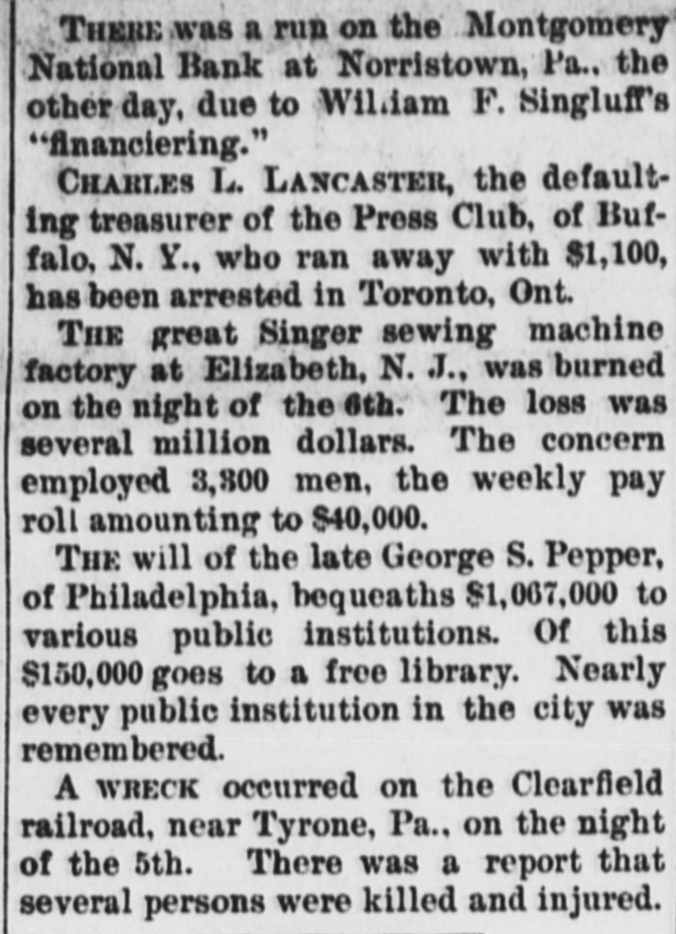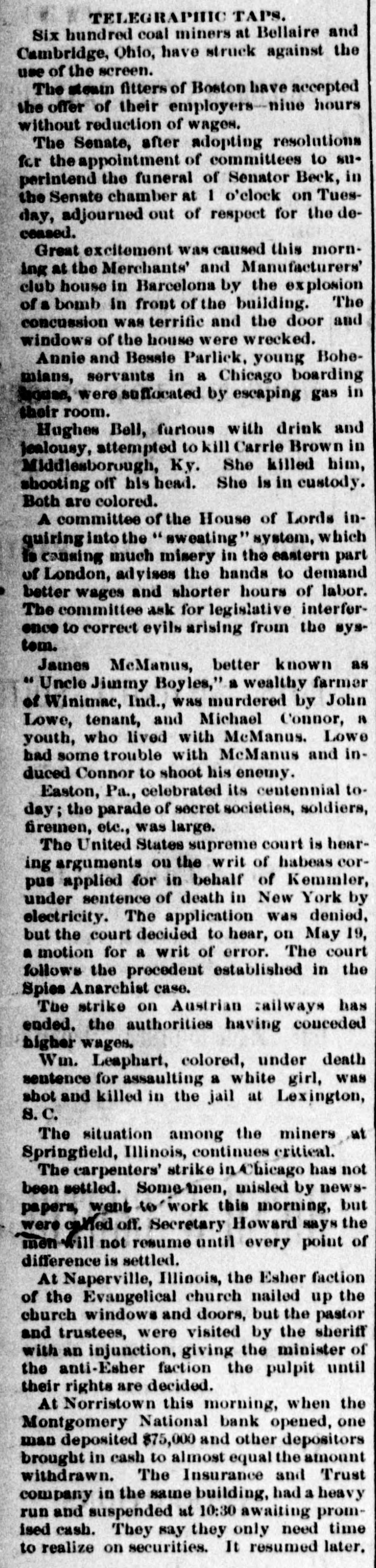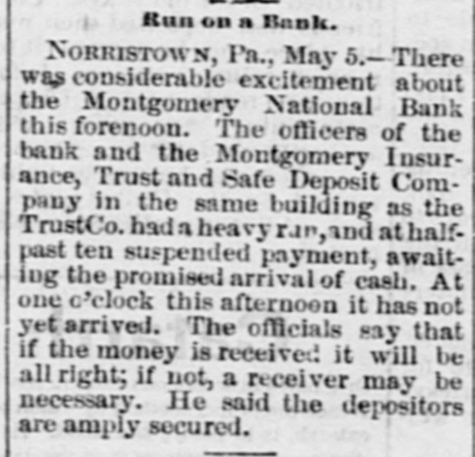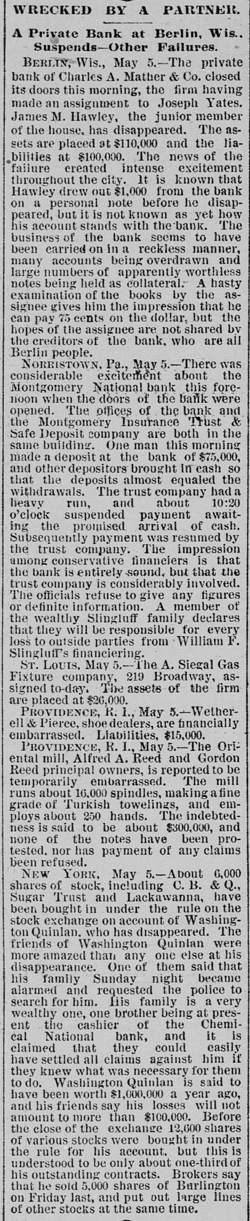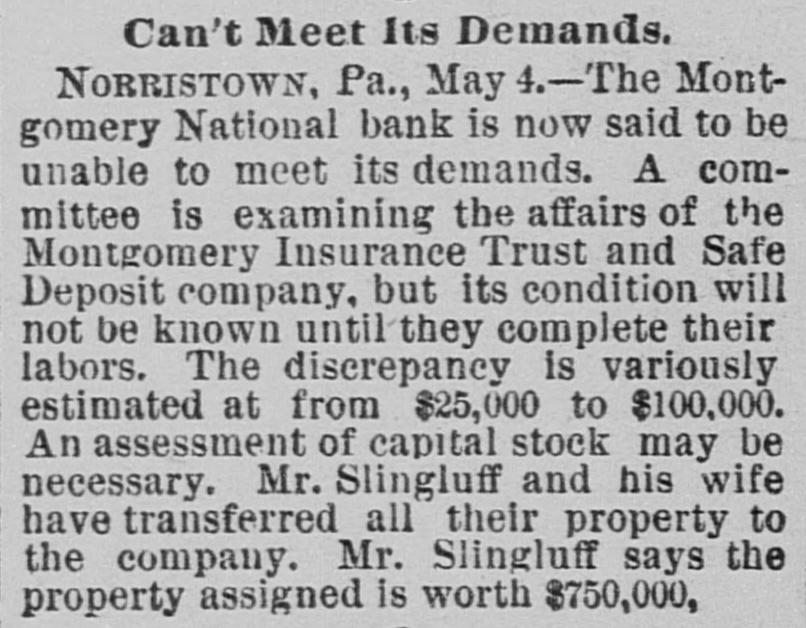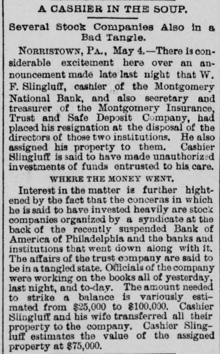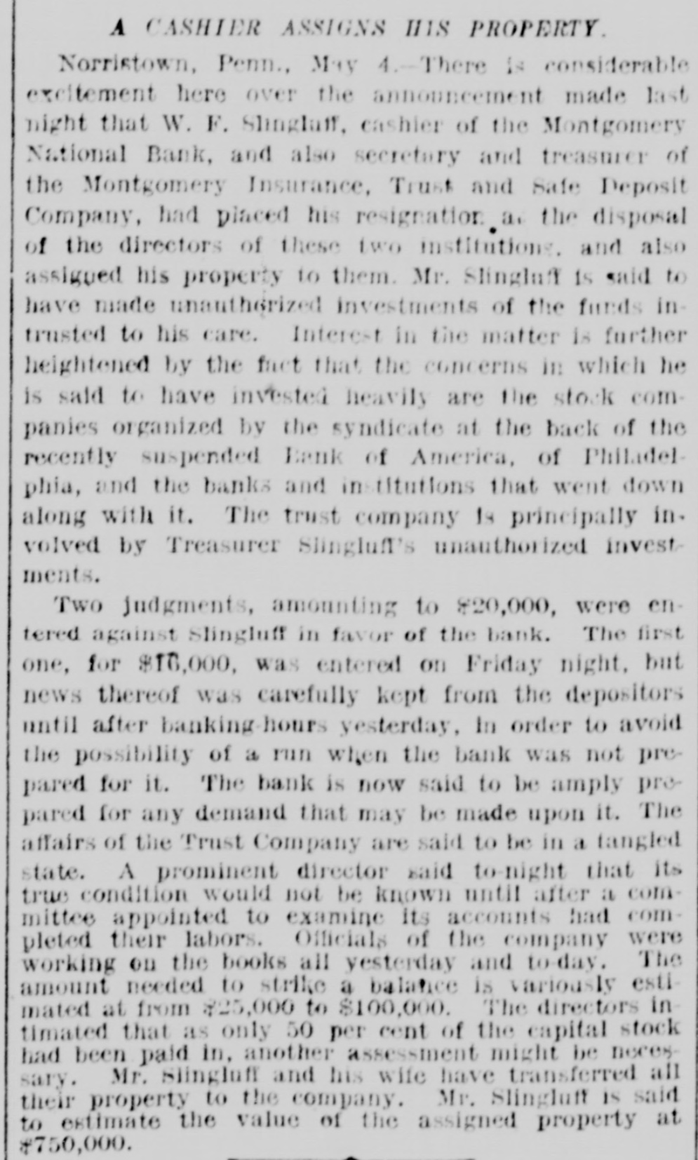 A CASHIER ASSIGNS HIS PROPERTY Norristown, Penn., May 4.-There is considerable excitement here over the announcement made last night that W. F. Slinglan. cashier of the Montgomery National Bank, and also secretary and treasurer of the Montgomery Insurance, Trust and Safe Deposit Company, had placed his resignation a. the disposal of the directors of these two institutions. and also assigued his property to them. Mr. Slingluff is said to have made unauthorized investments of the funds intrusted to his care. Interest in the matter is further heightened by the fact that the concerns in which he is said to have invested heavily are the stock companies organized by the syndicate at the back of the recently suspended Bank of America, of Philadelphia, and the banks and in titutions that went down along with it. The trust company is principally in. volved by Treasurer Slingluff's unauthorized invest ments. Two judgments, amounting to $20,000, were entered against Slingluff in favor of the bank. The first one, for $16,000, was entered on Friday night, but news thereof was carefully kept from the depositors until after banking-hours yesterday, In order to avoid the possibility of a run when the bank was not prepared for it. The bank is now said to be amply prepared for any demand that may be made upon it. The affairs of the Trust Company are said to be in a tangled state. A prominent director said to-night that its true condition would not be known until after a committee appointed to examine its accounts had completed their labors. Officials of the company were working ou the books all yesterday and to-day. The amount needed to strike a balance is variously estimated at from $25,000 to $100,000. The directors in timated that as only 50 per cent of the capital stock had been paid in. another assessment might be neces sary. Mr. Slingluff and his wife have transferred all their property to the company. Mr. Slingluft is said to estimate the value of the assigned property at #750,000.