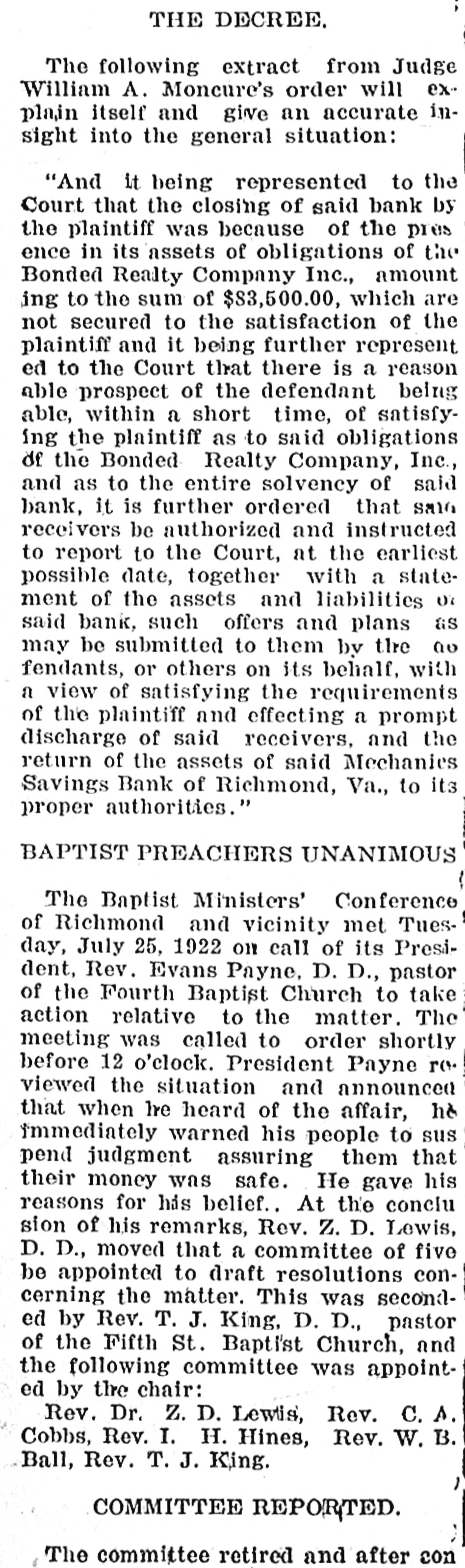 THE DECREE. The following extract from Judge William A. Moncure's order will explain itself and give an accurate insight into the general situation: "And it being represented to the Court that the closing of said bank by the plaintiff was because of the pres ence in its assets of obligations of the Bonded Realty Company Inc., amount ing to the sum of $83,500.00, which are not secured to the satisfaction of the plaintiff and it being further represent ed to the Court that there is a reason able prospect of the defendant being able, within a short time, of satisfying the plaintiff as to said obligations of the Bonded Realty Company, Inc., and as to the entire solvency of said bank, it is further ordered that Sale receivers be authorized and instructed to report to the Court, at the earliest possible date, together with a statement of the assets and liabilities 07 said bank, such offers and plans as may be submitted to them by the ao fendants, or others on its behalf, with a view of satisfying the requirements of the plaintiff and effecting a prompt discharge of said receivers, and the return of the assets of said Mechanics Savings Bank of Richmond, Va., to its proper authorities." BAPTIST PREACHERS UNANIMOUS ( The Baptist Ministers' Conference 9 of Richmond and vicinity met Tuesday, July 25, 1922 on call of its President, Rev. Evans Payne, D. D., pastor of the Fourth Baptist Church to take action relative to the matter. The meeting was called to order shortly before 12 o'clock. President Payne reviewed the situation and announced that when he heard of the affair, he immediately warned his people to sus pend judgment assuring them that their money was safe. He gave his reasons for his belief.. At the conclu sion of his remarks, Rev. Z. D. Lewis, D. D., moved that a committee of five be appointed to draft resolutions concerning the matter. This was seconded by Rev. T. J. King, D. D., pastor of the Fifth St. Baptist Church, and the following committee was appointed by the chair: Rev. Dr. Z. D. Lewis, Rev. C. A. Cobbs, Rev. I. H. Hines, Rev. W. B. Ball, Rev. T. J. King. , COMMITTEE REPORTED. The committee retired and after con