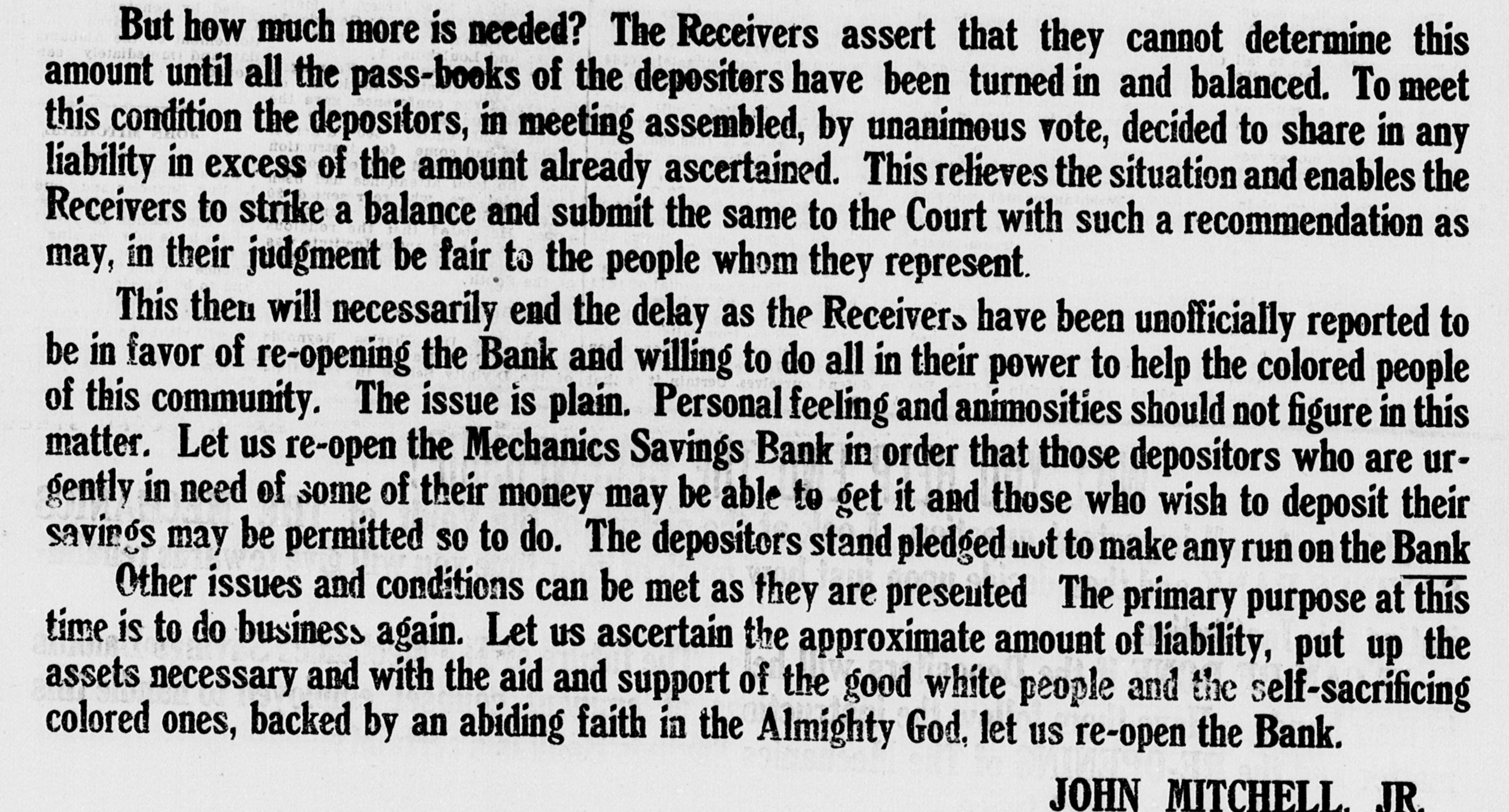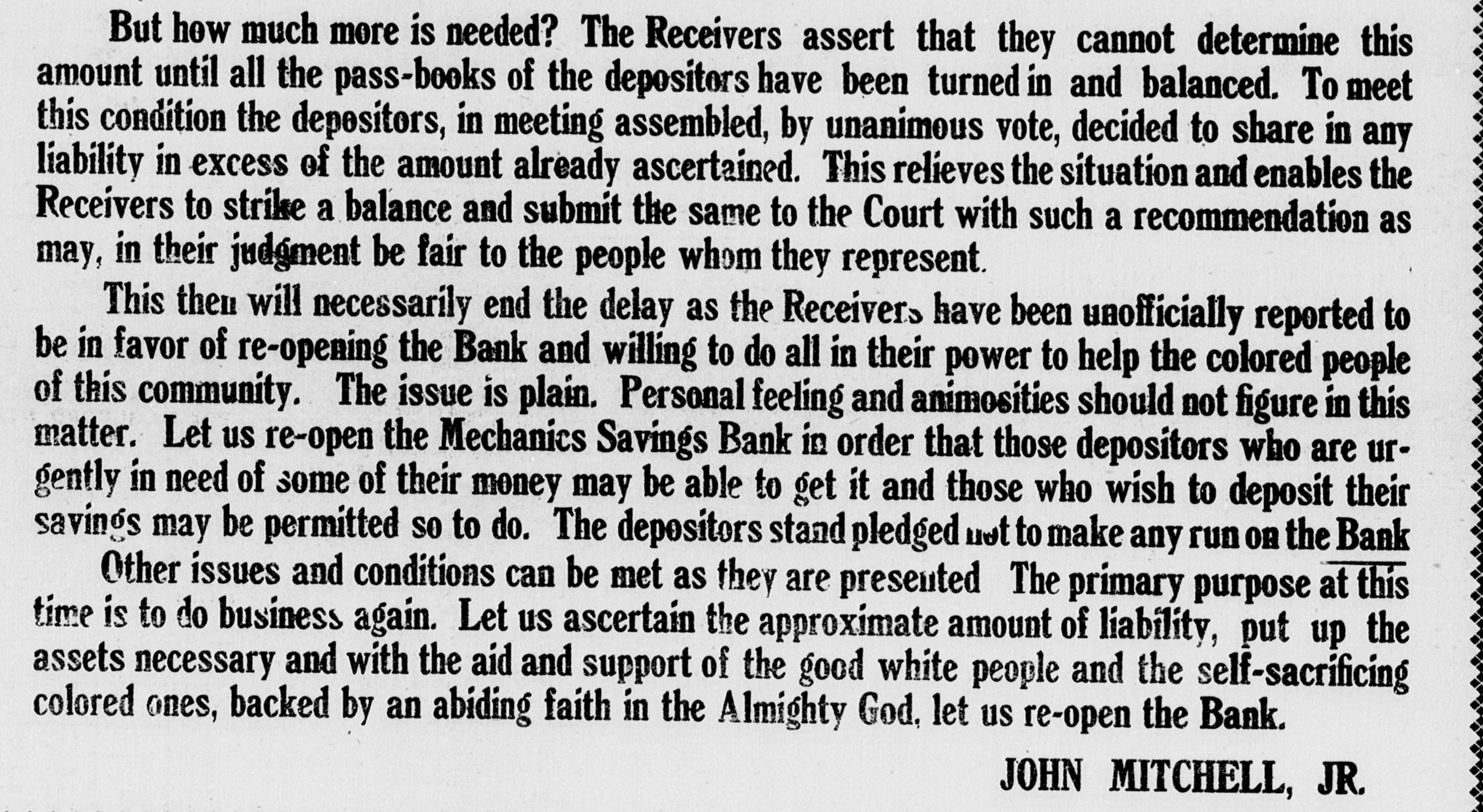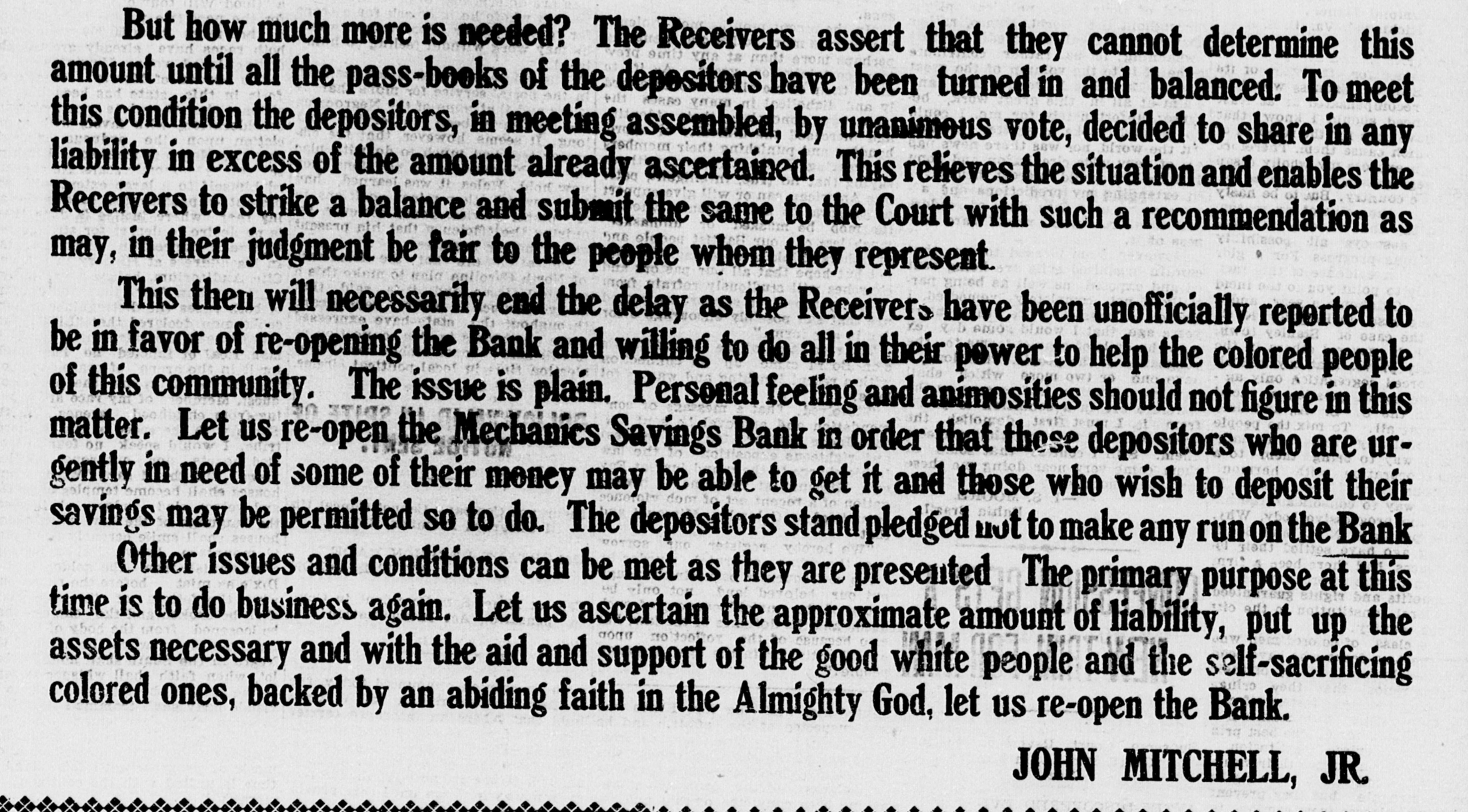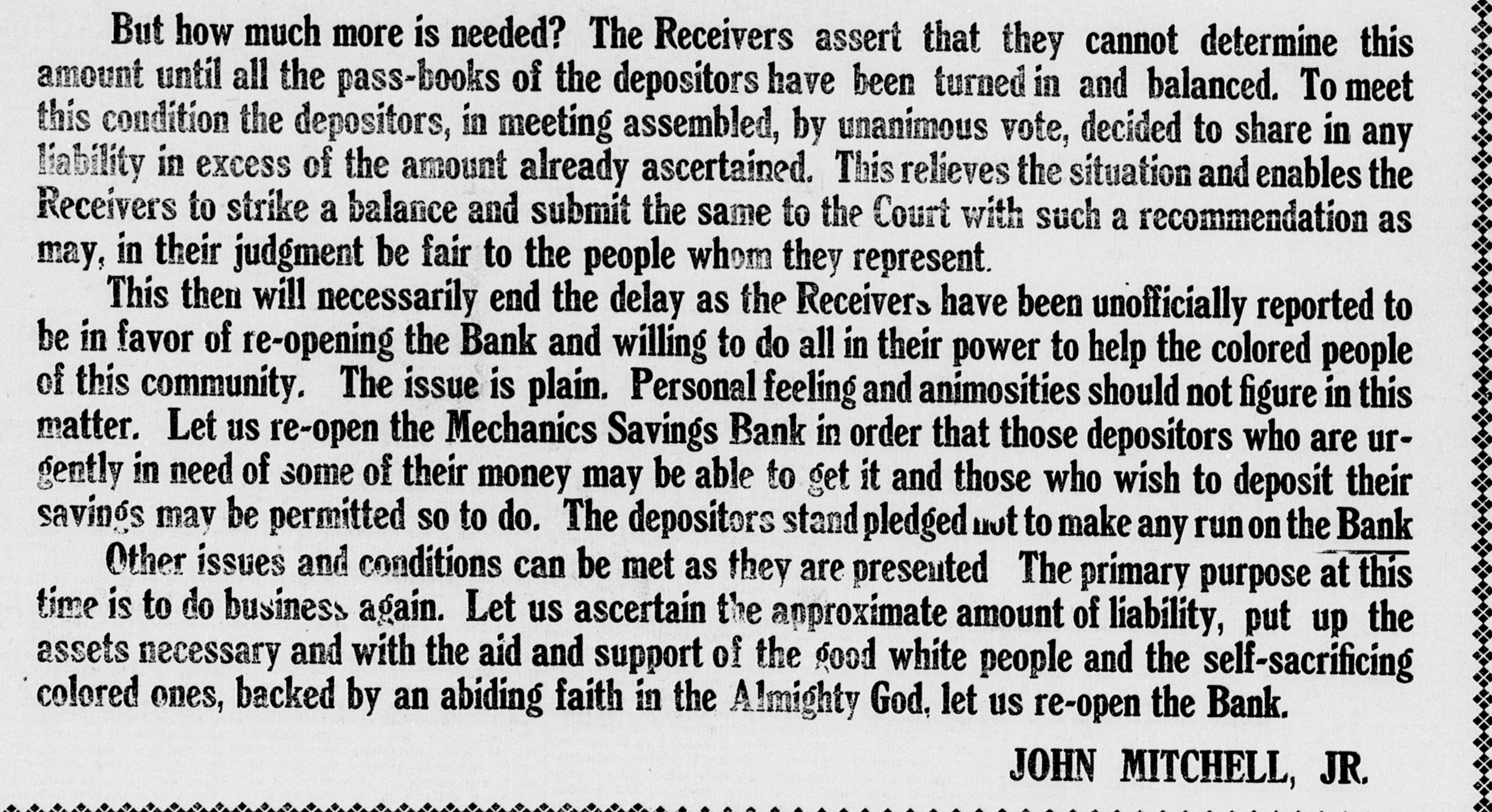 But how much more is needed? The Receivers assert that they cannot determine this amount until all the pass-books of the depositors have been turned in and balanced. To meet this condition the depositors, in meeting assembled, by unanimous vote, decided to share in any liability in excess of the amount already ascertained. This relieves the situation and enables the Receivers to strike a balance and submit the same to the Court with such a recommendation as may, in their judgment be fair to the people whom they represent. This then will necessarily end the delay as the Receivers have been unofficially reported to be in favor of re-opening the Bank and willing to do all in their power to help the colored people of this community. The issue is plain. Personal feeling and animosities should not figure in this matter. Let us re-open the Mechanics Savings Bank in order that those depositors who are urgently in need of some of their money may be able to get it and those who wish to deposit their savings may be permitted so to do. The depositors stand pledged not to make any run OR the Bank Other issues and conditions can be met as they are presented The primary purpose at this time is to do business again. Let us ascertain the approximate amount of liability, put up the assets necessary and with the aid and support of the good white people and the self-sacrificing colored ones, backed by an abiding faith in the Almighty God, let us re-open the Bank. JOHN MITCHELL, JR.