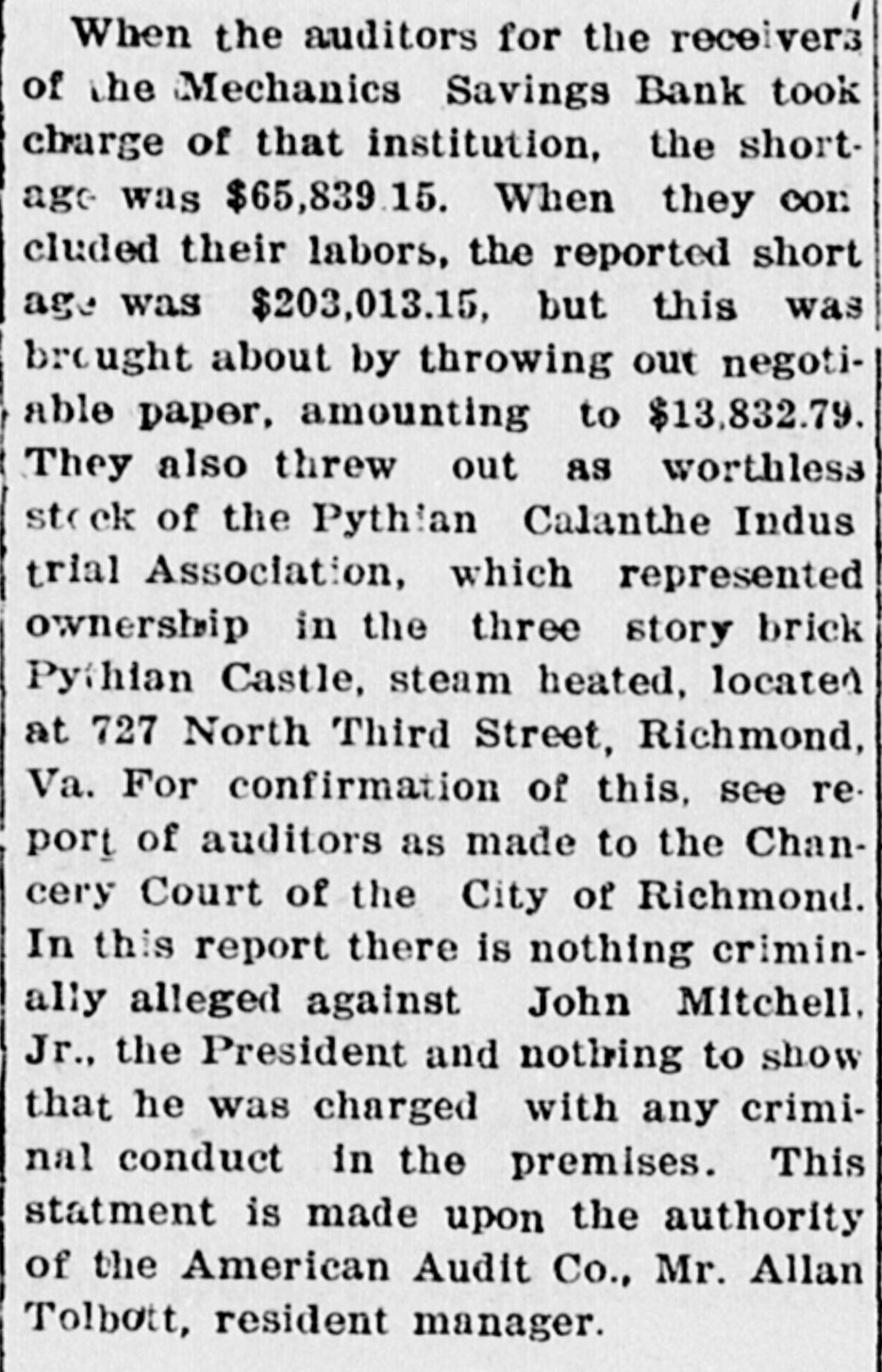 They also threw out as worthless stock of the Pythian Calanthe Industrial Association, which represented ownership in the three story brick Pythian Castle, steam heated, located at 727 North Third Street, Richmond, Va. For confirmation of this, see report of auditors as made to the Chancery Court of the City of Richmond. In this report there is nothing criminally alleged against John Mitchell, Jr., the President and nothing to show that he was charged with any criminal conduct in the premises. This statment is made upon the authority of the American Audit Co., Mr. Allan Tolbott, resident manager.