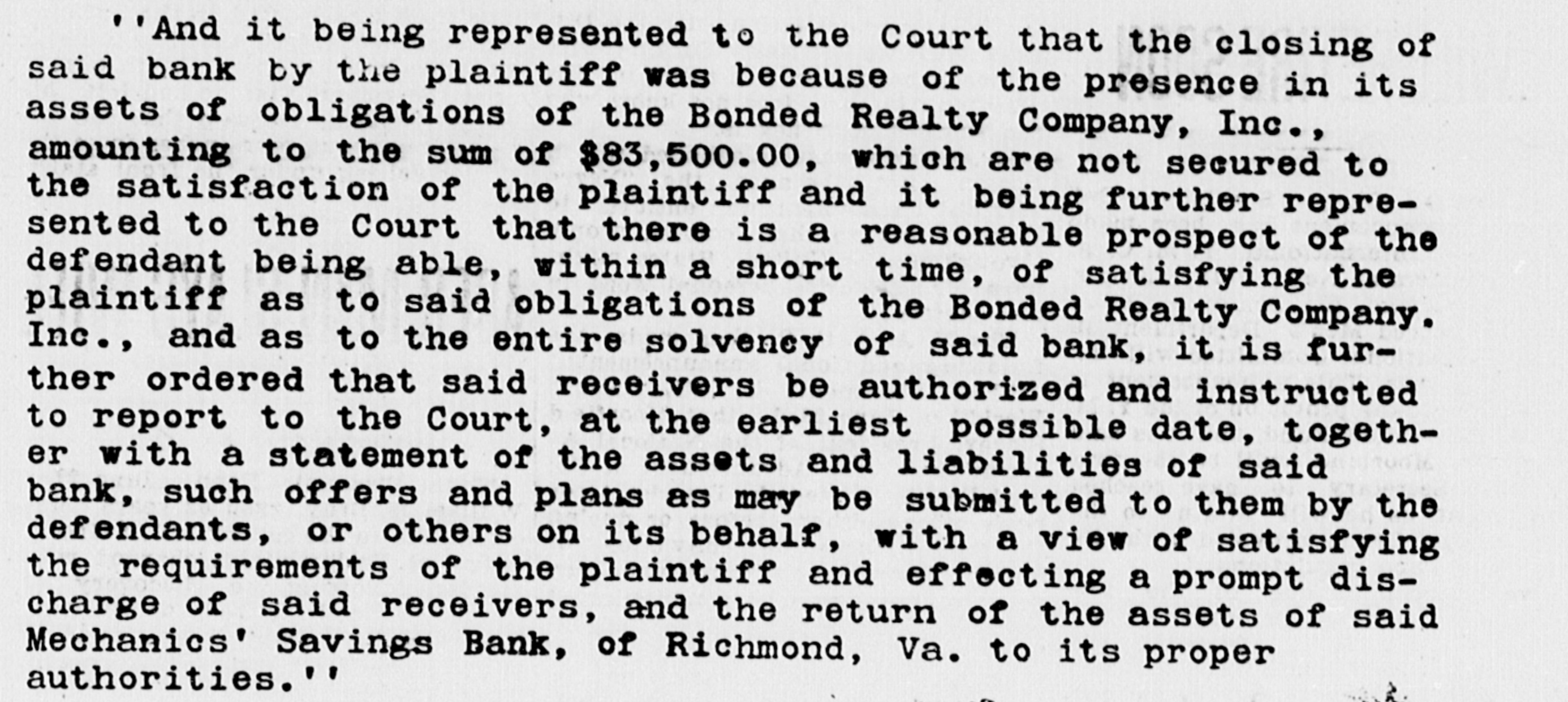 RALLY TO AID OF MECHANICS' BANK Richmond Institutions Ready to Advance Up to $100,000. APPOINTS RECEIVERS J. R. Tucker and James W. Gordon Named by Judge Moncure. With the banks of Richmond ready to advance any amount up to $100,000 with which to meet the temporary needs, on condition that adequate collateral be given-and the officials of the institution are ready. they say, to give the required security promptly-indications - are that the Mechanics' Savings Bank. colored Institution at 214 East Clay Street. that was closed last Saturday afternoon by order of the State Corporation Commission. will shortly reopen for business. The Richmond Clearing-House Association, in meeting yesterday with officials of the banking division of the State Corporation Commission. discussed plans for reopening the bank and, as evidence of confidence in the colored banking institution, it was agreed to advance the necessary amount for the operation of the bank If proper security is deposited for the loan. Harry M. Smith. Jr., attorney for the Mechanics' Savings Bank stated last night that his clients. are ready to put up the necessary collateral and that all conditions will be met without delay. He said affairs will be put in such shape that the bank may be reopened as soon as the recelvers appointed yesterday by Judge Moncure, in Chancery Court, make their report. The receivers named by Judge Moncure were J. R. Tucker and James W. Gordon. They gave bond in the sum of $50,000. Moncare Issues Decree. The decree issued by Judge Moncure, 1r. appointing the receivers, follows: "And it being represented to the court that the closing of said bank by the plaintiff was because of the presence in its assets of obligations of the Bonded Realty Co., Inc., amounting to the sum of $83,500. which are not secured to the satisfaction of the plaintiff, and it being further represented to the court that there is a reasonable prospect of the defendant being able, within Q short time, of satisfying the plaintiff as to said obligations of the Bonded Realty Co., Inc., and as to the entire solvency of said bank, it in further ordered that said receivers be authorized and instructed to report to the court, at the earliest possible date, together with a statement of the assets 2nd liabilities of said bank, such offers and plans as may be submitted to them by the defendants, or others on (Continued on Page 2, CoL 6.)