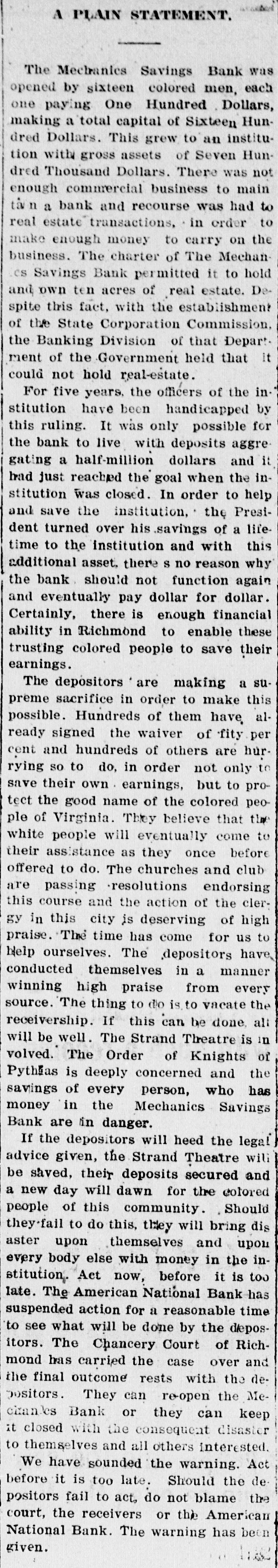 STATEMENT. The Mechanics Savings Bank was opened by sixteen colored men, each one paying One Hundred Dollars, making a total capital of Sixteen Hundred Dollars. This grew to an institution with gross assets of Seven Hundred Thousand Dollars. There was not enough commercial business to main ta n a bank and recourse was had to real estate transactions, in order to make enough money to carry on the business. The charter of The MechanCS Savings Bank permitted it to hold and own ten acres of real estate. Despite this fact, with the establishment of the State Corporation Commission. the Banking Division of that Department of the Government held that it could not hold real-estate. For five years, the officers of the institution have been handicapped by this ruling. It was only possible for the bank to live with deposits aggre. gating a half-million dollars and it had just reached the goal when the institution was closed. In order to help and save the institution, the President turned over his savings of a lifetime to the institution and with this additional asset, there S no reason why the bank should not function again and eventually pay dollar for dollar. Certainly, there is enough financial ability in Richmond to enable these trusting colored people to save their earnings. The depositors are making a supreme sacrifice in order to make this possible. Hundreds of them have already signed the waiver of fity per cent and hundreds of others are hurrying so to do, in order not only to save their own earnings, but to protect the good name of the colored people of Virginia. They believe that the white people will eventually come to their assistance as they once before offered to do. The churches and club are passing resolutions endorsing this course and the action of the clergy in this city is deserving of high praise. The time has come for us to Help ourselves. The depositors have conducted themselves in a manner winning high praise from every source. The thing to do is to vacate the receivership. If this can be done, all will be well. The Strand Theatre is in volved. The Order of Knights of Pythias is deeply concerned and the savings of every person, who has money in the Mechanics Savings Bank are in danger. If the depositors will heed the legal advice given, the Strand Theatre will be saved, their deposits secured and a new day will dawn for the colored people of this community. Should they-fail to do this, they will bring dis aster upon themselves and upon every body else with money in the institution. Act now, before it is too late. The American National Bank has suspended action for a reasonable time to see what will be done by the depositors. The Chancery Court of Richmond has carried the case over and the final outcome rests with the depositors. They can re-open the Mechanles Bank or they can keep it closed with the consequent disaster to themselves and all others interested. We have sounded the warning. Act before it is too late. Should the de positors fail to act, do not blame the court, the receivers or the American National Bank. The warning has been given.