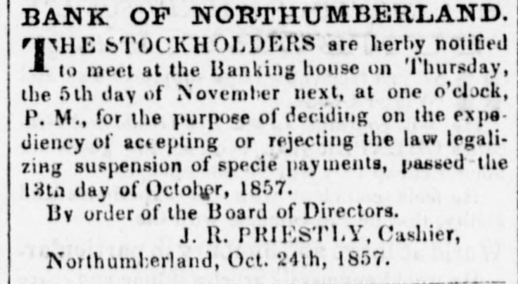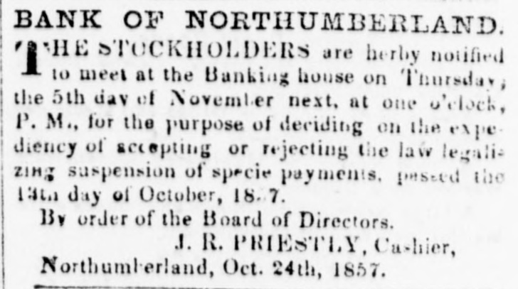 BANK OF NORTHUMBERLAND. THE The The herby notified on Thursday, the 5th day of November next, at one o'elock, P. M., for the purpose of deciding on the expediency of accepting or rejecting the law legalis ZIHG suspension of specie payments, passed the 13th day of October, 18.7. By order of the Board of Directors. J. R. PRIESTLY, Cashier, Northumberland, Oct. 24th, 1857.