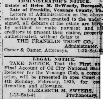 Estate Helen M. DeWoody, Deceased, Late of Franklin, Venango County, on the above estate having all been the underdebtors the estate are notified to and creditors to present their claims, properly THE FRANKLIN TRUST CO., Osmer & LEGAL NOTICE. TAKE That First Final of Oil City National Banl Receiver for the Venango Club, be in open Court 4th February, 1930, for ELIZABETH M. SWYERS, 1-15-Sat-4t