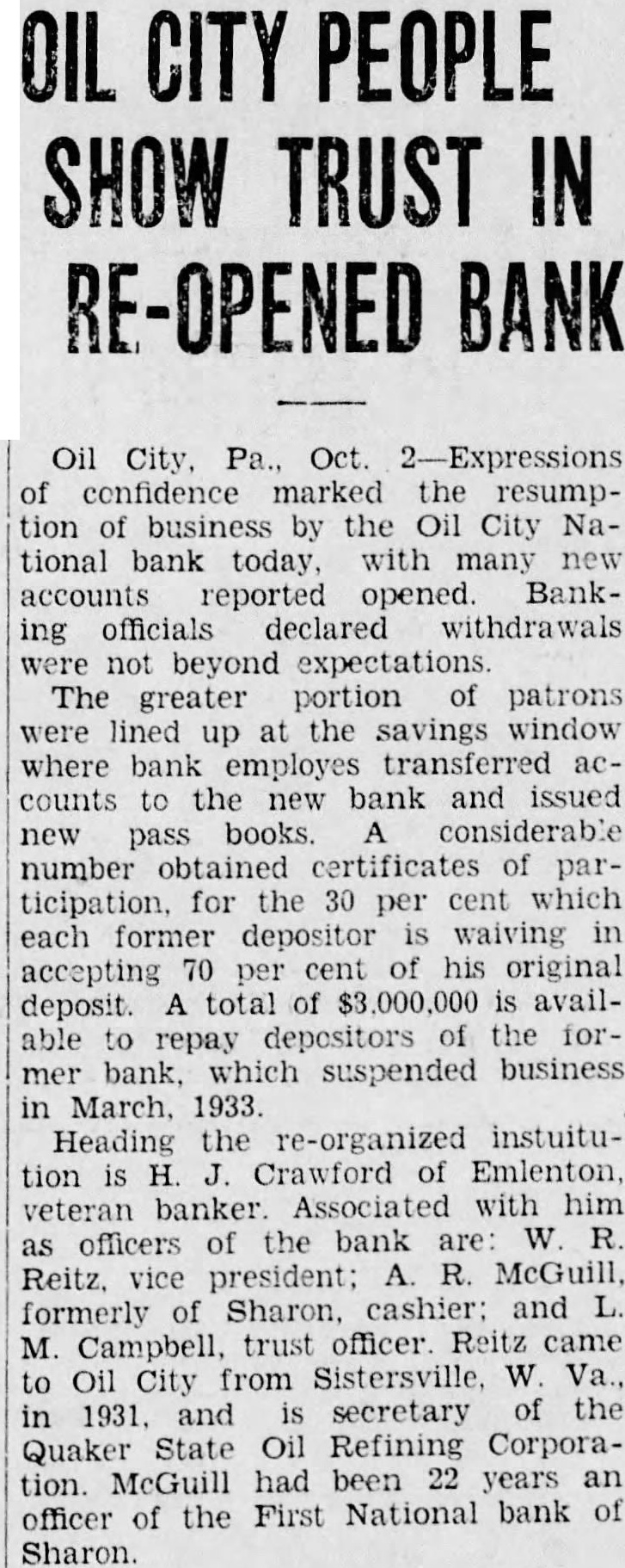 OIL CITY PEOPLE SHOW TRUST IN RE-OPENED BANK Oil City, Pa., Oct. 2-Expressions of confidence marked the resumption of business by the Oil City National bank today, with many new accounts reported opened. Banking officials declared withdrawals were not beyond expectations The greater portion of patrons were lined up at the savings window where bank employes transferred accounts to the new bank and issued new pass books. A considerable number obtained certificates of participation, for the 30 per cent which each former depositor is waiving in accepting 70 per cent of his original deposit. A total of $3,000,000 is available to repay depositors of the former bank, which suspended business in March. 1933. Heading the re-organized instuitution is H. J. Crawford of Emlenton. veteran banker Associated with him as officers of the bank are W R Reitz. vice president: A. R. McGuill, formerly of Sharon. cashier: and L. M. Campbell, trust officer. Reitz came to Oil City from Sistersville, W. Va., in 1931. and is secretary of the Quaker State Oil Refining Corporation. McGuill had been 22 years an officer of the First National bank of Sharon.