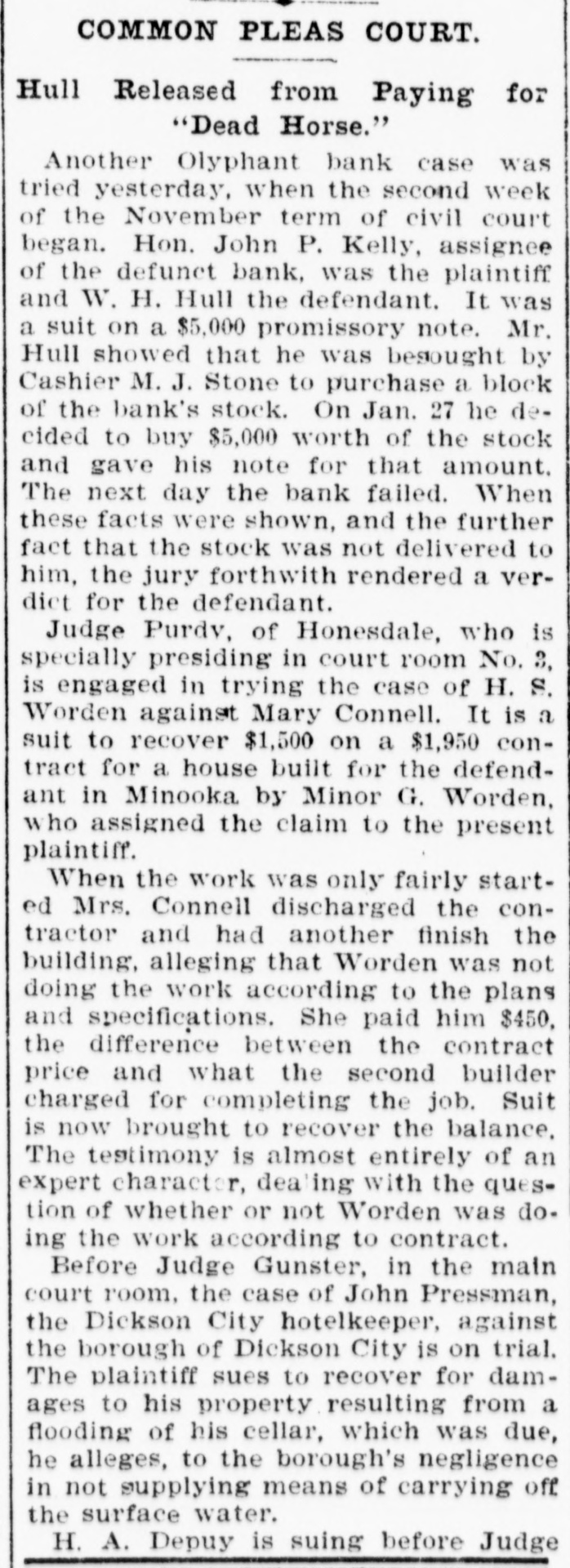 COMMON PLEAS COURT. Hull Released from Paying for "Dead Horse." Another Olyphant bank case was tried yesterday, when the second week of the November term of civil court began. Hon. John P. Kelly, assignee of the defunct bank, was the plaintiff and W. H. Hull the defendant. It was a suit on a $5,000 promissory note. Mr. Hull showed that he was besought by Cashier M. J. Stone to purchase a block of the bank's stock. On Jan. 27 he decided to buy $5,000 worth of the stock and gave his note for that amount. The next day the bank failed. When these facts were shown, and the further fact that the stock was not delivered to him, the jury forthwith rendered a verdiet for the defendant. Judge Purdy, of Honesdale, who is specially presiding in court room No. 3, is engaged in trying the case of H. S. Worden against Mary Connell. It is a suit to recover $1,500 on a $1,950 contract for a house built for the defendant in Minooka by Minor G. Worden, who assigned the claim to the present plaintiff. When the work was only fairly started Mrs. Connell discharged the contractor and had another finish the building, alleging that Worden was not doing the work according to the plans and specifications. She paid him $450. the difference between the contract price and what the second builder charged for completing the job. Suit is now brought to recover the balance, The testimony is almost entirely of an expert character, dealing with the question of whether or not Worden was doing the work according to contract. Before Judge Gunster, in the main court room, the case of John Pressman, the Dickson City hotelkeeper, against the borough of Dickson City is on trial. The plaintiff sues to recover for damages to his property resulting from a flooding of his cellar, which was due, he alleges, to the borough's negligence in not supplying means of carrying off the surface water. H. A. Depuy is suing before Judge