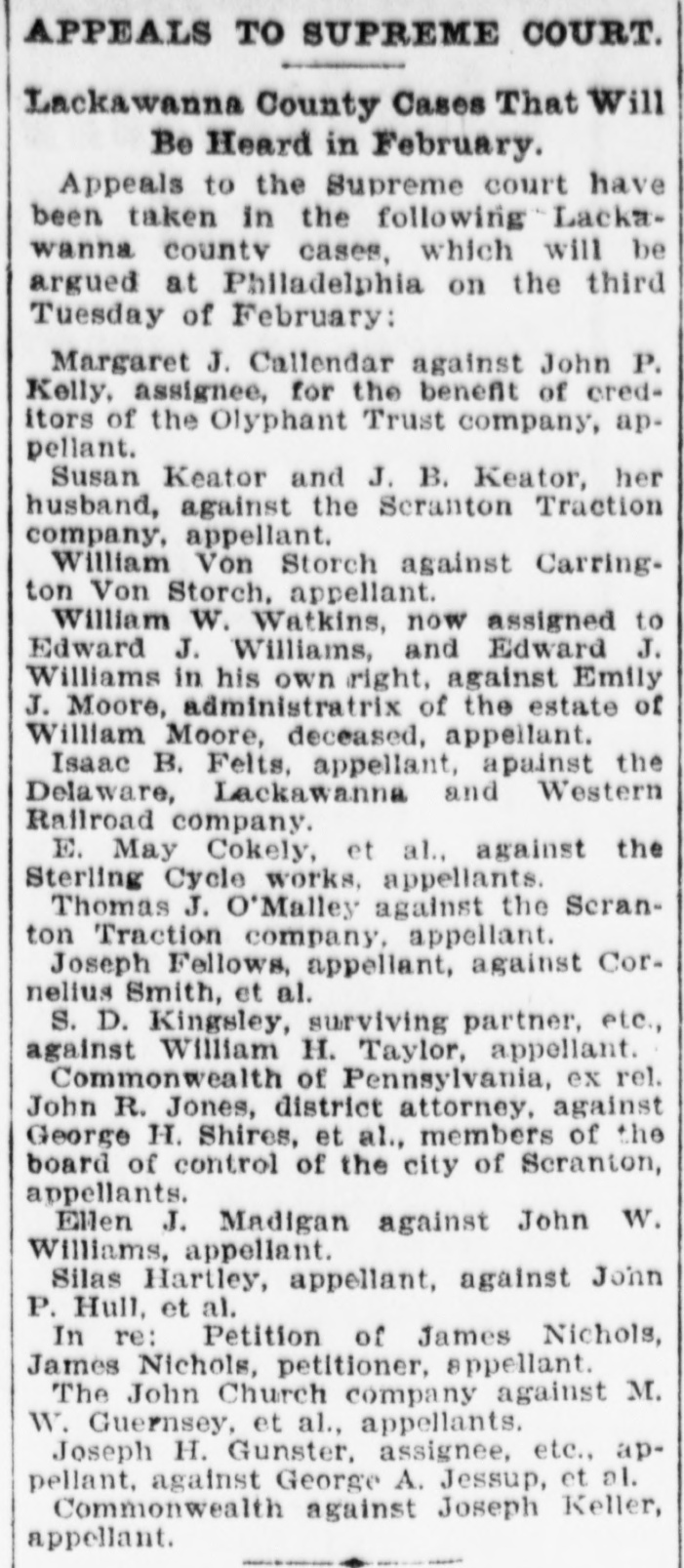 COURT HOUSE NEWS NOTES. Court allowed an appeal from the probate of the alleged will of John Faurot and from the decision of the register refusing to strike off the probate. In the case of John H. Solomon, to the use of Thomas H. Sey, against Ellen O'Sulilvan, a rule was granted on the defendant to show cause why the appeal should not be stricken off. Attorney A. A. Vosburg was appointed auditor to distribute the funds of the estate of John Luce, jr., deceased, and Attorney Richard J. Bourke was appointed to perform a similar office in the estate of Sarah J. Hopkins, deceased. Michael J. Byrne was appointed minority inspector of the Fourth ward of Olyphant in place of John O'Neill, and M.J Hutchins was named as judge of election of the First ward of Olyphant to succeed Michael Cannon, resigned. On the ground of cruel and barbarous treatment, Bertha Stevens, Saturday filed a petition asking for divorce from her husband Wallace W. Stevens. They were married Dec. 27. 1894. Both parties reside in Scranton. Vosburg & Dawson are attorneys for the libellant. Attorney John R. Edwards was appointed auditor to distribute the funds of the assigned Olyphant Trust company. . A rule for a new trial was granted in the case of Farrar & Trefts against William Silkman. which was won by the plaintiff at the first week's session of present term of common pleas. out in court again in the cropped The old Olyphant alternative borough Saturday bother the shape of a writ of man) damus issued against Burgess Thomas Patton and Borough Clerk W. J. Schubmehl. to compel them to show cause why they refuse to draw a warrant for the a salary of the borough sécretary. J. A. 1 Dolphin. after the same had been duly approved by council. Mr. Dolphin's claim 1 is for one year and three months' services and amounts to $93.75. Arguments l' will be heard Jan. 31. The amount of the verdict for Thomas O'Malley in his case against the Serane ton Traction company, of which announcement was made in Saturday's Tribune, was $4,557.75. In the case of r Vrioli McDonnell against the Traction company the verdict was for the plaintiff. but the victory was virtually on the side of the Traction company the 5 amount of the verdict being merely $10. It is also a conditional verdict, Judge Love having reserved certain law points for further consideration. The third and final week of the January term of common pleas which begins today will be presided over by Judges Archabid and Edwards in the main court and court room No. 2, respectively, and Judge George S. Purdy, of the HonesdalePike district in the Superior court room. Among the cases set down for trial is the repeatedly postponed divorce suit of is W. L. Jones against L. W. Jones. It the last case on the list for this week. Two damage suits were instituted Saturday. The heirs of Peter Larkin, deceased, brought suit through Attorneys I. H. Burns and M. F. Sando against the city of Carbondale and the CarbonTraction company for damages claim has been by reason of dale their which property they grading caused the city's done to by the Traction company with . authority. The other case is a $10,000 suit in which Chester M. Butts is plaintiff and the Scranton Savings bank defendant. The cause of action was not stated. e A. J. Colborn represents Mr. Butts.
