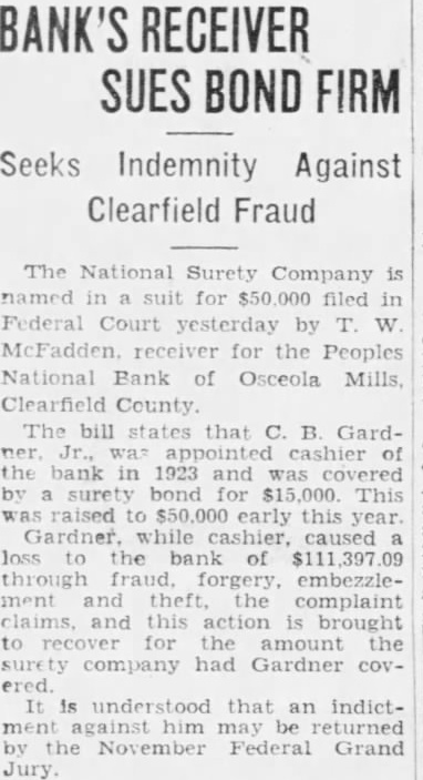 BANK'S RECEIVER SUES BOND FIRM Seeks Indemnity Against Clearfield Fraud The National Surety Company is named in a suit for $50,000 filed in Federal Court yesterday by T. W McFadden. receiver for the Peoples National Bank of Osceola Mills. Clearfield County. The bill states that C. B Gardner. Jr., was appointed cashier of the bank in 1923 and was covered by surety bond for $15,000. This was raised to $50,000 early this year Gardner. while cashier, caused a loss to the bank of $111,397.09 through fraud. forgery. embezzlement and theft, the complaint claims, and this action is brought to recover for the amount the surety company had Gardner COVered. It is understood that an indictment against him may be returned by the November Federal Grand Jury.