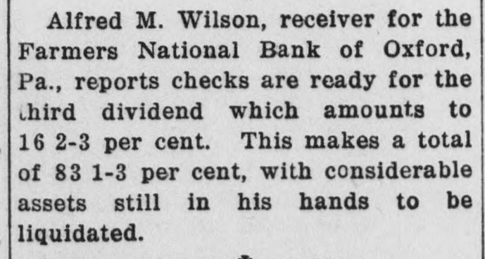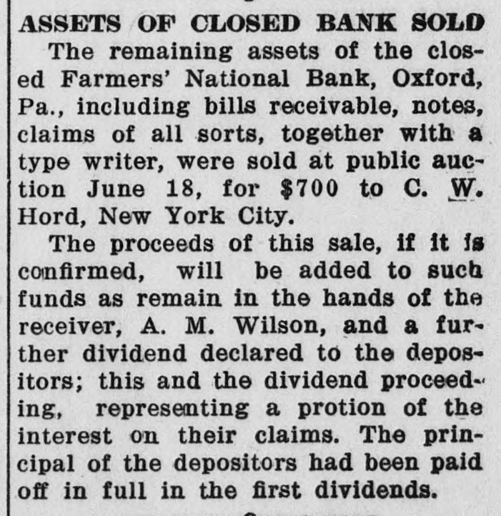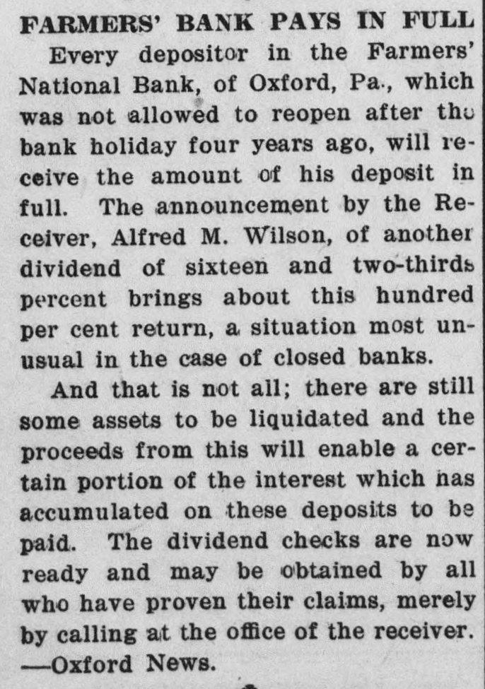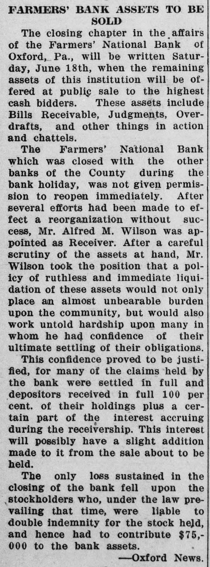 FARMERS' BANK ASSETS TO BE SOLD The closing chapter in the affairs of the Farmers' National Bank of Oxford, Pa., will be written Saturday, June 18th, when the remaining assets of this institution will be offered at public sale to the highest cash bidders. These assets include Bills Receivable, Judgments, Overdrafts, and other things in action and chattels. The Farmers' National Bank which was closed with the other banks of the County during the bank holiday, was not given permission to reopen immediately. After several efforts had been made to effect a reorganization without success, Mr. Alfred M. Wilson was appointed as Receiver. After a careful scrutiny of the assets at hand, Mr. Wilson took the position that a policy of ruthless and immediate liquidation of these assets would not only place an almost unbearable burden upon the community, but would also work untold hardship upon many in whom he had confidence of their ultimate settling of their obligations. This confidence proved to be justified, for many of the claims held by the bank were settled in full and depositors received in full 100 per cent. of their holdings plus a certain part of the interest accruing during the receivership. This interest will possibly have a slight addition made to it from the sale about to be held. The only loss sustained in the closing of the bank fell upon the stockholders who, under the law prevailing that time, were liable to double indemnity for the stock held, and hence had to contribute $75,000 to the bank assets. -Oxford News.
