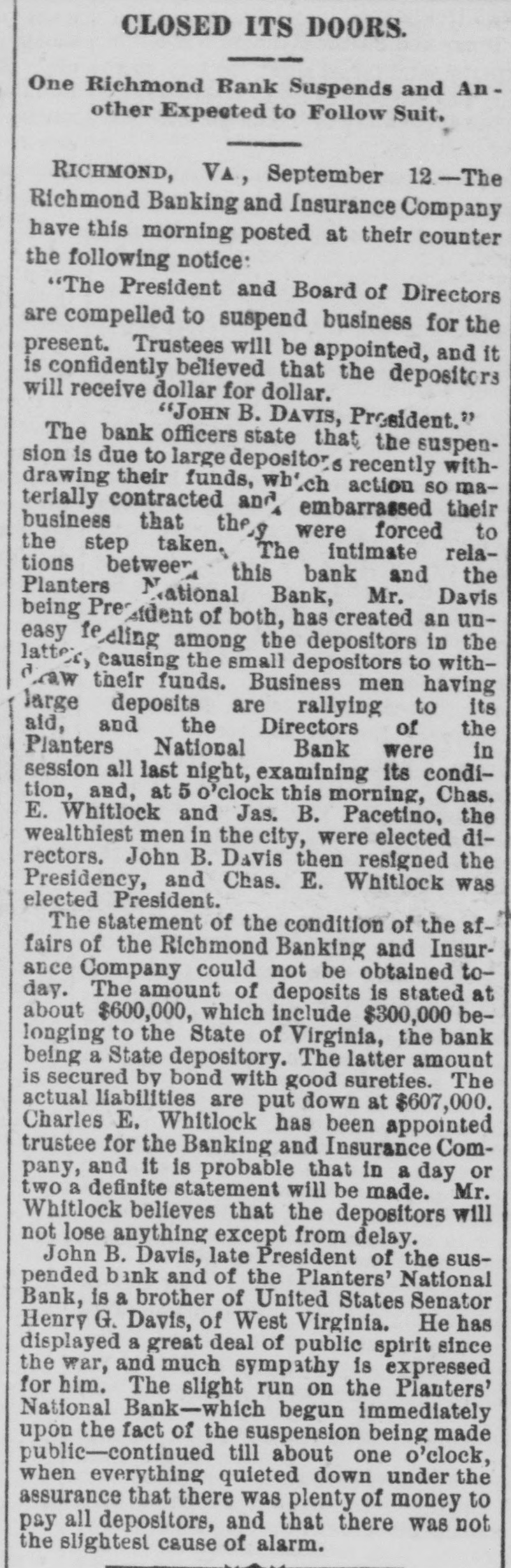 Bank Suspension in Richmond. RICHMOND, VA., Sept. 12.-The Richmond Bank. ing and Insurance company have this morning posted at their counter the following notice: The president and board or directors are compelled to suspend business for the present. Trustees will be appointed and it is confidently believed that de. positors will receive dollar for dollar. (Signed,) JOHN B. Davis, President. The bank officers state that the cause of the sus. pension is due to large depositors recently with. drawing their funds. The intimate relations be. tween this bank and the Planters' National Bank (Mr. Davis being president of both) has created uneasy feeling among the depositors in the latter, causing small depositors to withdraw their funds. Business men having large deposits are rallying to its aid. -The directors of the Planters' National Bank were in session all last night examining its condition, and at five o'clock this morning Chas. E. Whitlock and James B. Pace, two of the wealthiest men in the city, were elected directors. John B. Davis then resigned the presidency and Chas. E. Whitlock was elected president.