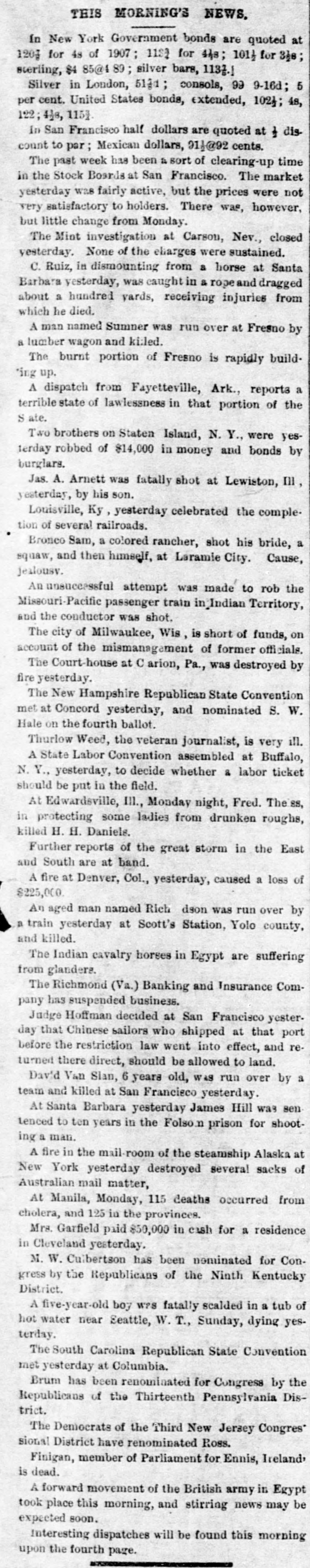 THIS MORNING'S NEWS, In New York Government bonds are quoted at 120g for 4s of 1907; 1132 for 448; 101 for 3)s sterling, $4 85@4 89; silver bars, 1133.1 Silver in London, 5131; consols, 99 9-16d; 5 per cent. United States bonds, extended, 102}; 4s, 122; 418, 1151 in San Francisco half dollars are quoted at & discount to par; Mexican dollars, 911@92 cents. The past week has been a sort of clearing-up time in the Stock Boards at San Francisco. The market yesterday was fairly active, but the prices were not very satisfactory to holders. There was, however, but little change from Monday. The Mint investigation at Carson, Nev., closed yesterday. None of the charges were sustained. C. Ruiz, in dismounting from a horse at Santa Barbara yesterday, was caught in a rope and dragged about a hundred yards, receiving injuries from which he died. A man named Summer was run over at Fresno by a lumber wagon and killed. The burnt portion of Fresno is rapidly build*ing up. A dispatch from Fayetteville, Ark., reports a terrible state of lawlessness in that portion of the Sate. Two brothers on Staten Island, N. Y., were yes1erday robbed of $14,000 in money and bonds by burglars. Jas. A. Arnett was fatally shot at Lewiston, III, yesterday, by his son. Louisville, Ky, yesterday celebrated the completion of several railroads. Bronco Sam, a colored rancher, shot his bride, a squaw, and then himself, at Laramie City. Cause, jealousy. An unsuccessful attempt was made to rob the Missouri-Pacific passenger train in_Indian Territory, and the conductor was shot. The city of Milwaukee, Wis, is short of funds, on account of the mismanagement of former officials. The Court-house at Carion, Pa., was destroyed by fire yesterday. The New Hampshire Republican State Convention met at Concord yesterday, and nominated S. W. Hale on the fourth ballot. Thurlow Weed, the veteran journalist, is very ill. A State Labor Convention assembled at Buffalo, N. Y., yesterday, to decide whether & labor ticket should be put in the field. At Edwardsville, III., Monday night, Fred. The 88, in protecting some ladies from drunken roughs, killed H. H. Daniels. Further reports of the great storm in the East and South are at band. A fire at Denver, Col., yesterday, caused a loss of $225,000. An aged man named Rich dson was run over by a train yesterday at Scott's Station, Yolo county. and killed. The Indian cavalry horses in Egypt are suffering from glandere. The Richmond (Va.) Banking and Insurance Company has suspended business. Judge Hoffman decided at San Francisco yesterday that Chinese sailors who shipped at that port before the restriction law went into effect, and returned there direct, should be allowed to land. David Van Sian, 6 years old, was run over by a team and killed at San Francisco yesterday. At Santa Barbara yesterday James Hill was sen tenced to ten years in the Folso: prison for shooting man. A fire in the mail-room of the steamship Alaska at New York yesterday destroyed several sacks of Australian mail matter, At Manila, Monday, 115 deaths occurred from cholera, and 125 in the provinces. Mrs. Garfield paid 850,000 in cash for a residence in Cleveland yesterday. M. W. Cuibertson has been nominated for Congress by the Republicans of the Ninth Kentucky District. A five-year-old boy W2S fatally scalded in a tub of hot water near Seattle, W. T., Sunday, dying yesterday. The South Carolina Republican State Convention met yesterday at Columbia. Brum has been renominated for Congress by the Republicans of the Thirteenth Pennsylvania District. The Democrats of the Third New Jersey Congres* sional District have renominated Ross. Finigan, member of Parliament for Ennis, Ireland is dead. A forward movement of the British army in Egypt took place this morning, and stirring news may be expected soon. interesting dispatches will be found this morning upon the fourth page.