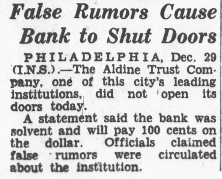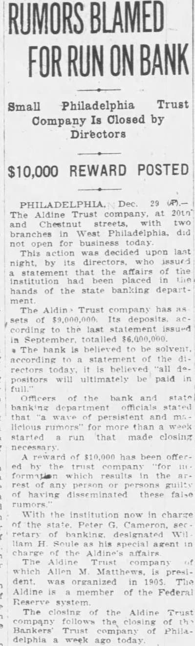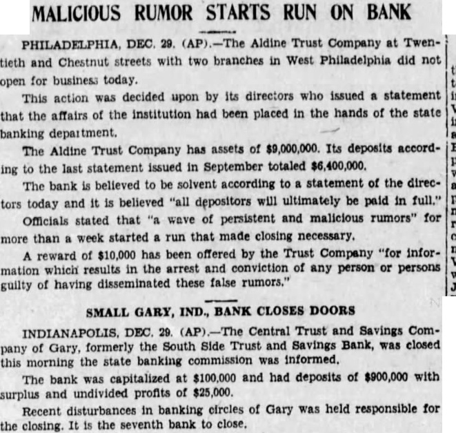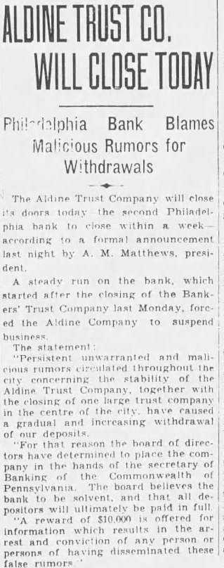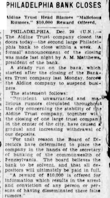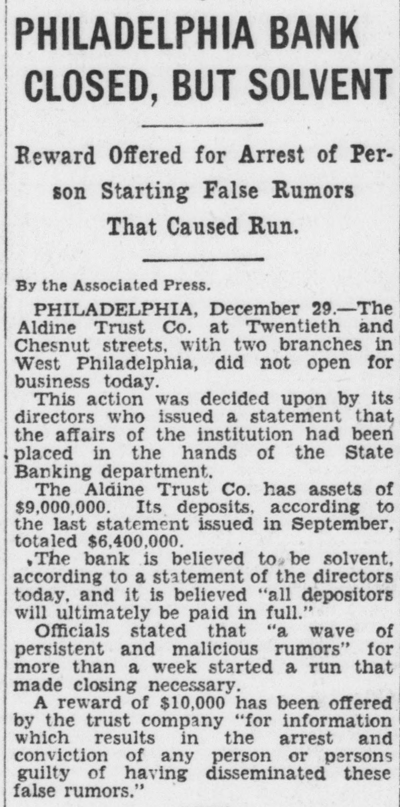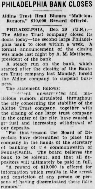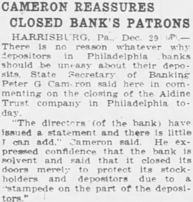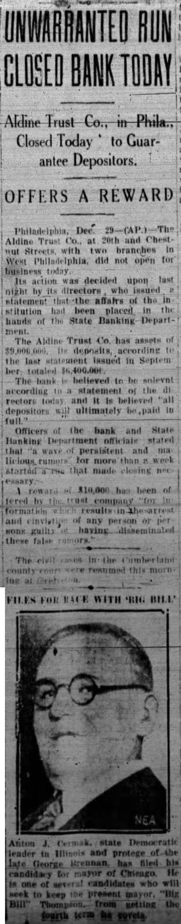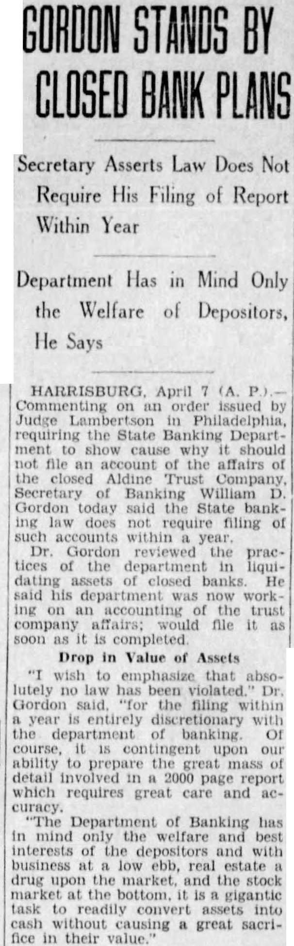 DEPOSITORS ARE TO RECEIVE SUM OF $7,000,000 Banks of Phil Are to Be Saved and Special Liq= uidation Will Accom= plish It Philadelphia, Oct 14. -(UP)Several bright spots were seen today in the serious banking situation of Philadelphia. Dr William D. Gordon, state secretary of banking, announced that prompt payment of $7,000,000 would be made to more than 125,000 depositors in three closed banks of the city. A 20 per cent dividend will be made to the depositors of each of the three banks, the Bankers Trust company, the Aldine Trust company, and the Darby Bank and Trust company. The payments will be made through the creation of a special liquidating private bank headed by John A. McCarthy, vice president of the Real Estate Trust company. The entire staff of the security of banking, augmented by a special force will work day and night preparing dividend checks for the depositors, Dr Gordon said. They will start ta-day. In an effort to save the Integrity Trust company and other solvent Philadelphia banks which have suffered tremendous withdrawals of deposits in the past two weeks a group of Philadelphia banks have formed a credit pool. For the immediate use of the Integrity Trust company, $50,000,000 was made available to the institution. The credit pool was formed by six of the city's largest banks and Drexel & Co bankers, Philadelphia branch of J. P. Morgan & Co. The Integrity Trust company, showed deposits of $42,620,000 at the close of business Saturday, having lost deposits of approximately $10,000,000 through withdrawals in the past two weeks. The bank has resources of over $76,000,000.