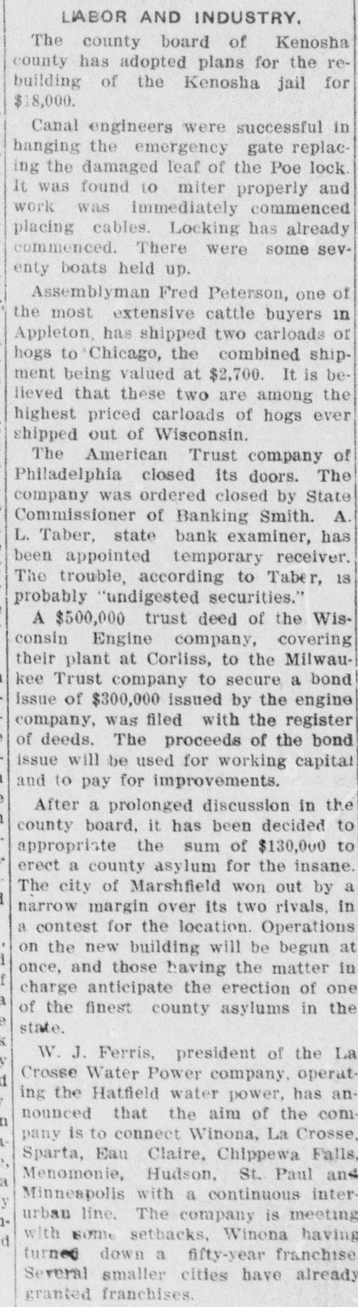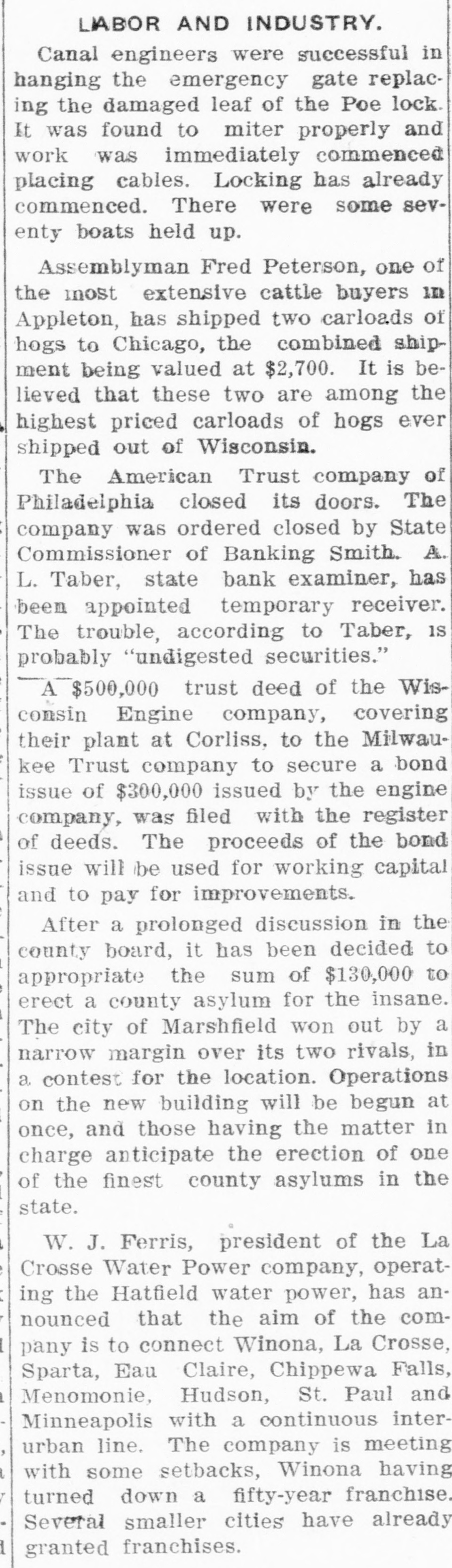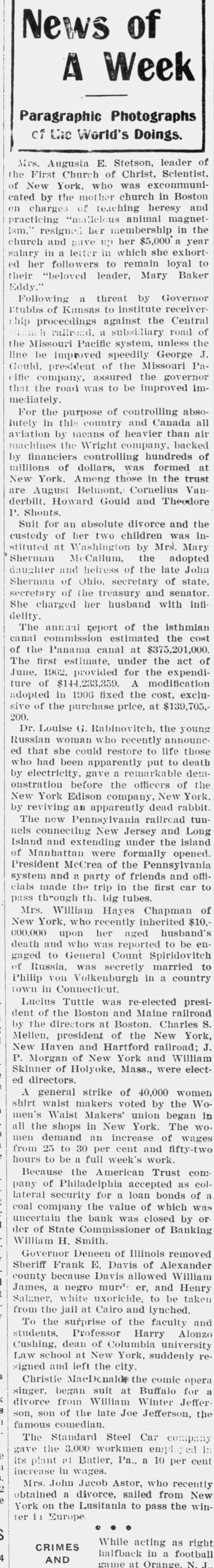 News of A Week Paragraphic Photographs of the World's Doings. Mrs. Augusta E. Stetson, leader of the First Church of Christ, Scientist, the mother Boston and on cated of New charges by York, of who teaching church was excommuni- heresy in animal her in the ism," church practicing resigned "malicious membership magnetand gave UY her $5,000 a year a letter in which she exhortto remain to salary ed her in followers loyal their "beloved leader, Mary Baker Eddy." Following a threat by Governor Stubbs of Kansas to institute receiverhip proceedings against the Central March railroad, a subsidiary road of the the J. of the Paline Gould. Missouri be president improved Pacific speedily system, Missouri George unless citic company, assured the governor that the road was to be improved immediately. For the purpose of controlling absolutely in this country and Canada all means air the backed by of aviation machines financiers by Wright controlling of company, heavier hundreds than was at trust New millions August York. of Among Behmont, dollars, those Cornelius in formed the are Vanderbilt. Howard Gould and Theodore P. Shonts. Suit for an absolute divorce and the two inMary Sherman custedy stituted at of McCallum, Washington her children by Mrs. was the adopted daughter and heiress of the late John Sherman of Ohio. secretary of state, secretary of the treasury and senator. She charged her husband with infidelity. The annual report of the isthmian canal commission estimated the cost of the Panama canal at $375,201,000. The first estimate, under the act of June, 1902, provided for the expenditure of $144,233,359. A modification adopted in 1906 fixed the cost, exclusive of the purchase price, at $139,703, 200. Dr. Louise G. Rabinovitch, the young Russian woman who recently announced that she could restore to life those who had been apparently put to death by electricity, gave a remarkable demonstration before the officers of the New York Edison company, New York, by reviving an apparently dead rabbit. The new Pennsylvania railread tunnels connecting New Jersey and Long Island and extending under the island of Manhattan were formally opened. President McCrea of the Pennsylvania system and a party of friends and officials made the trip in the first car to pass through th big tubes. Mrs. William Hayes Chapman of New York, who recently inherited $10,000,000 upon her aged husband's death and who was reported to be engaged to General Count Spiridovitch of Russia, was secretly married to Philip von Volkenburgh in a country town in Connecticut. Lucius Tuttle was re-elected president of the Boston and Maine railroad by the directors at Boston. Charles S. Mellen, president of the New York, New Haven and Hartford railroad; J. P. Morgan of New York and William Skinner of Holyoke, Mass., were elected directors. A general strike of 40,000 women shirt waist makers voted by the Women's Waist Makers' union began in all women wages 30 from the demand 25 shops to in an per New increase cent York. and of The fifty-two hours to be a full week's work. Because the American Trust company of Philadelphia accepted as collateral security for a loan bonds of a coal company the value of which was uncertain the bank was closed by or der of State Commissioner of Banking William H. Smith. Governor Deneen of Illinois removed Sheriff Frank E. Davis of Alexander county because Davis allowed William James, a negro murde er, and Henry Salzner, white uxoricide, to be taken from the jail at Cairo and lynched. To the surprise of the faculty and students, Professor Harry Alonzo Cushing, dean of Columbia university Law school at New York, suddenly resigned and left the city. Christie MacDenalde the comic opera a singer, began suit at Buffalo for divorce from William Winter Jefferson, son of the late Joe Jefferson, the famous comedian. The Standard Steel Car company gave the 3.000 workmen employed in its plant at Butler, Pa., a 10 per cent increase in wages. Mrs. John Jacob Astor, who recently 2 obtained a divorce, sailed from New York on the Lusitania to pass the winter in Europe . $ While acting as right CRIMES halfback in a football 4 AND game at Orange. N.J.