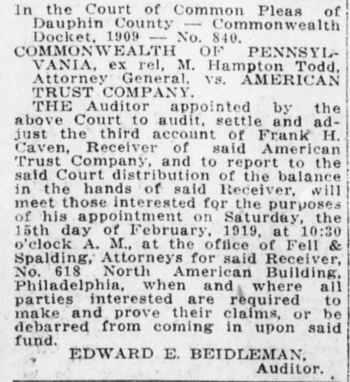 Referee in Bankruptcy. Dated January 23, 1919. In the Court of Common Pleas of Dauphin County - Commonwealth Docket, 1909 - No. 840. COMMONWEALTH OF PENNSYLVANIA, ex rel, M, Hampton Todd, Attorney General, vs. AMERICAN TRUST COMPANY. THE Auditor appointed by the above Court to audit, settle and adjust the third account of Frank H. Caven, Receiver of said American Trust Company, and to report to the said Court distribution of the balance in the hands of said Receiver, will meet those interested for the purposes of his appointment on Saturday, the 15th day of February, 1919, at 10:30 o'clock A. M., at the office of Fell & Spalding, Attorneys for said Receiver, No. 618 North American Building. Philadelphia, when and where all parties interested are required to make and prove their claims, or be debarred from coming in upon said fund. EDWARD E. BEIDLEMAN, Auditor.