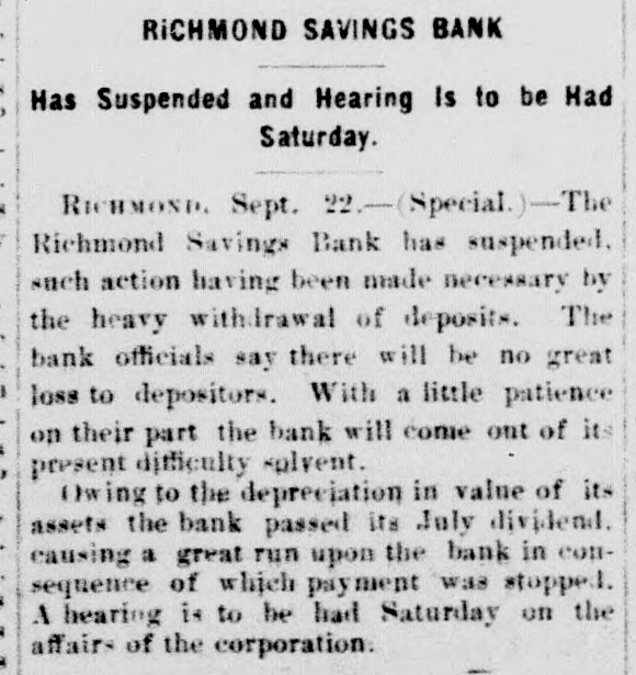 RICHMOND SAVINGS BANK Has Suspended and Hearing Is to be Had Saturday. RICHMOND Sept. 22 ..(Special )-The Richmond Savings Bank has suspended. such action having been made necessary by the heavy withdrawal of deposits. The bank officials say there will be no great loss to depositors. With a little patience on their part the bank will come out of it present difficulty splvent. Owing to the depreciation in value of its assets the bank passed its July dividend. causing a great run upon the bank in consequence of which payment was stopped. A hearing is to be had Saturday on the affairs of the corporation.