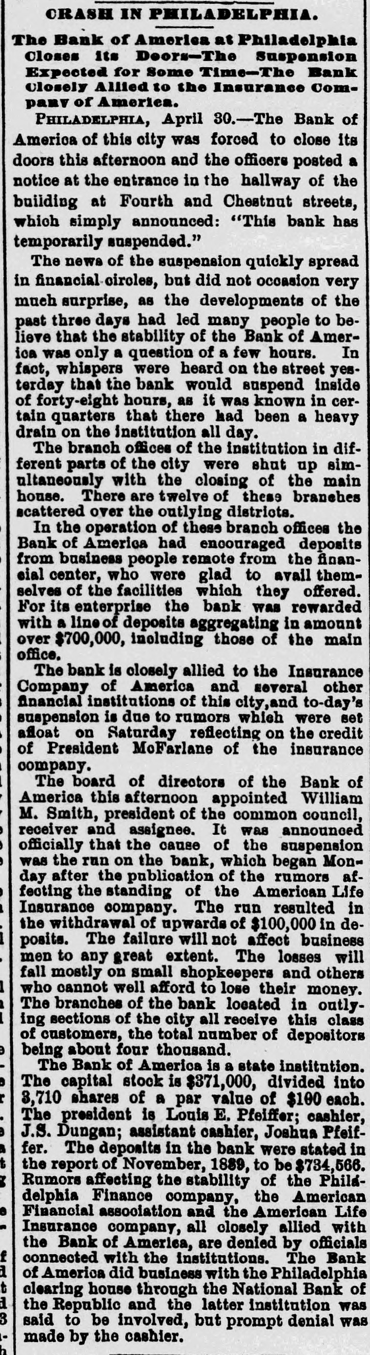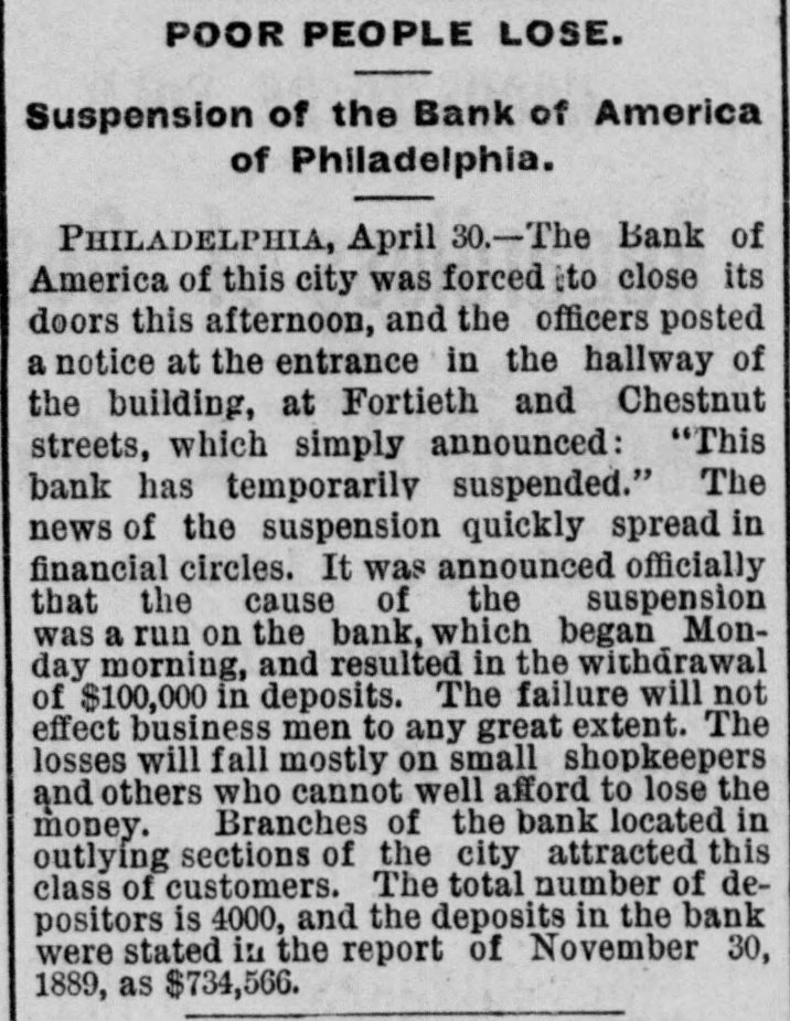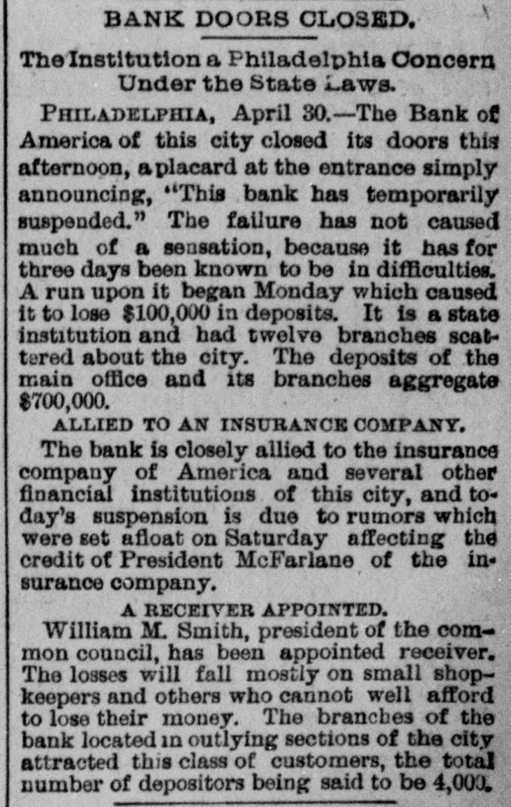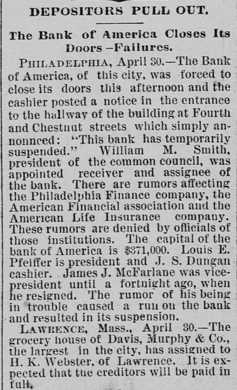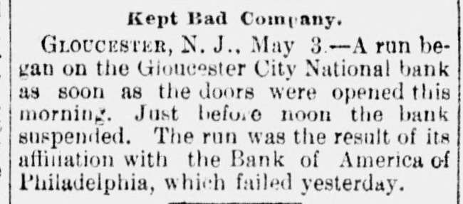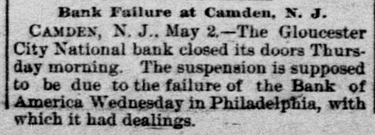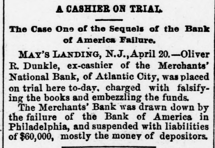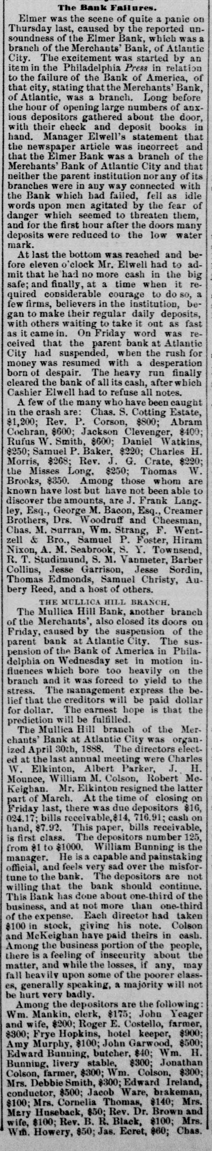The Bank Failures. Elmer was the scene of quite a panic on Thursday last, caused by the reported unsoundness of the Elmer Bank, which was a branch of the Merchants' Bank, of Atlantic City. The excitement was started by an item in the Philadelphia Press in relation to the failure of the Bank of America, of that city, stating that the Merchants' Bank, of Atlantic, was a branch. Long before the hour of opening large numbers of anxious depositors gathered about the door, with their check and deposit books in hand. Manager Elwell's statement that the newspaper article was incorrect and that the Elmer Bank was a branch of the Merchants' Bank of Atlantic City and that neither the parent institution nor any of its branches were in any way connected with the Bank which had failed, fell as idle words upon men agitated by the fear of danger which seemed to threaten them, and for the first hour after the doors many deposits were reduced to the low water mark. At last the bottom was reached and before eleven o'clock Mr. Elwell had to admit that he had no more cash in the big safe; and finally, at a time when it required considerable courage to do so, a few firms, believers in the institution, began to make their regular daily deposits, with others waiting to take it out as fast as it came On Friday word was received that the parent bank at Atlantic City had suspended, when the rush for money was resumed with a desperation born of despair. The heavy run finally cleared the bank of all its cash, after which Cashier Elwell had to refuse all notes. A few of the many who have been caught in the crash are: Chas. S. Cotting Estate, $1,200; Rev. P. Corson, $800; Abram Cochran, $600; Jackson Clevenger, $400; Rufus W. Smith, $600; Daniel Watkins, $250; Samuel P. Baker, $220; Charles H. Morris, $268; Rev. J. G. Crate, $220; the Misses Long, $250; Thomas W. Brooks, $350. Among those whom are known have lost but have not been able to discover the amounts, are J. Frank Langley, Esq., George M. Bacon, Esq., Creamer Brothers, Drs. Woodruff and Cheesman, Chas. M. Surran, Wm. Strang, F. Wentzell & Bro., Samuel P. Foster, Hiram Nixon, A. M. Seabrook, S. Y. Townsend, R. T. Studimund, S. M. Vanmeter, Barber Collins, Jesse Garrison, Jesse Sordin, Thomas Edmonds, Samuel Christy, Aubery Reed, and a host of others. THE MULLICA HILL BRANCH. The Mullica Hill Bank, another branch of the Merchants', also closed its doors on Friday, caused by the suspension of the parent bank at Atlantic City. The suspension of the Bank of America in Philadelphia on Wednesday set in motion influences which bore too heavily on the branch and it was forced to yield to the stress. The management express the belief that the creditors will be paid dollar for dollar. The earnest hope is that the prediction will be fulfilled. The Mullica Hill branch of the Merchants' Bank at Atlantic City was organized April 30th, 1888. The directors elected at the last annual meeting were Charles W. Elkinton, Albert Parker, J. H. Mounce, William M. Colson, Robert McKeighan. Mr. Elkinton resigned the latter part of March. At the time of closing on Friday last, there was due depositors $16, 024.17; bills receivable, 716.91; cash on hand, $7.92. This paper, bills receivable, is first class. The depositors number 125, from 81 to $1000. William Bunning is the manager. He is a capable and painstaking official, and feels very sad over the misfortune to the bank. The depositors are not willing that the bank should continue. This Bank has done about one-third of the business, and at not more than one-third of the expense. Each director had taken $100 in stock, giving his note. Colson and McKeighan have paid theirs in cash. Among the business portion of the people, there is a feeling of insecurity about the matter, and while the losses, if any, may fall heavily upon some of the poorer classes, generally speaking, a majority will not be hurt very badly. Among the depositors are the following: Wm. Mankin, clerk, $175; John Yeager and wife, $200; Roger E. Costello, farmer, $300; Frye Hopkins, hotel keeper, $900; Amy Murphy, $100; John Garwood, $500; Edward Bunning, butcher, $40; Wm. H. Bunning, livery stable, $300; Jonathan Colson, farmer, $300; Wm. Colson, $300; Mrs. Debbie Smith, $300; Edward Ireland, conductor, $500; Jacob Ware, brakeman, $100; Mrs. Cornelia Thomas, $140; Mrs. Mary Huseback, $50; Rev. Dr. Brown and wife, $100; Rev. B. R. Black, $100; Mrs. With. Howery, $50; Jas. Ecret, $60; Chas.