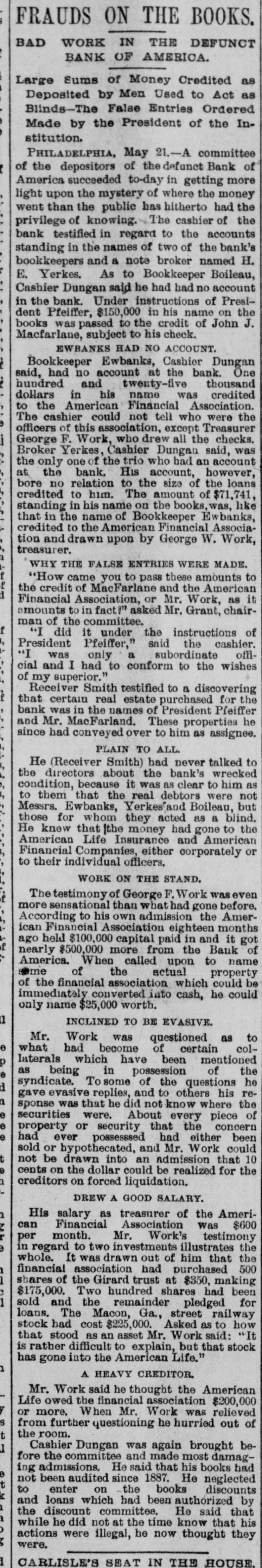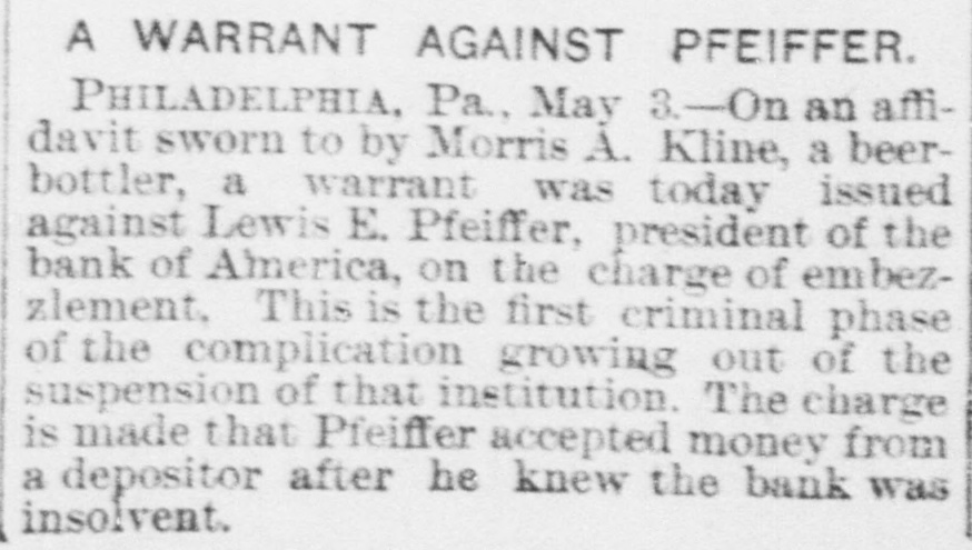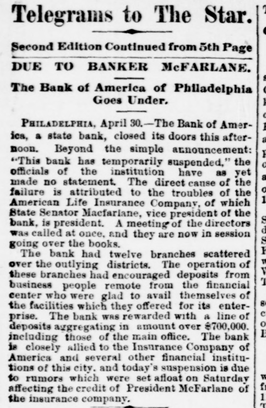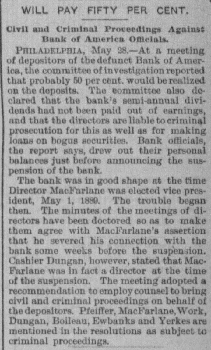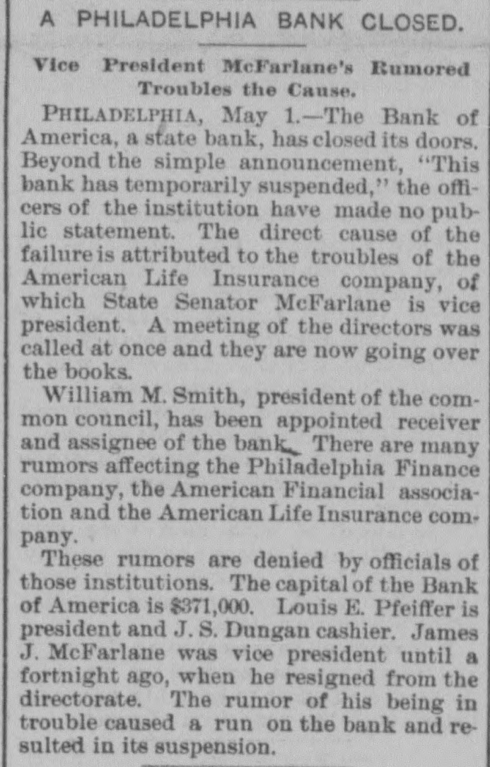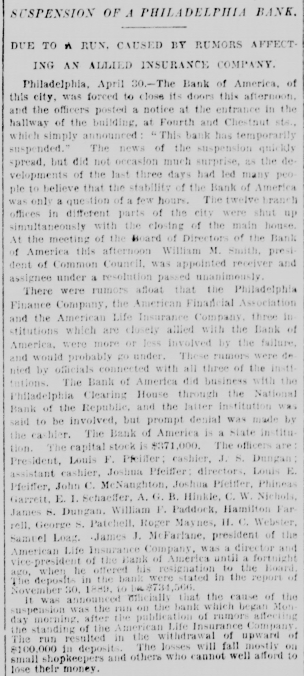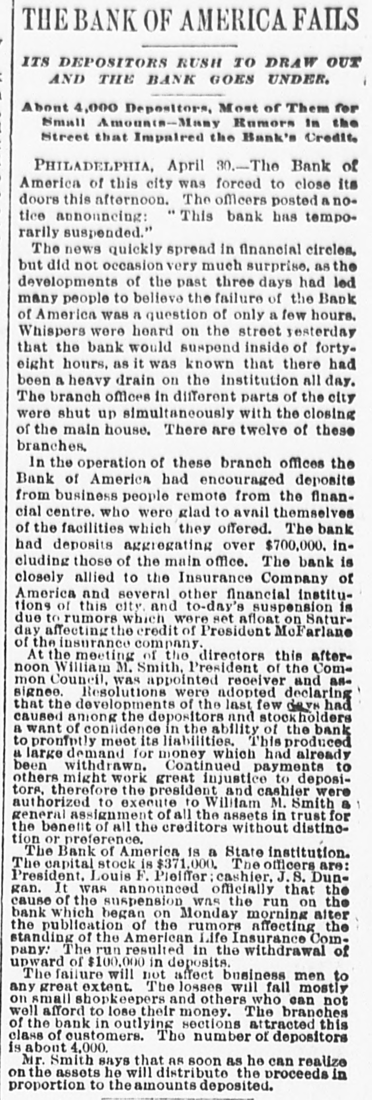 The Bank Failures. Elmer was the scene of quite a panic on Thursday last, caused by the reported unsoundness of the Elmer Bank, which was a branch of the Merchants' Bank, of Atlantic City. The excitement was started by an item in the Philadelphia Press in relation to the failure of the Bank of America, of that city, stating that the Merchants' Bank, of Atlantic, was a branch. Long before the hour of opening large numbers of anxious depositors gathered about the door, with their check and deposit books in hand. Manager Elwell's statement that the newspaper article was incorrect and that the Elmer Bank was a branch of the Merchants' Bank of Atlantic City and that neither the parent institution nor any of its branches were in any way connected with the Bank which had failed, fell as idle words upon men agitated by the fear of danger which seemed to threaten them, and for the first hour after the doors many deposits were reduced to the low water mark. At last the bottom was reached and before eleven o'clock Mr. Elwell had to admit that he had no more cash in the big safe; and finally, at a time when it required considerable courage to do so, a few firms, believers in the institution, began to make their regular daily deposits, with others waiting to take it out as fast as it came On Friday word was received that the parent bank at Atlantic City had suspended, when the rush for money was resumed with a desperation born of despair. The heavy run finally cleared the bank of all its cash, after which Cashier Elwell had to refuse all notes. A few of the many who have been caught in the crash are: Chas. S. Cotting Estate, $1,200; Rev. P. Corson, $800; Abram Cochran, $600; Jackson Clevenger, $400; Rufus W. Smith, $600; Daniel Watkins, $250; Samuel P. Baker, $220; Charles H. Morris, $268; Rev. J. G. Crate, $220; the Misses Long, $250; Thomas W. Brooks, $350. Among those whom are known have lost but have not been able to discover the amounts, are J. Frank Langley, Esq., George M. Bacon, Esq., Creamer Brothers, Drs. Woodruff and Cheesman, Chas. M. Surran, Wm. Strang, F. Wentzell & Bro., Samuel P. Foster, Hiram Nixon, A. M. Seabrook, S. Y. Townsend, R. T. Studimund, S. M. Vanmeter, Barber Collins, Jesse Garrison, Jesse Sordin, Thomas Edmonds, Samuel Christy, Aubery Reed, and a host of others. THE MULLICA HILL BRANCH. The Mullica Hill Bank, another branch of the Merchants', also closed its doors on Friday, caused by the suspension of the parent bank at Atlantic City. The suspension of the Bank of America in Philadelphia on Wednesday set in motion influences which bore too heavily on the branch and it was forced to yield to the stress. The management express the belief that the creditors will be paid dollar for dollar. The earnest hope is that the prediction will be fulfilled. The Mullica Hill branch of the Merchants' Bank at Atlantic City was organized April 30th, 1888. The directors elected at the last annual meeting were Charles W. Elkinton, Albert Parker, J. H. Mounce, William M. Colson, Robert McKeighan. Mr. Elkinton resigned the latter part of March. At the time of closing on Friday last, there was due depositors $16, 024.17; bills receivable, 716.91; cash on hand, $7.92. This paper, bills receivable, is first class. The depositors number 125, from 81 to $1000. William Bunning is the manager. He is a capable and painstaking official, and feels very sad over the misfortune to the bank. The depositors are not willing that the bank should continue. This Bank has done about one-third of the business, and at not more than one-third of the expense. Each director had taken $100 in stock, giving his note. Colson and McKeighan have paid theirs in cash. Among the business portion of the people, there is a feeling of insecurity about the matter, and while the losses, if any, may fall heavily upon some of the poorer classes, generally speaking, a majority will not be hurt very badly. Among the depositors are the following: Wm. Mankin, clerk, $175; John Yeager and wife, $200; Roger E. Costello, farmer, $300; Frye Hopkins, hotel keeper, $900; Amy Murphy, $100; John Garwood, $500; Edward Bunning, butcher, $40; Wm. H. Bunning, livery stable, $300; Jonathan Colson, farmer, $300; Wm. Colson, $300; Mrs. Debbie Smith, $300; Edward Ireland, conductor, $500; Jacob Ware, brakeman, $100; Mrs. Cornelia Thomas, $140; Mrs. Mary Huseback, $50; Rev. Dr. Brown and wife, $100; Rev. B. R. Black, $100; Mrs. With. Howery, $50; Jas. Ecret, $60; Chas.