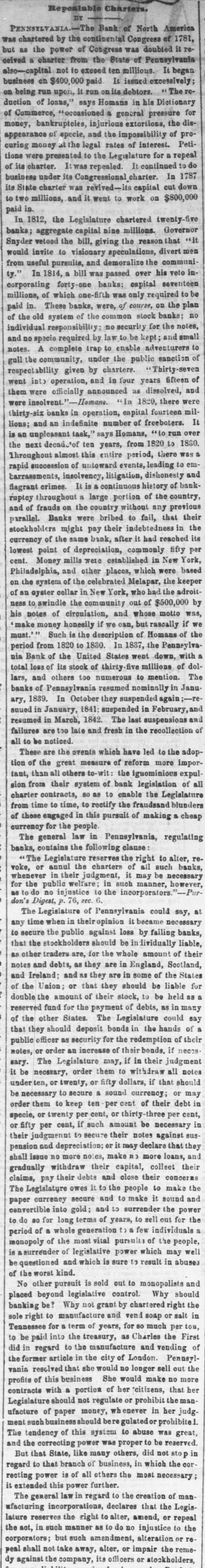 # Repeatable Charters. BY PENNSYLVANIA. The Bank of North America was chartered by the continental Congress of 1781, but as the power of Congress was doubted it received a charter from the State of Pennsylvania also-capital not to exceed ten millions. It began business on $400,000 paid. It issued excessively; on being run upon, it run on its debtors. "The reduction of loans," says Homans in his Dictionary of Commerce, "occasioned a general pressure for money, bankruptcies, injurious extortions, the disappearance of specie, and the impossibility of procuring money at the legal rates of interest. Petitions were presented to the Legislature for a repeal of its charter. It was repealed. It continued to do business under its Congressional charter. In 1787 its State charter was revived its capital cut down to two millions, and it went to work on $800,000 paid in. In 1812, the Legislature chartered twenty-five banks; aggregate capital nine millions. Governor Snyder vetoed the bill, giving the reason that "it would invite to visionary speculations, divert men from useful pursuits, and demoralize the community." In 1814, a bill was passed over his veto incorporating forty-one banks; capital seventeen millions, of which one-fifth was only required to be paid in. These banks, were, of course, on the plan of the old system of the common stock banks; no individual responsibility; no security for the notes, and no specie required by law to be kept; and small notes. A complete trap to enable adventurers to gull the community, under the public sanction of respectability given by charters. "Thirty-seven went into operation, and in four years fifteen of them were officially announced as dissolved, and were insolvent."-Homans. "In 1820, there were thirty-six banks in operation, capital fourteen millions; and an indefinite number of freeboters. It is an unpleasant task," says Homans, "to run over the next decad'of ten years, from 1820 to 1830. Throughout almost this entire period, there was a rapid succession of untoward events, leading to embarrassments, insolvency, litigation, dishonesty and flagrant crimes. It is a continuous history of bankruptcy throughout a large portion of the country, and of frauds on the country without any previous parallel. Banks were bribed to fail, that their stockholders might pay their indebtedness in the currency of the same bank, after it had reached its lowest point of depreciation, commonly fifty per cent. Money mills were established in New York, Philadelphia, and other places, which were based on the system of the celebrated Melapar, the keeper of an oyster cellar in New York, who had the adroitness to swindle the community out of $500,000 by his notes of circulation, and whose motto was, 'make money honesily if we can, but rascally if we must.'" Such is the description of Homans of the period from 1820 to 1830. In 1837, the Pennsylvania Bank of the United States went down, with a total loss of its stock of thirty-five millions of dollars, and others too numerous to mention. The banks of Pennsylvania resumed nominally in January, 1839. In October they suspended again;-re-suued in January, 1841; suspended in February, and resumed in March, 1842. The last suspensions and failures are too late and fresh in the recollection of all to be noticed. These are the events which have led to the adoption of the great measure of reform more important, than all others to-wit: the iguominious expulsion from their system of bank legislation of all charter contracts, so as to enable the Legislature from time to time, to rectify the fraudsand blunders of those engaged in this pursuit of making a cheap currency for the people. The general law in Pennsylvania, regulating banks, contains the following clause: "The Legislature reserves the right to alter, revoke, or annul the charters of all such banks, whenever in their judgment, it may be necessary for the public welfare; in such manner, however, as to do no injustice to the incorporators."-Purdon's Digest, p. 76, sec. 6. The Legislature of Pennsylvania could say, at any time when in their opinion it became necessary to secure the public against loss by failing banks, that the stockholders should be in lividually liable, as other traders are, for the whole amount of their notes and debts, as they are in England, Scotland, and Ireland; and as they are in some of the States "of the Union; or that they should be liable for double the amount of their stock, to be held as a reserved fund for the payment of debts, as in many of the other States. The Legislature could say that they should deposit bonds in the hands of a public officer as security for the redemption of their notes, or order an increase of their bonds, if necessary. The Legislature may, if in their judgment it be necssary, order them to withdraw all notes under ten, or twenty, or fifty dollars, if that should be necessary to secure a sound currency; or may order them to keep ten per cent of their debt in specie, or twenty per cent, or thirty-three per cent, or fifty per cent, if such amount be necessary in their judgmennt to secure their notes against suspension and depreciation; or it may declare that they shall issue no more noles, make no more loans, and gradually withdraw their capital, colleet their claims, pay their debts and close their concerns The Legislature owes it to the people to make the paper currency secure and to make it sound and convertible into gold; and to surrender the power to do so for long terms of years, to sell out for the period of a whole generation to a few individuals a monopoly of the most vital pursuits of the people, is a surrender of legislative power which may well be questioned and which is sure to result in abuses of the worst kind. No other pursuit is sold out to monopolists and placed beyond legislative control. Why should banking be? Why not grant by chartered right the sole right to manufacture and vend soap or salt in Tennessee for a term 